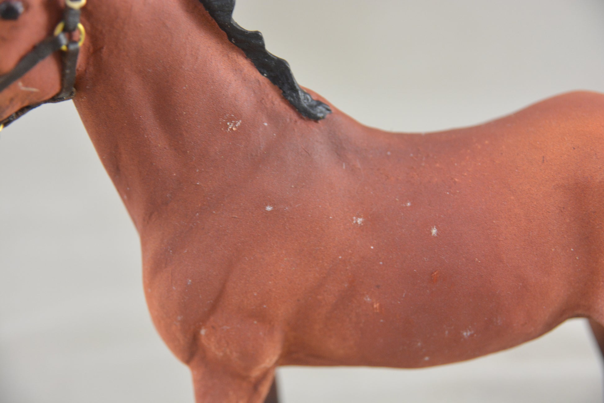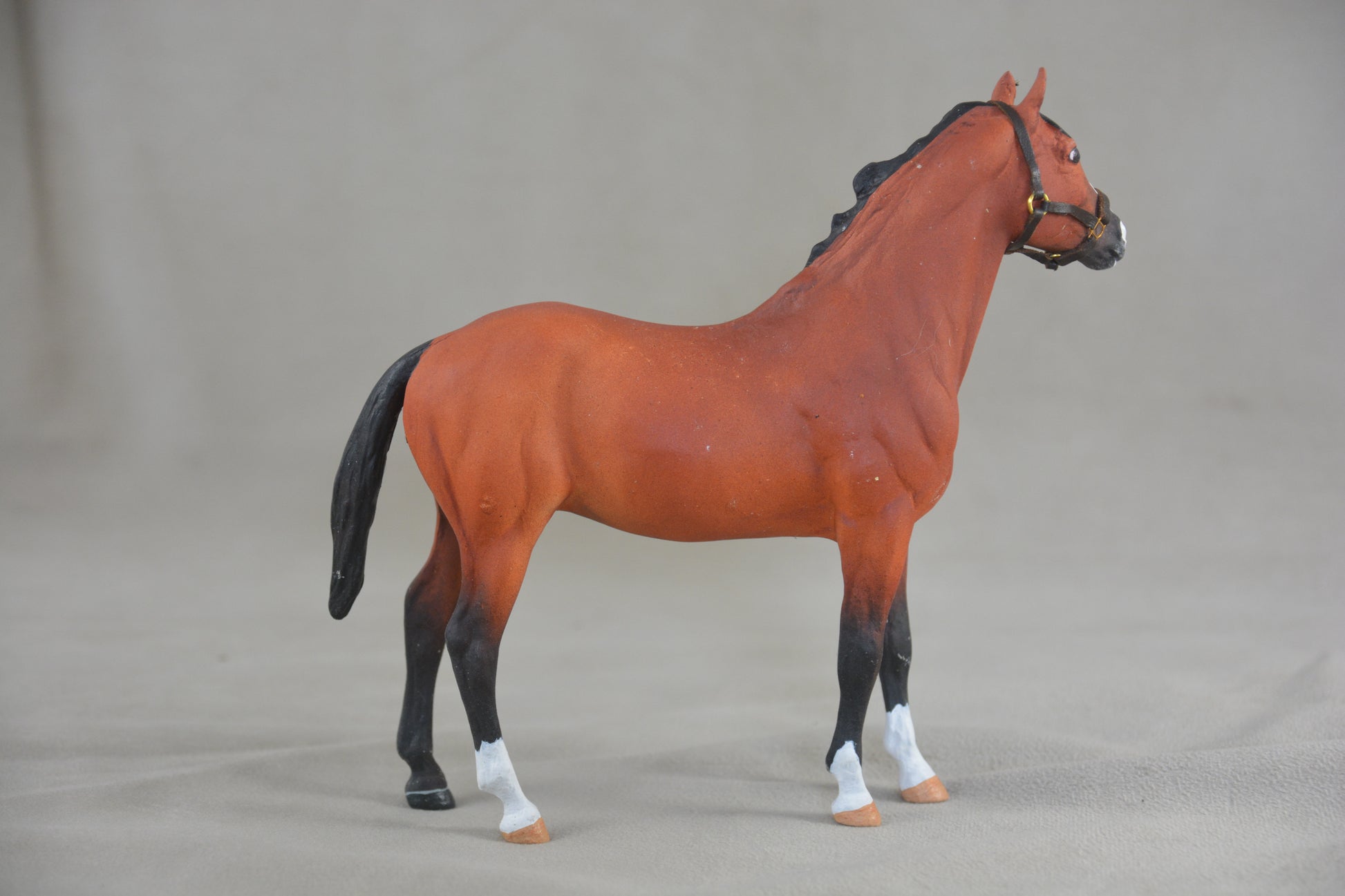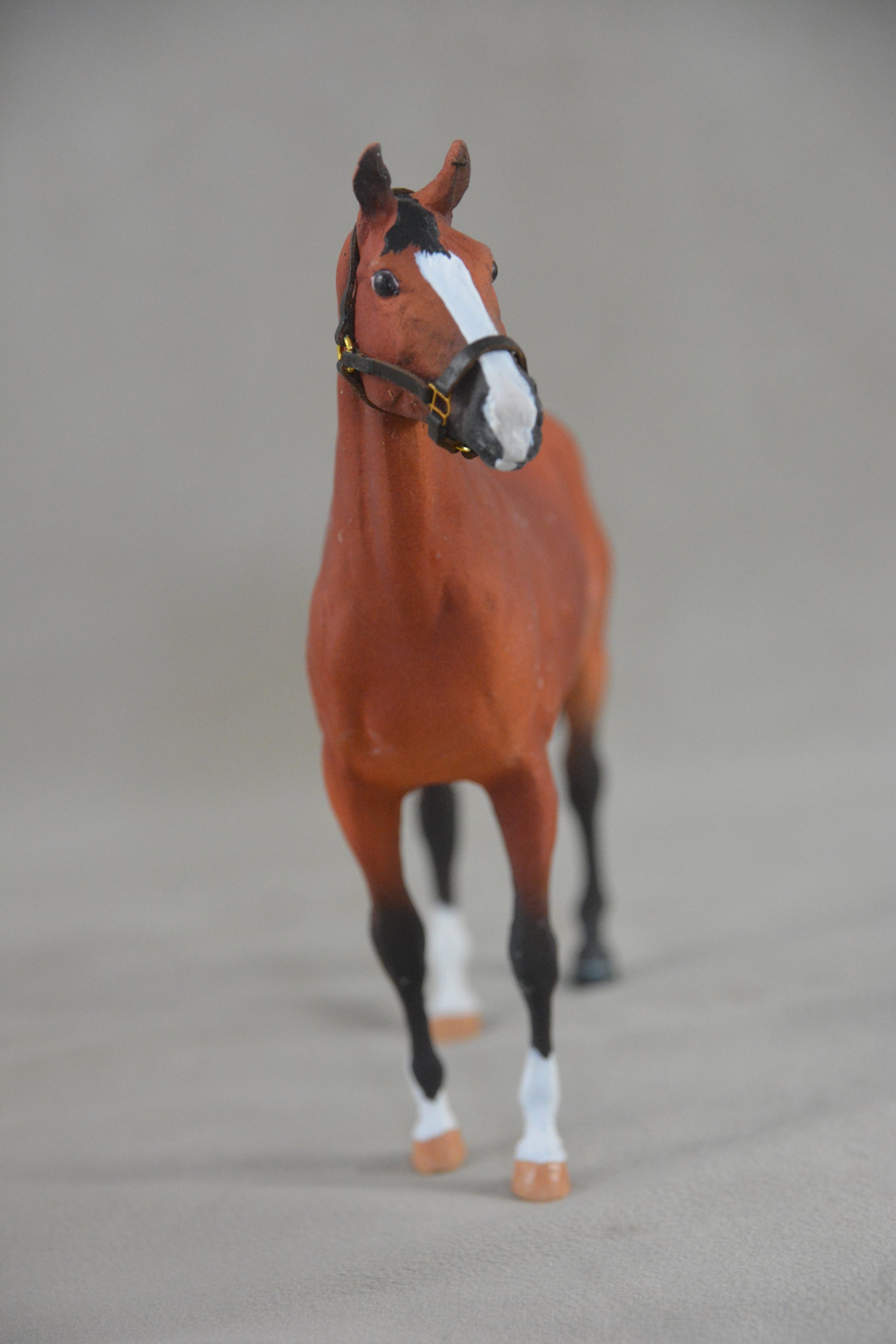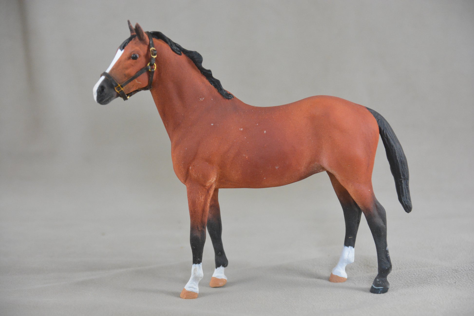 This is the Breyer Classic Duchess that has been customised to a light bay with white markings. She is body quality and has several rubs but these could be touched up. She comes with a custom made leather headcollar that you can see in the pictures.