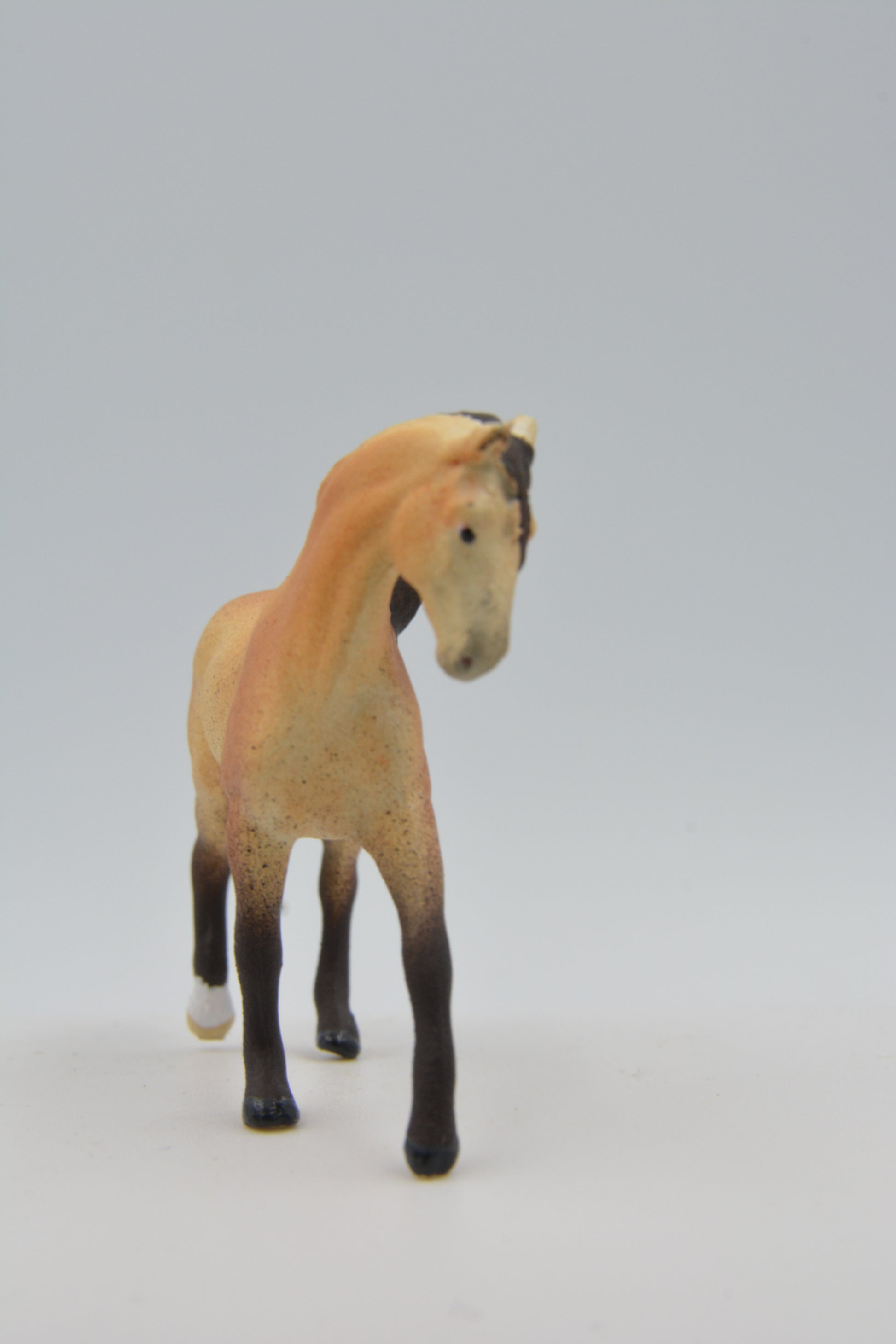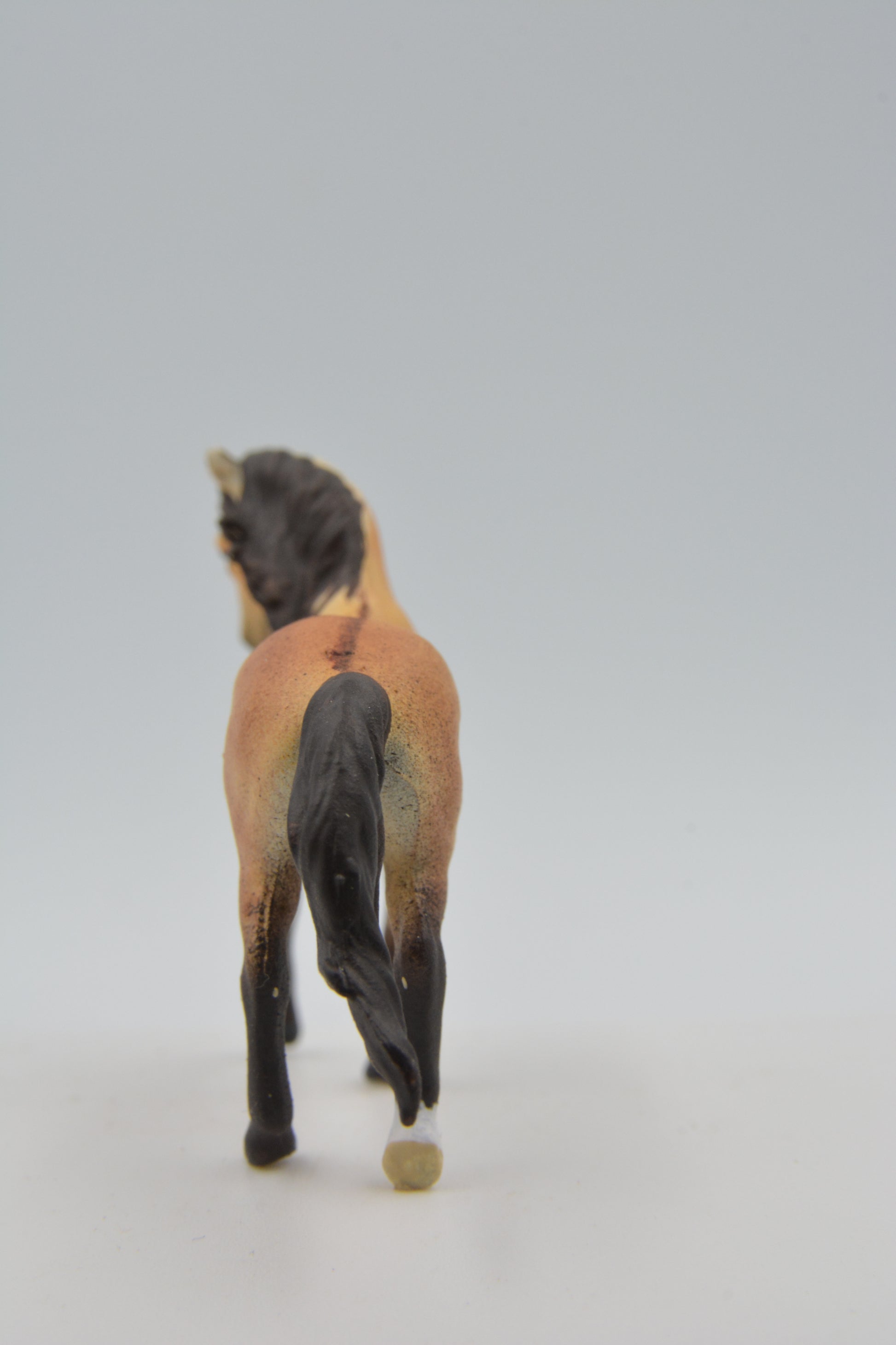 He is Miniature (1:64 scale) and was painted by Catriona Harris of Chestnut Ridge. He is signed on his belly and has his eyes, nostrils, edge of lips and hooves glossed. He is sealed to protect his finish.