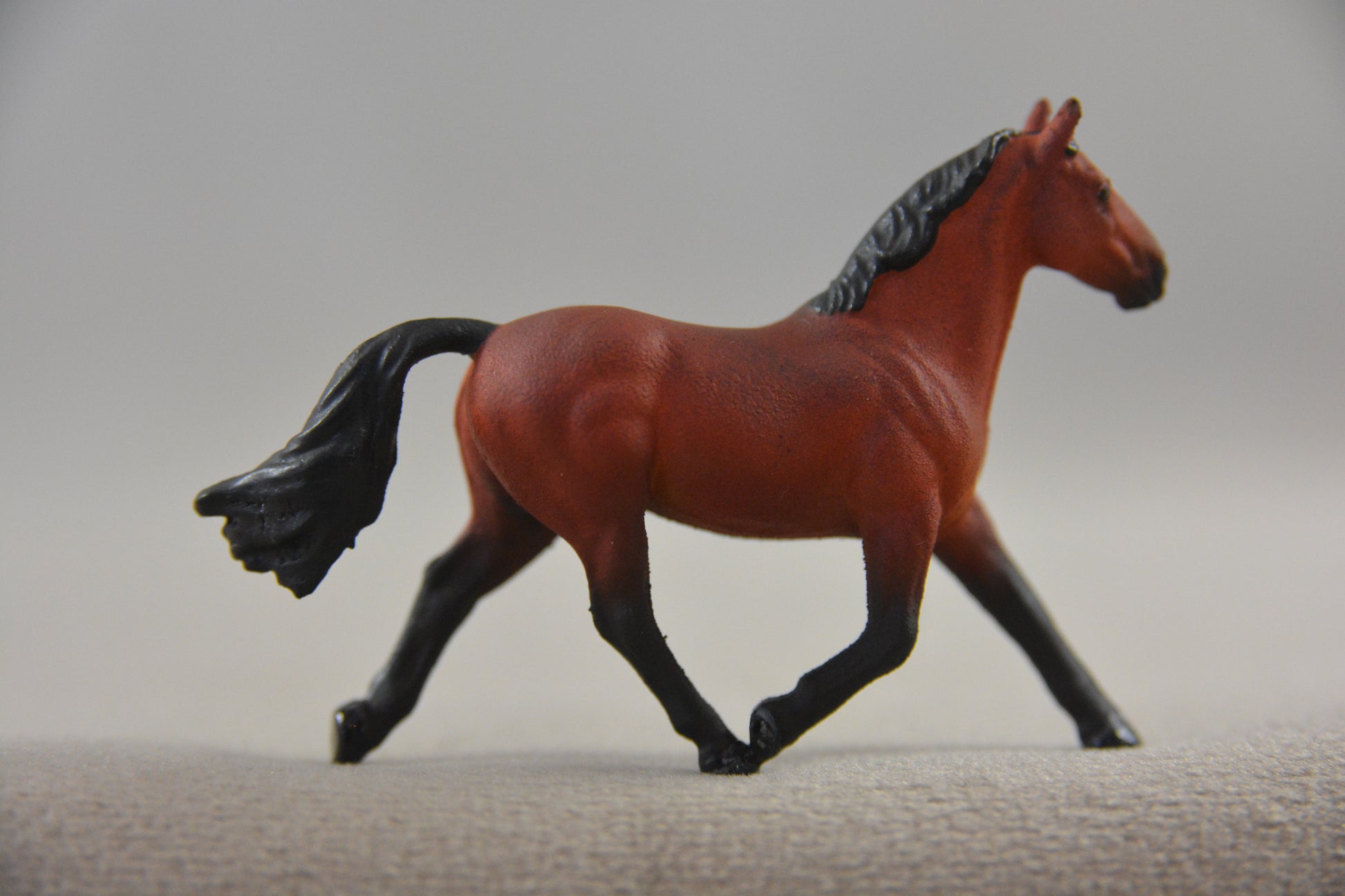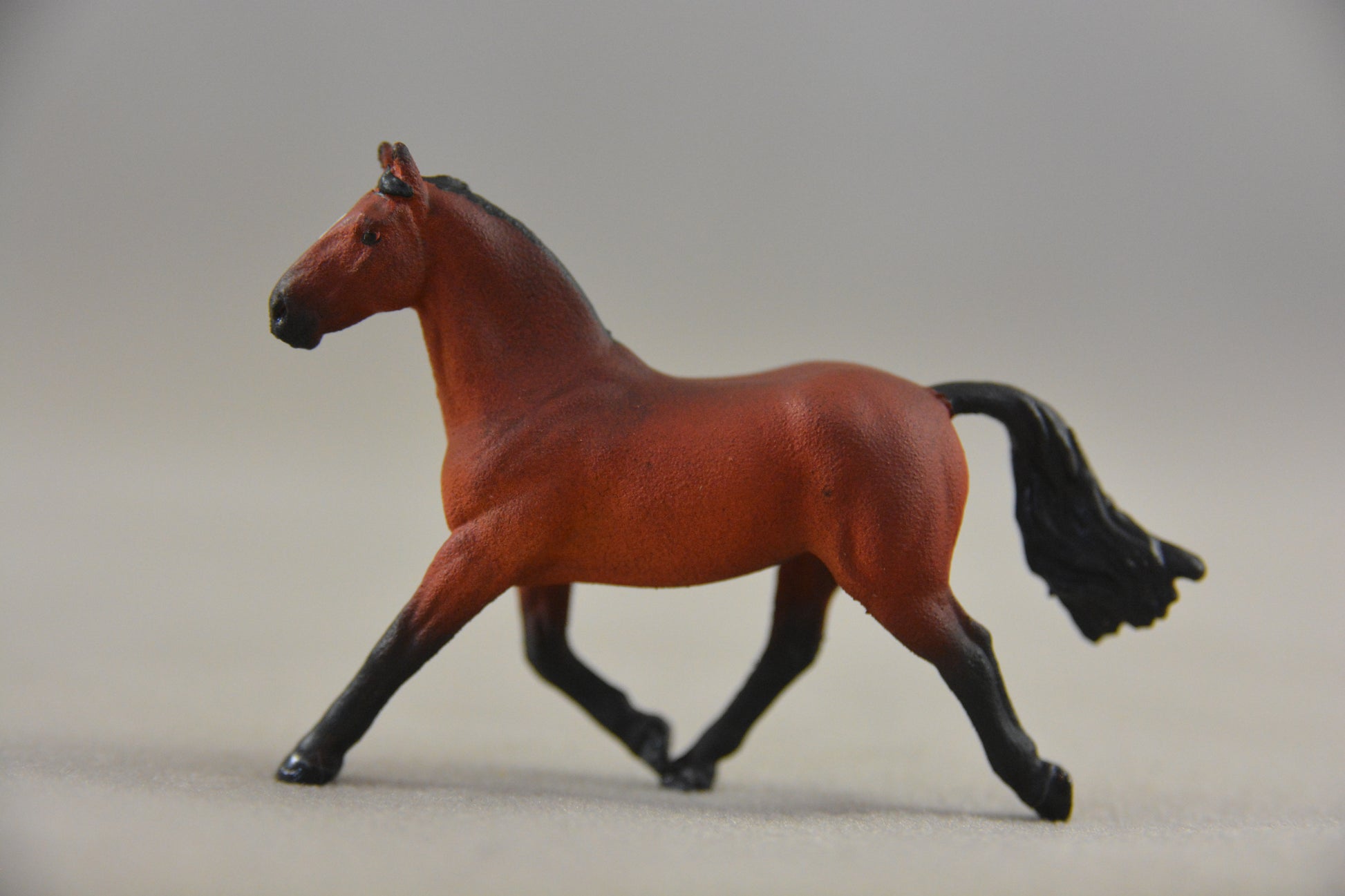 He is Miniature (1:64 scale) and was painted by Catriona Harris of Chestnut Ridge. He is signed on his belly and has his eyes, nostrils, edge of lips and hooves glossed. He is sealed to protect his finish.