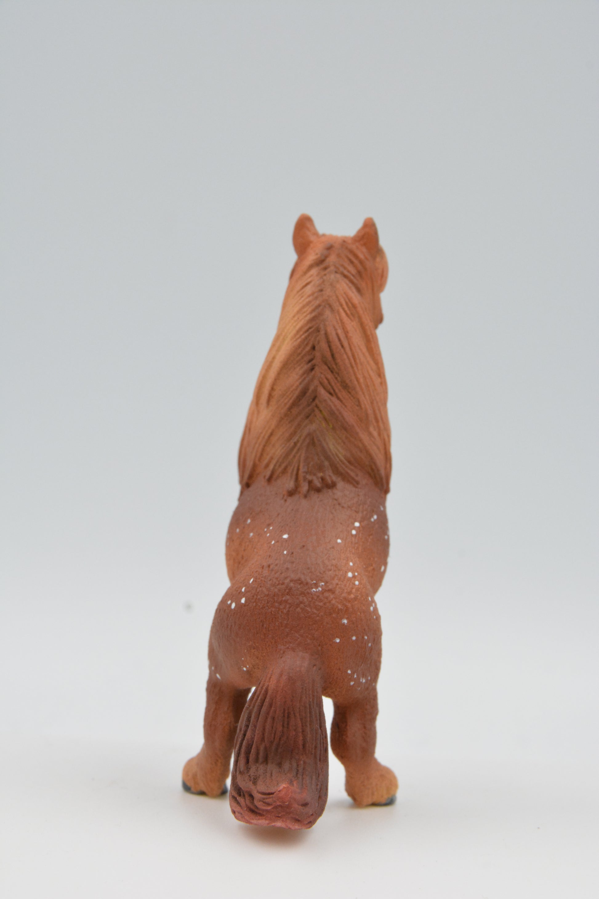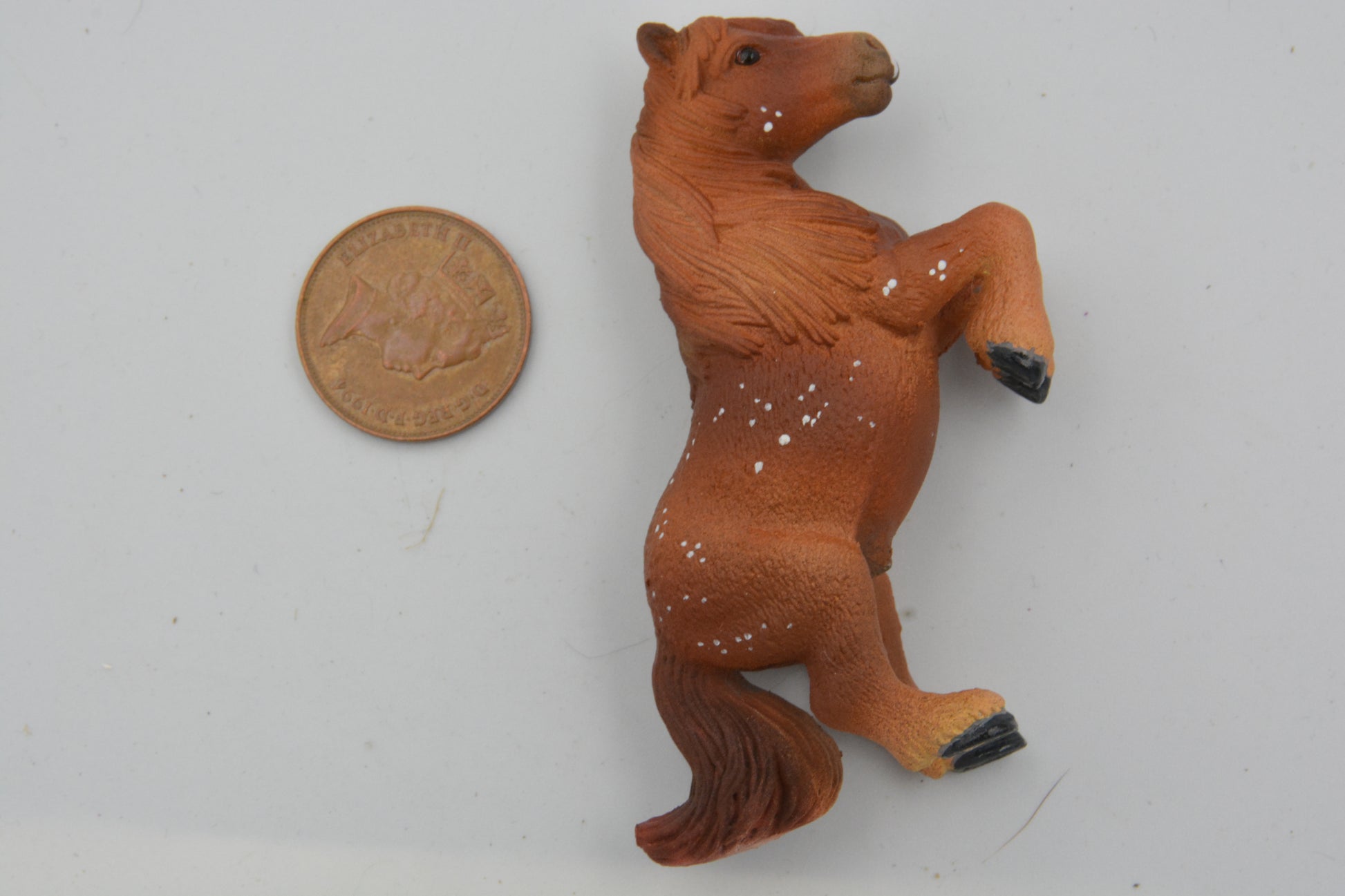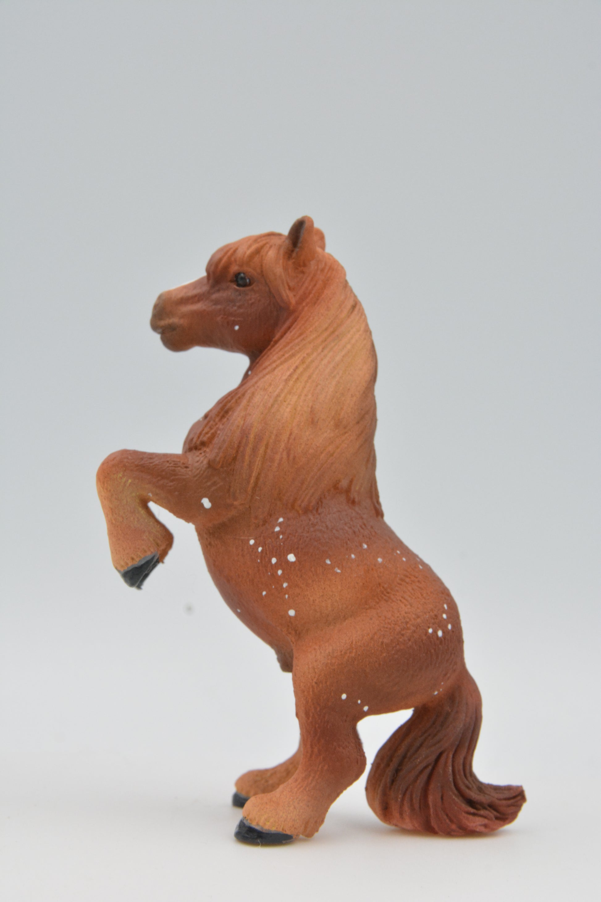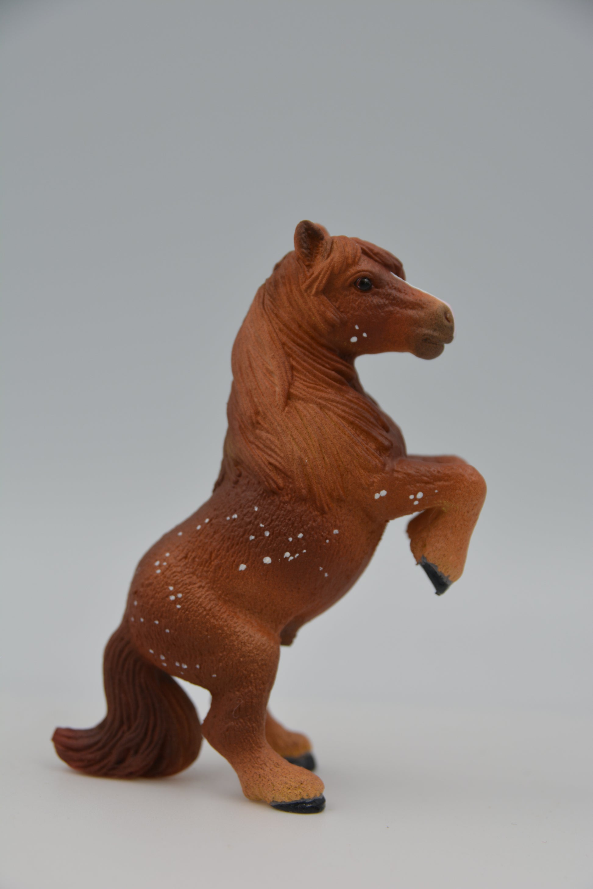 This is a beautiful custom Schleich Mini Shetty Stallion. This adorable little rearing pony has been painted to a dark chestnut with birdcatcher spots. He has a cute little pose with a white stripe.