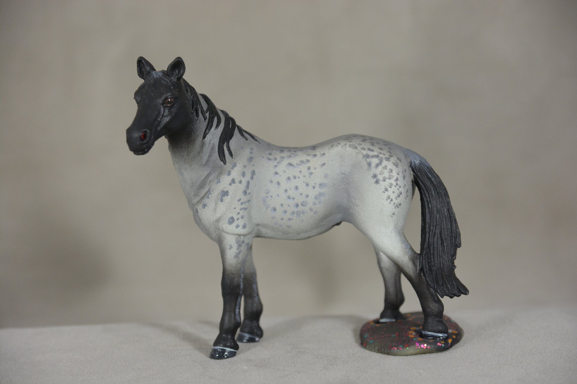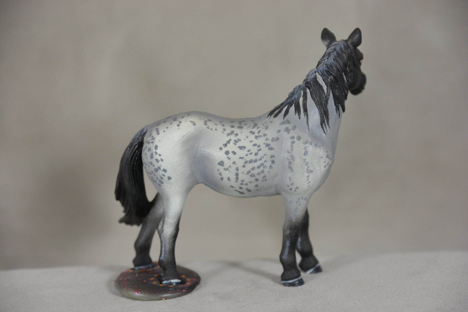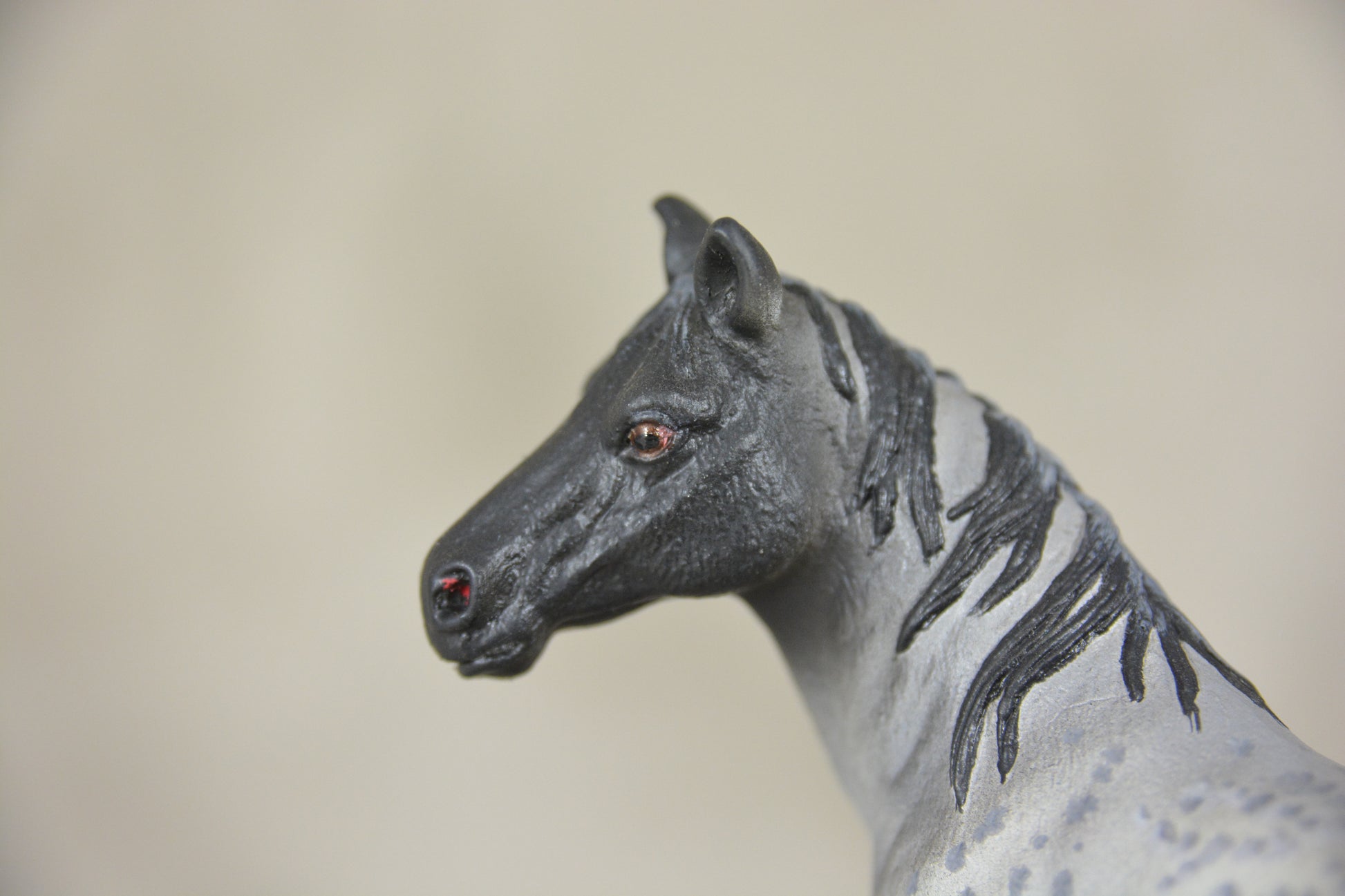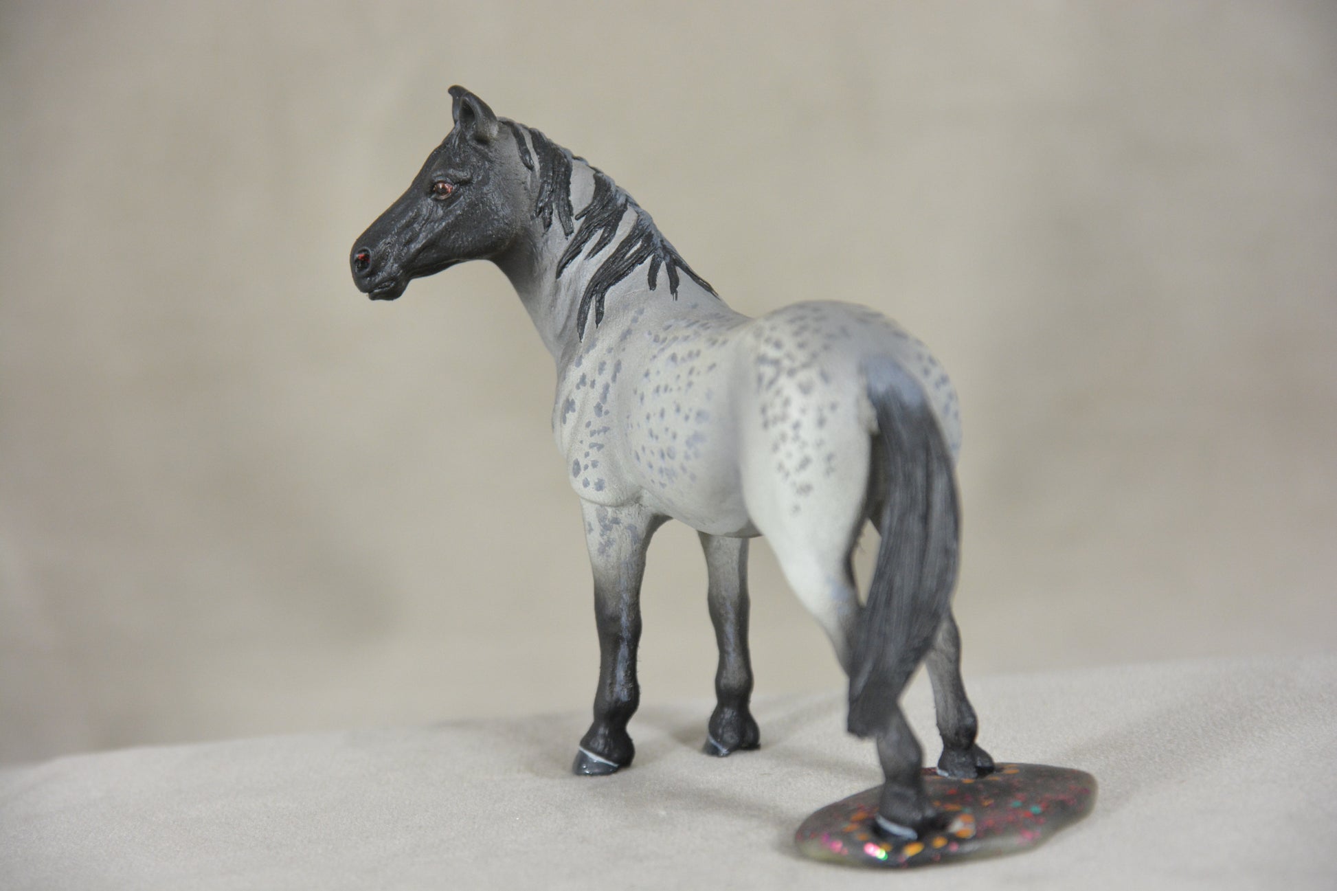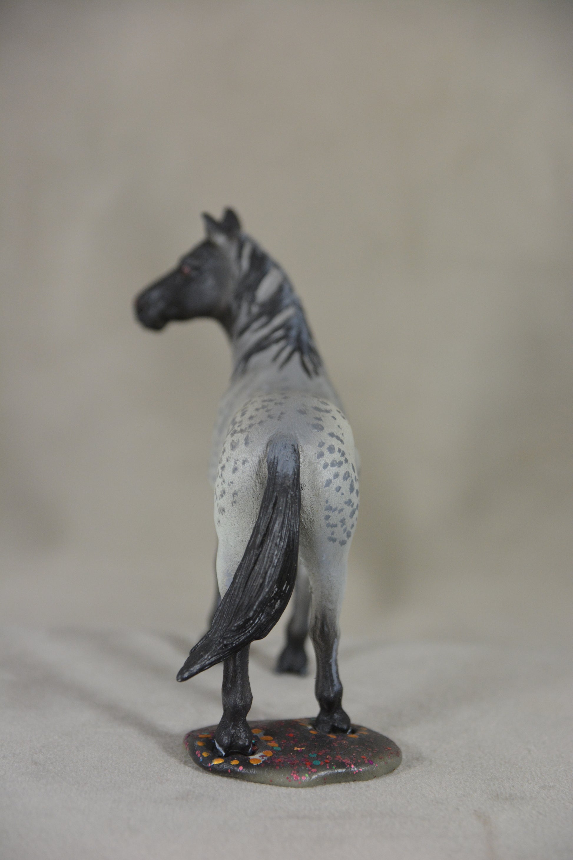 This lovely model has an added epoxy base (not removable) to stabilise back legs that were very warped! This means that she now stands perfectly with gorgeous square legs. She has been painted to a beautiful dark blue roan with reverse dapples.