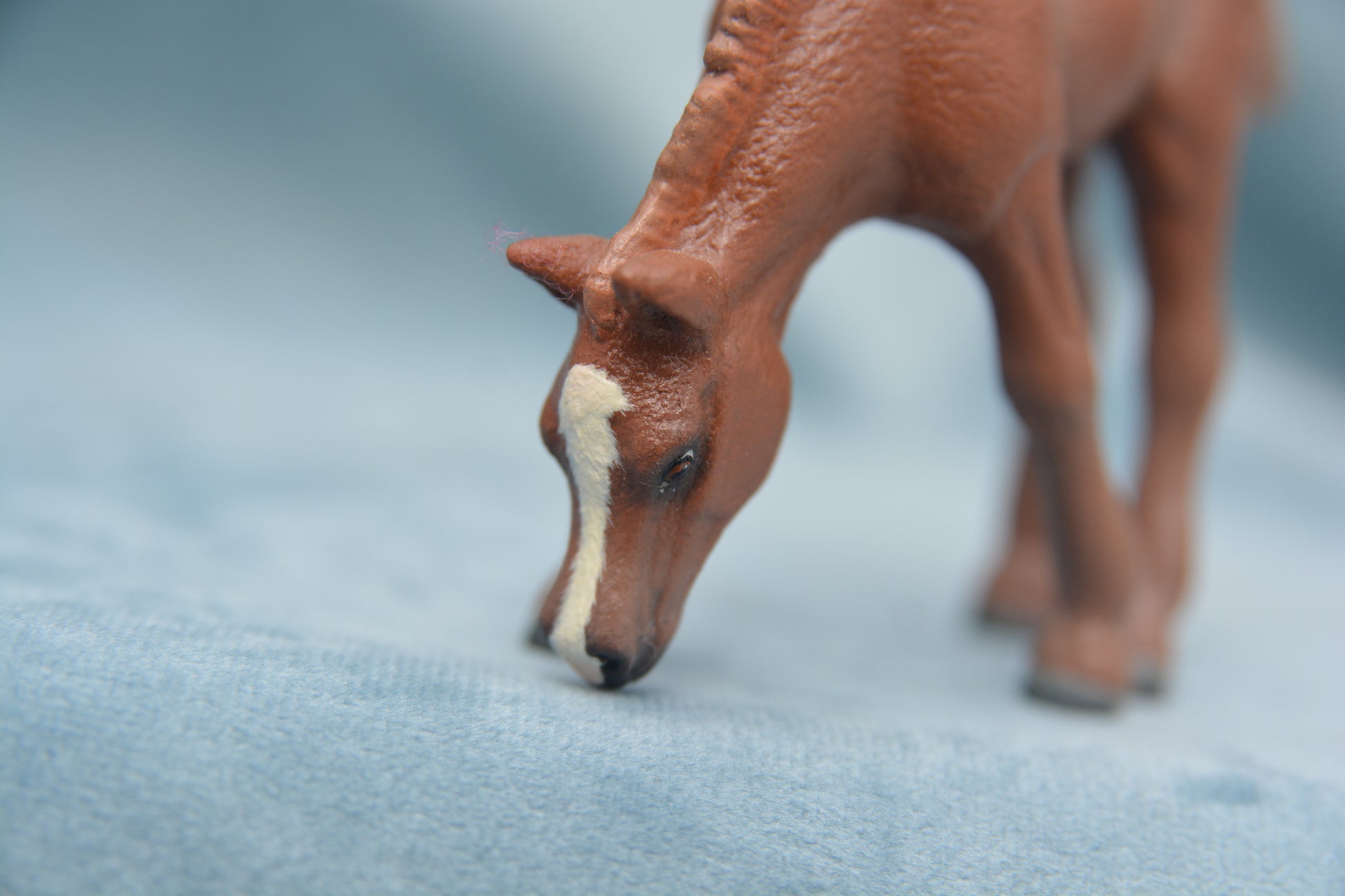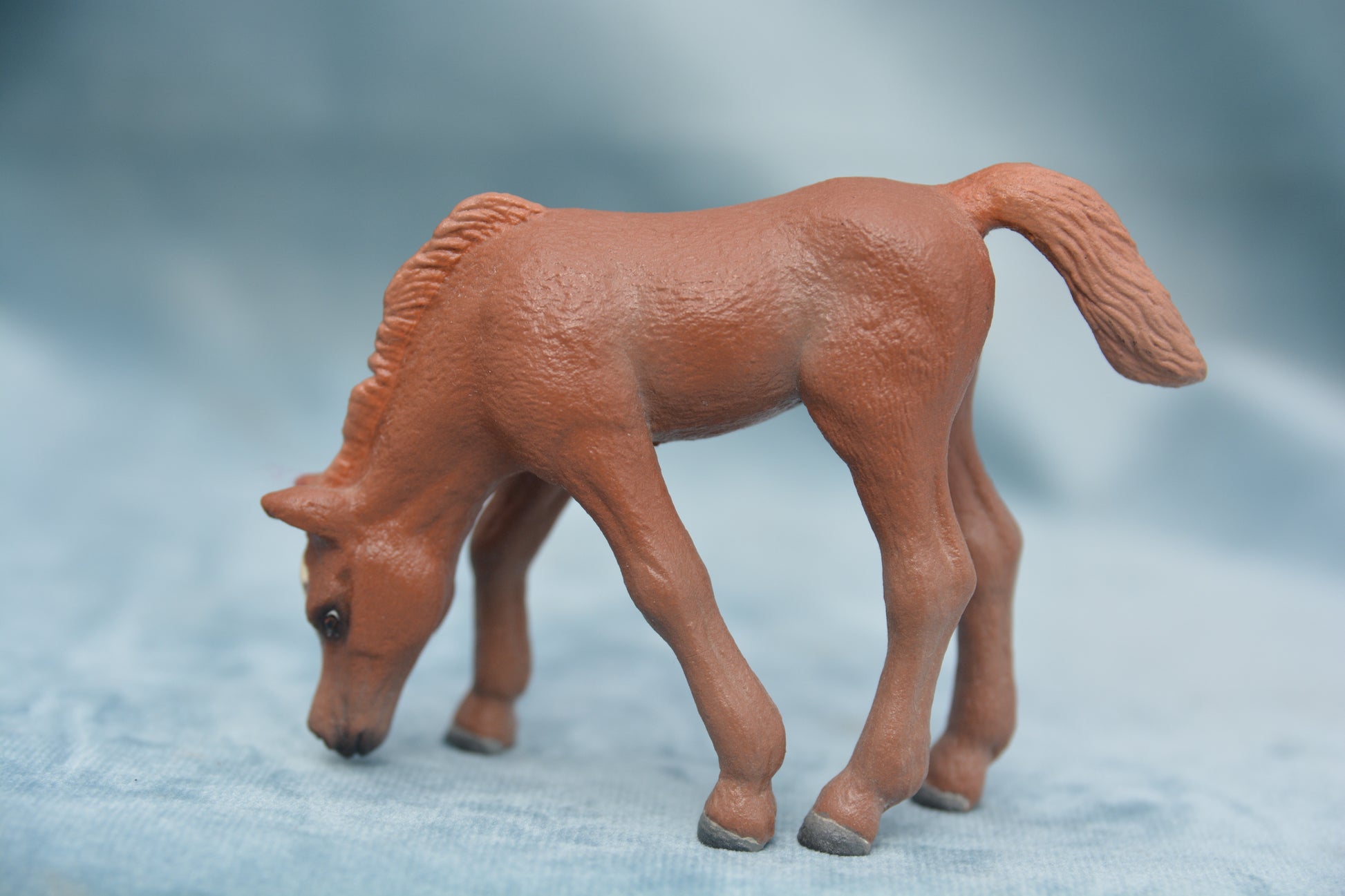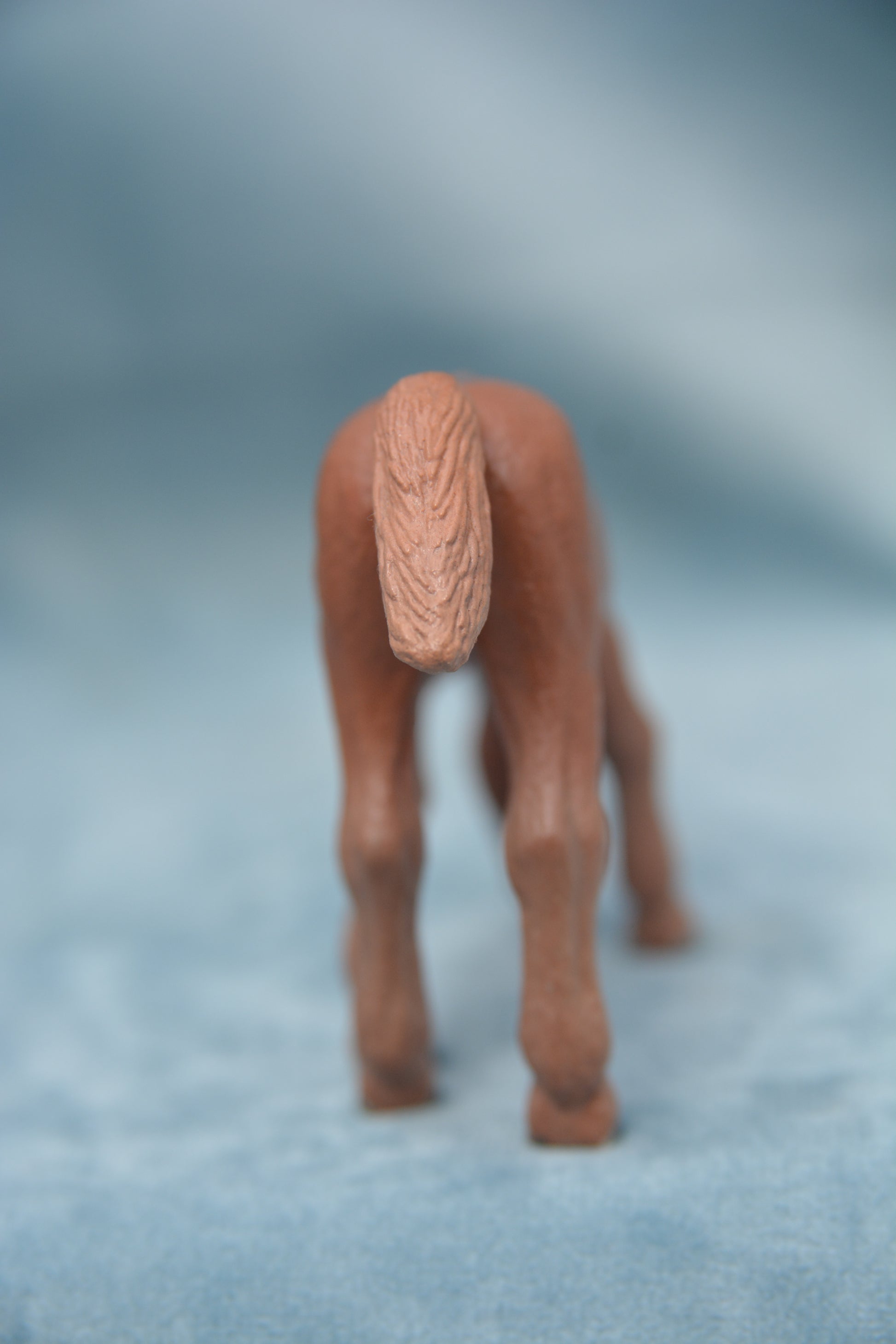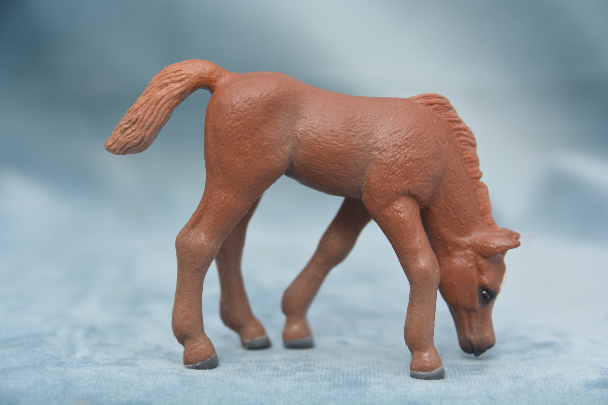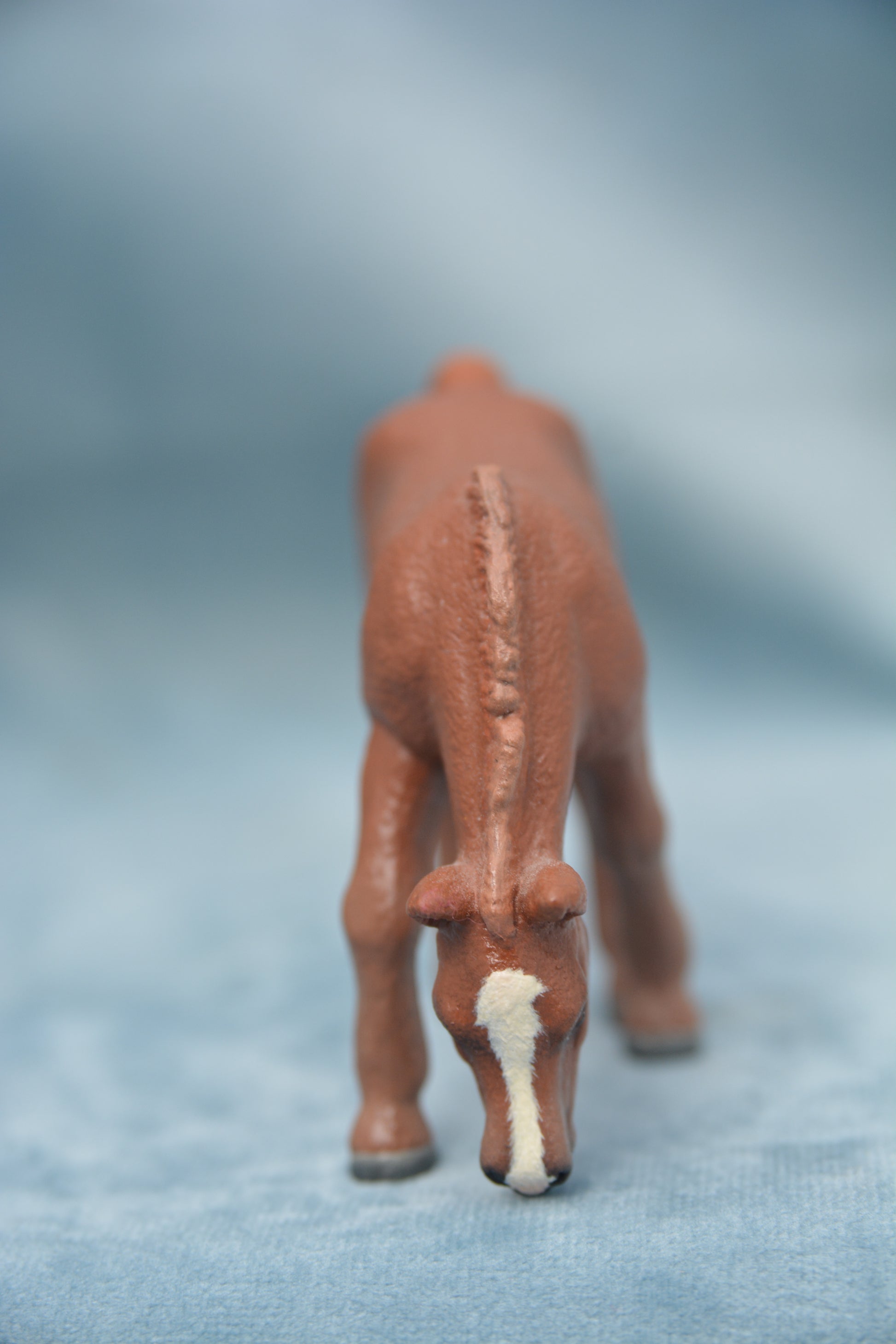 This is a Paddock Pal scale model horse. This is a custom Schleich Arabian Foal. This model has been painted to a lovely rich chestnut with white markings. Painted on the Schleich Arabian Foal Grazing mould.