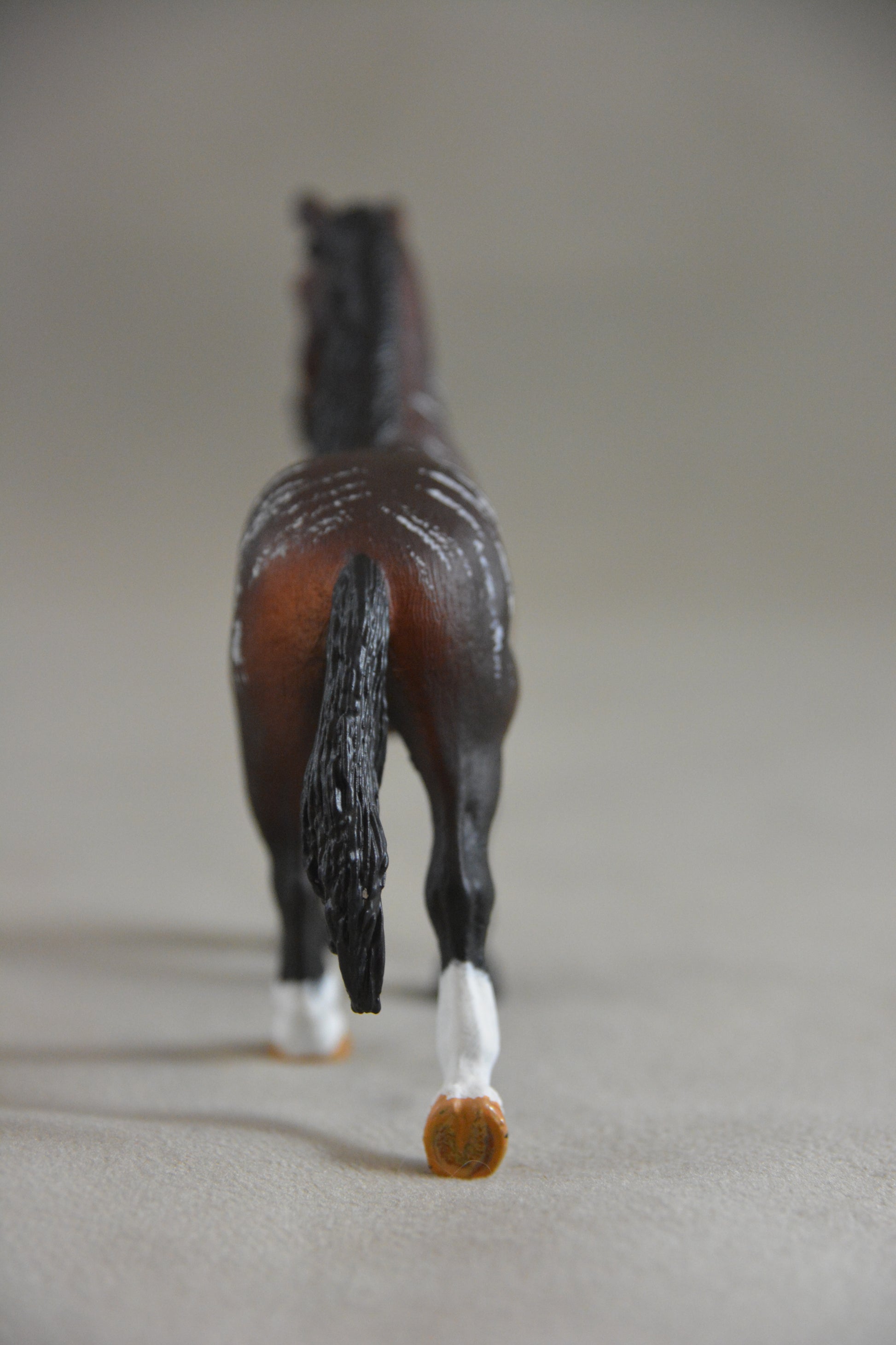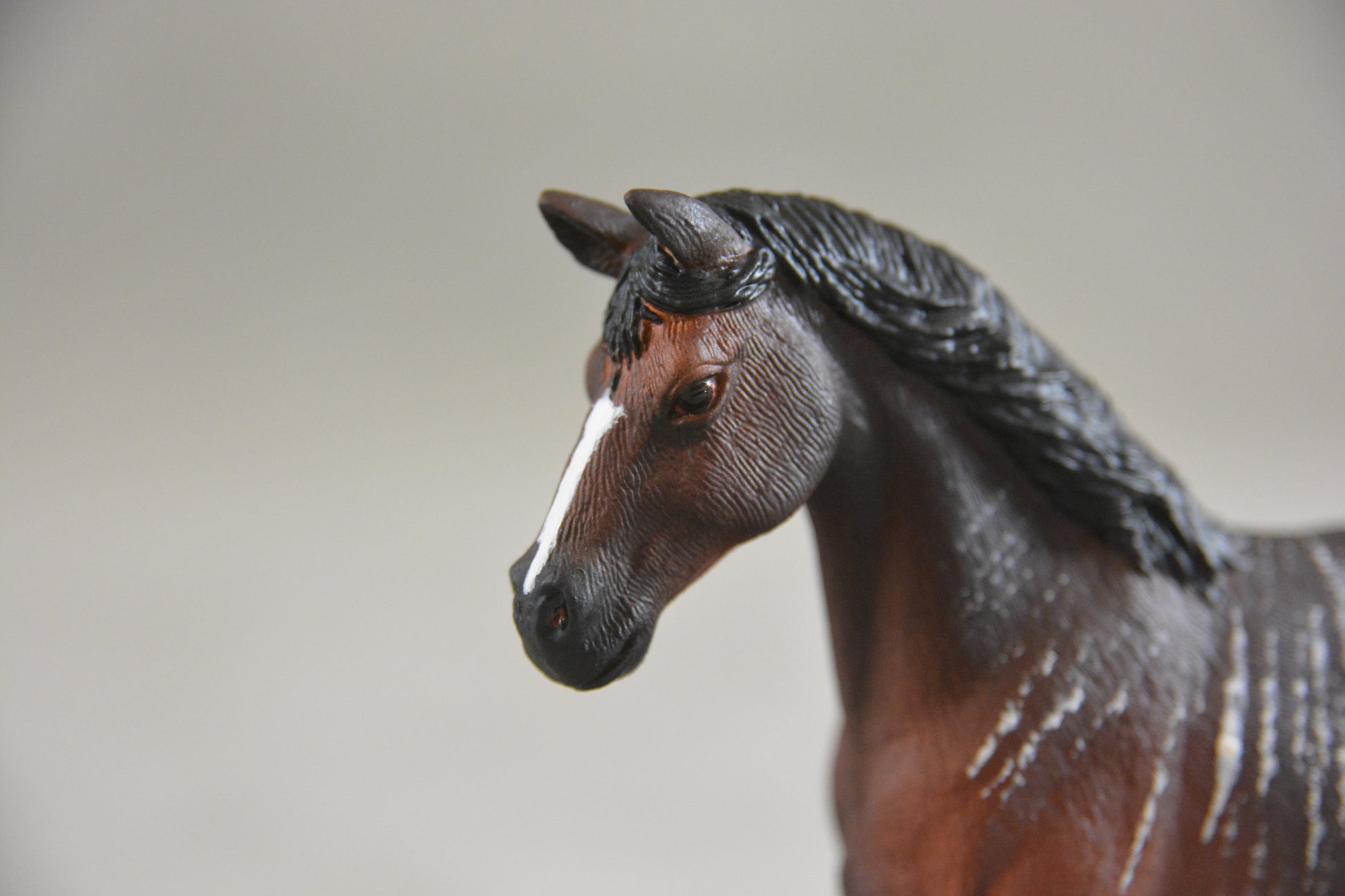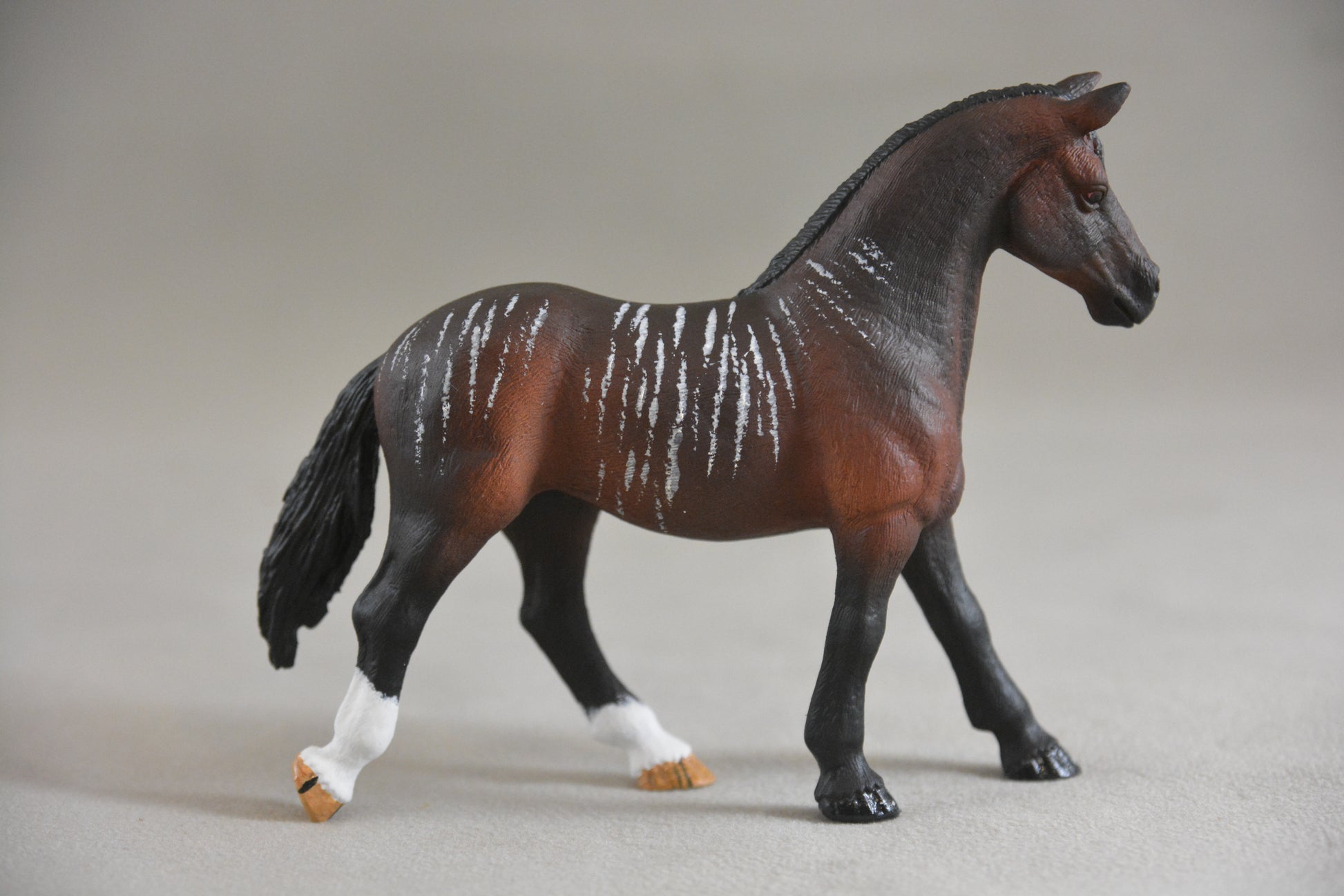 The model has been painted to a rich and well shaded bay. She has then had brindle markings added along with two white socks and a white stripe. She is painted in airbrushed acrylics with shading done in locally sourced ochre pigment. Her details have been hand finished in acrylic paint and pencil.