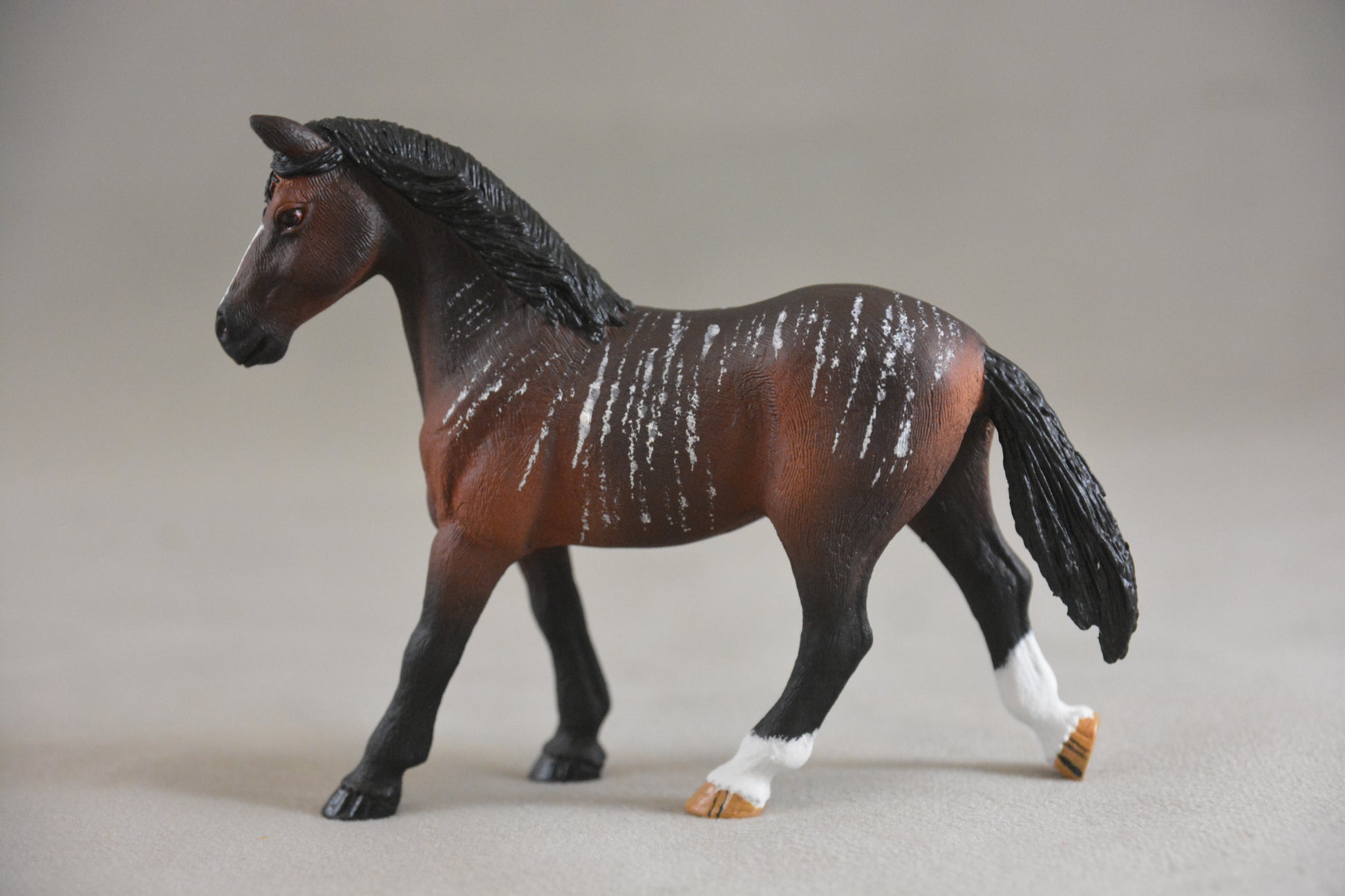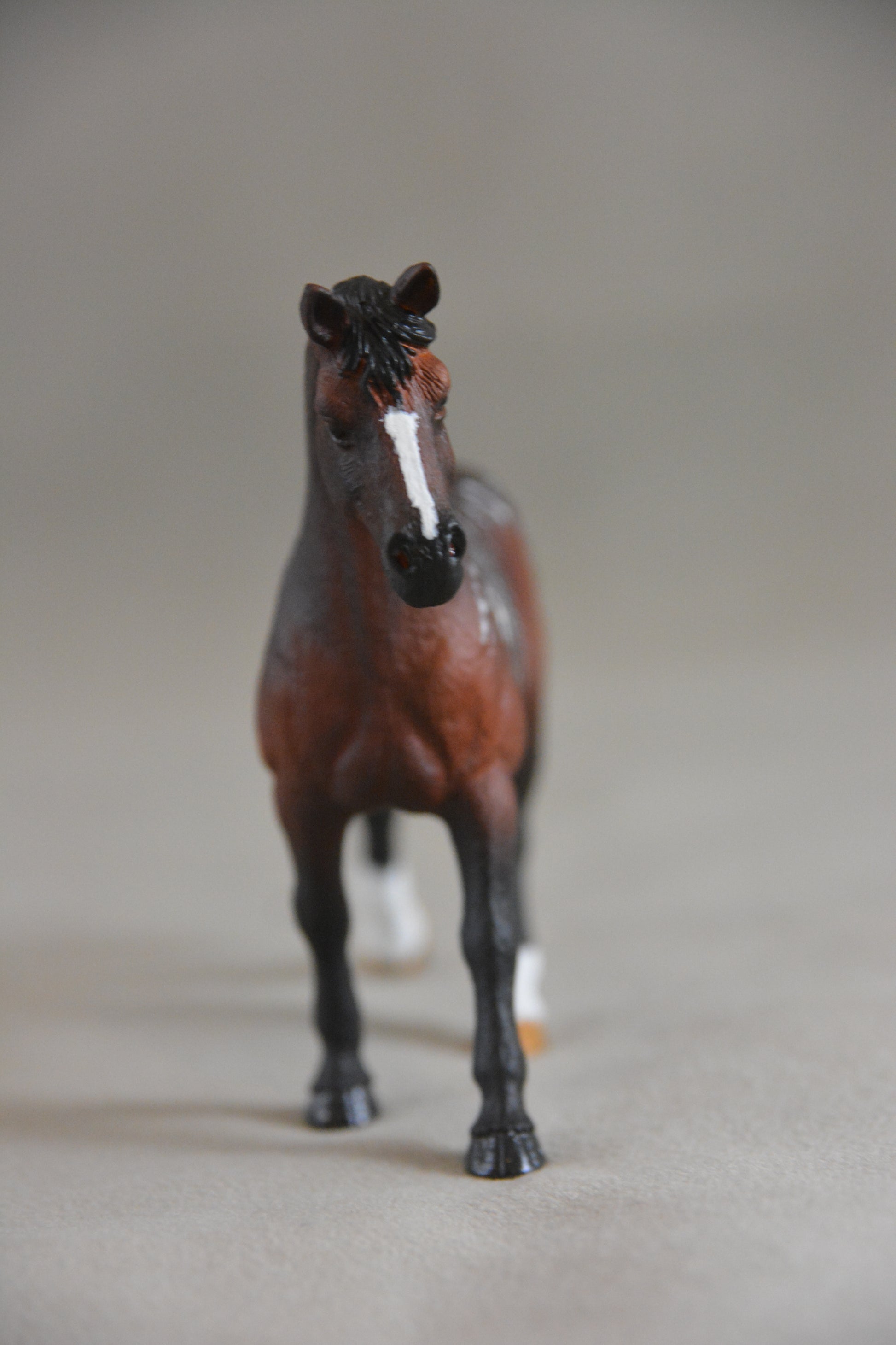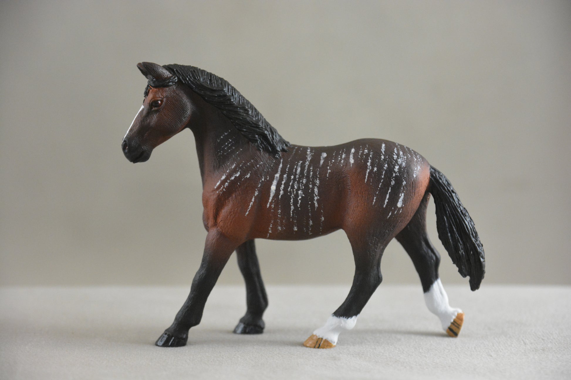 The model has been painted to a rich and well shaded bay. She has then had brindle markings added along with two white socks and a white stripe. She is painted in airbrushed acrylics with shading done in locally sourced ochre pigment. Her details have been hand finished in acrylic paint and pencil.