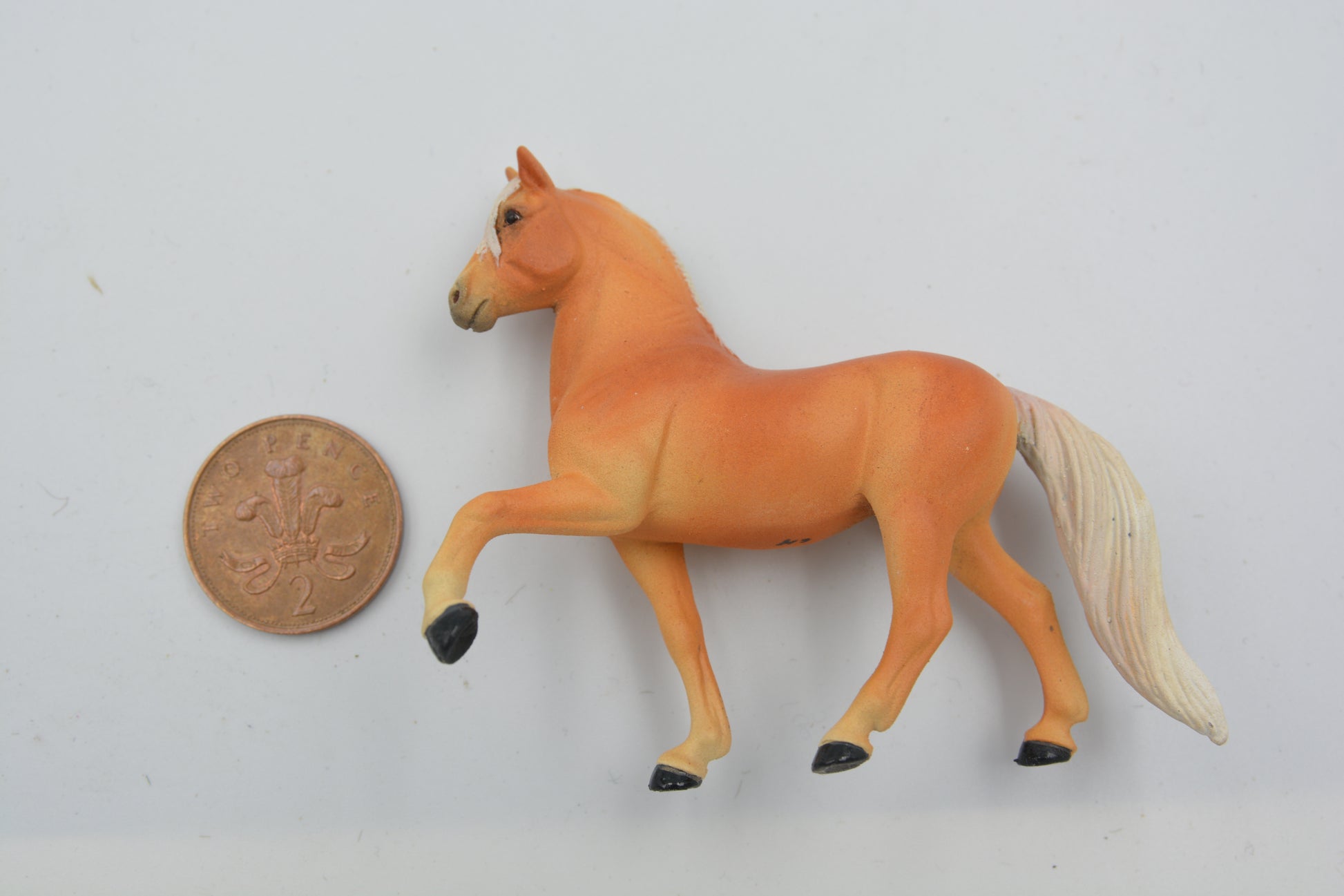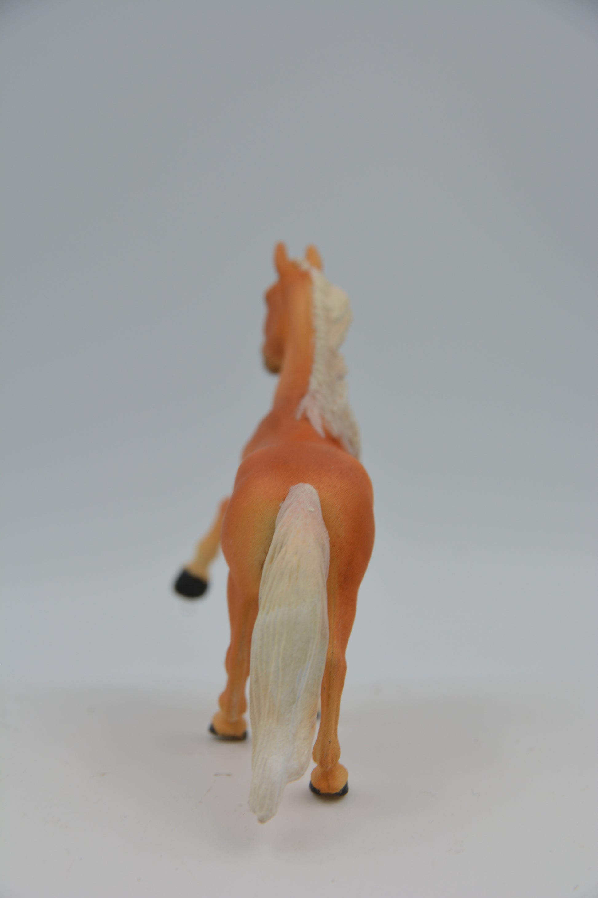 This lovely model horse has been painted to a rich chestnut with a flaxen mane and tail. He has no white markings and detailed shading, with a few subtle dapples.