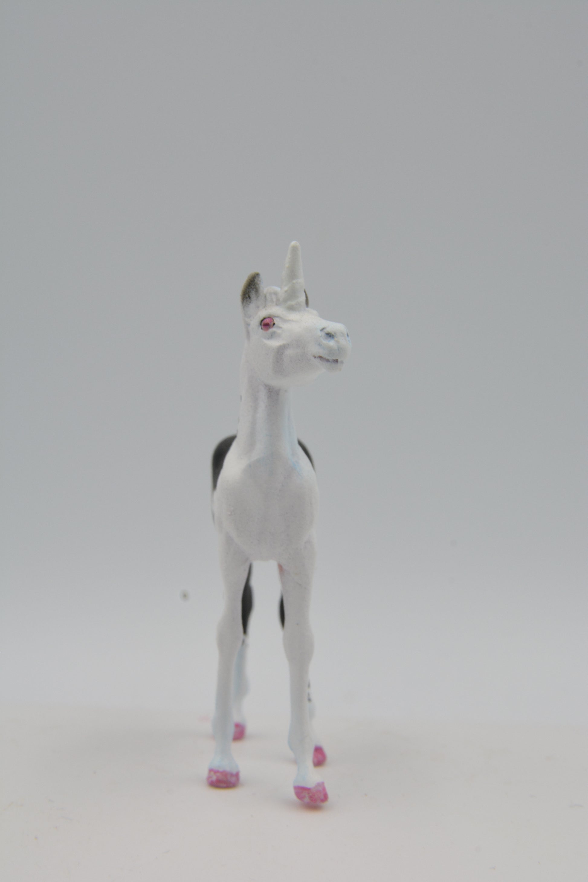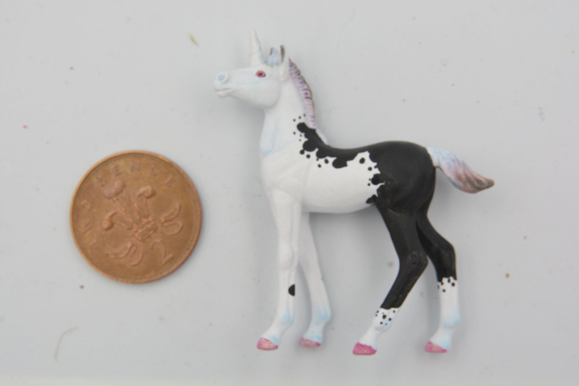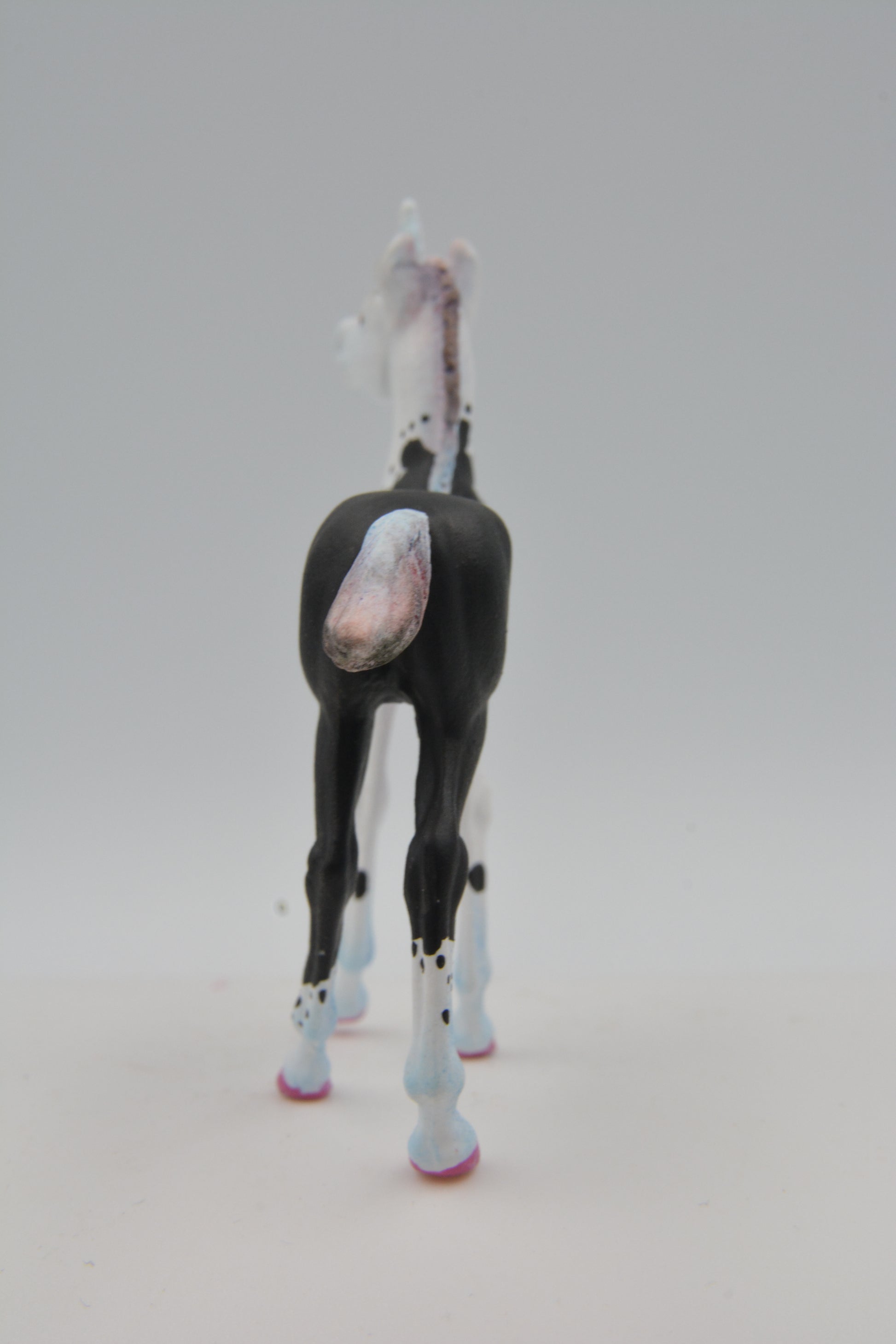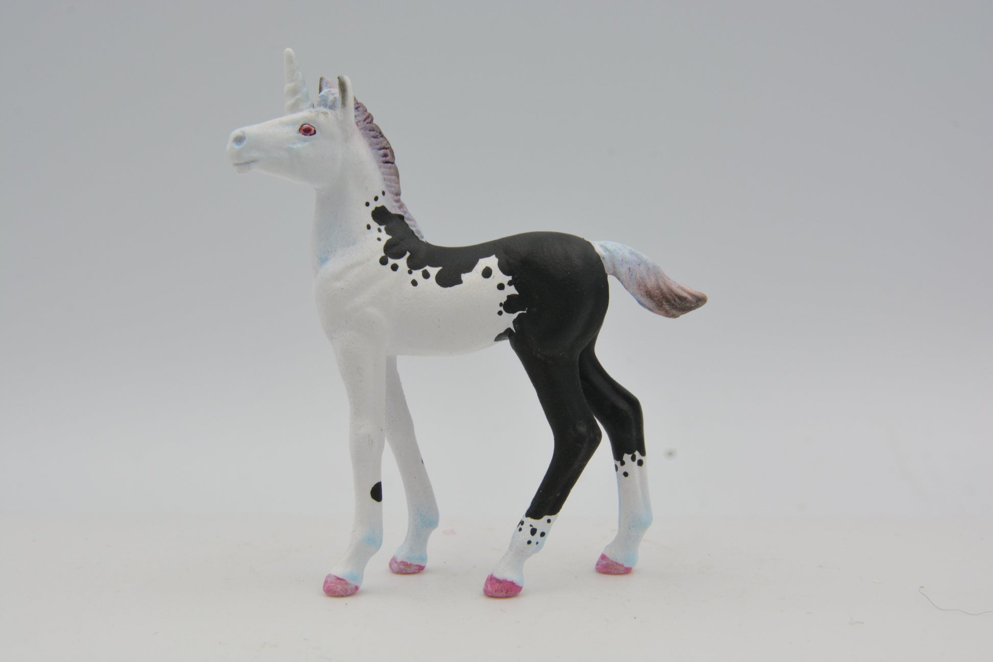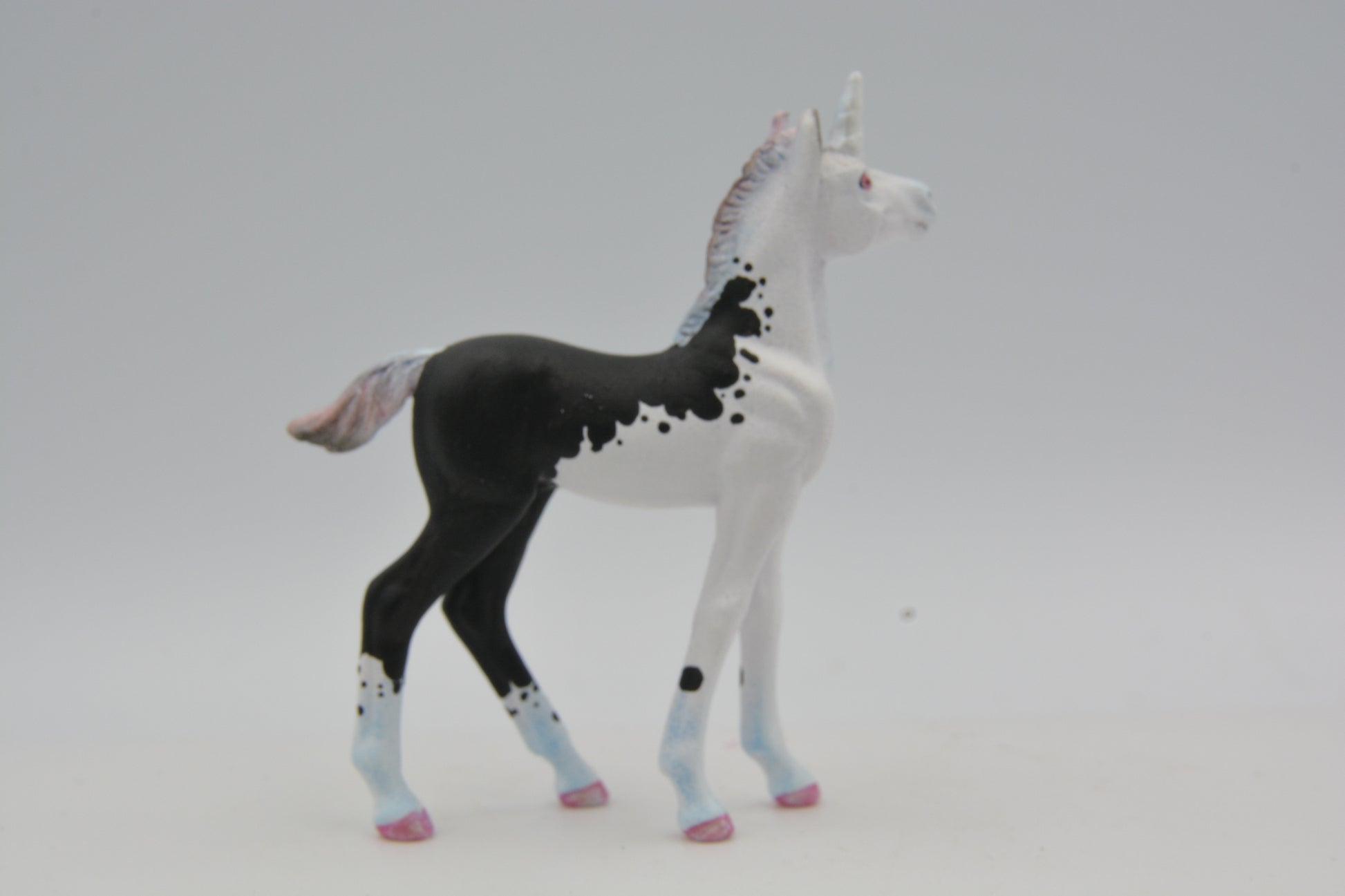 This is a custom Breyer Stablemate G3 Standing Foal (Unicorn variation). He has been painted to a unique decorator with a black reverse blanket type pattern and pink, purple and blue shading. He has pink hooves and pink and purple eyes. He has colour shift shimmer added to his horn and hooves.