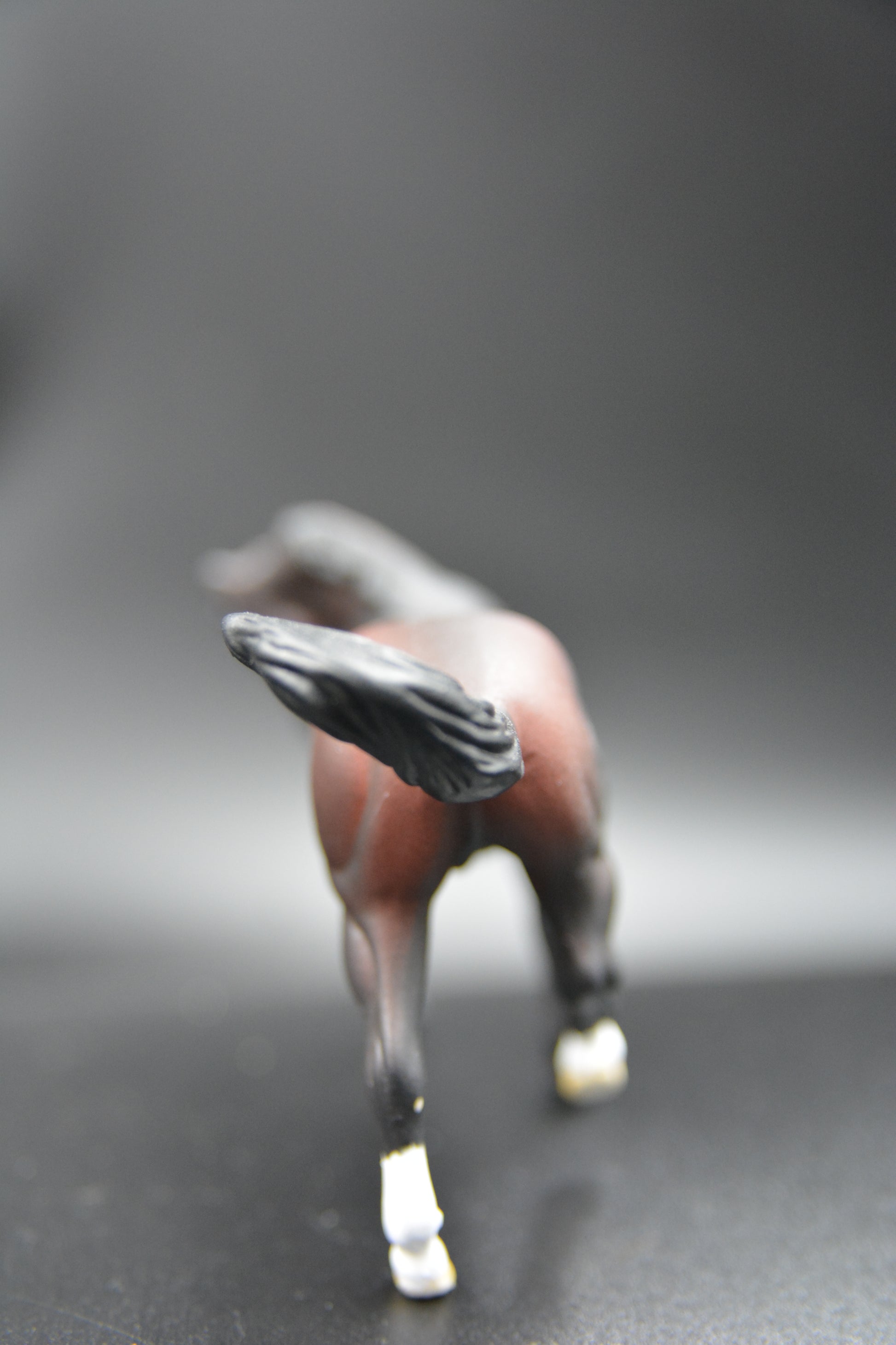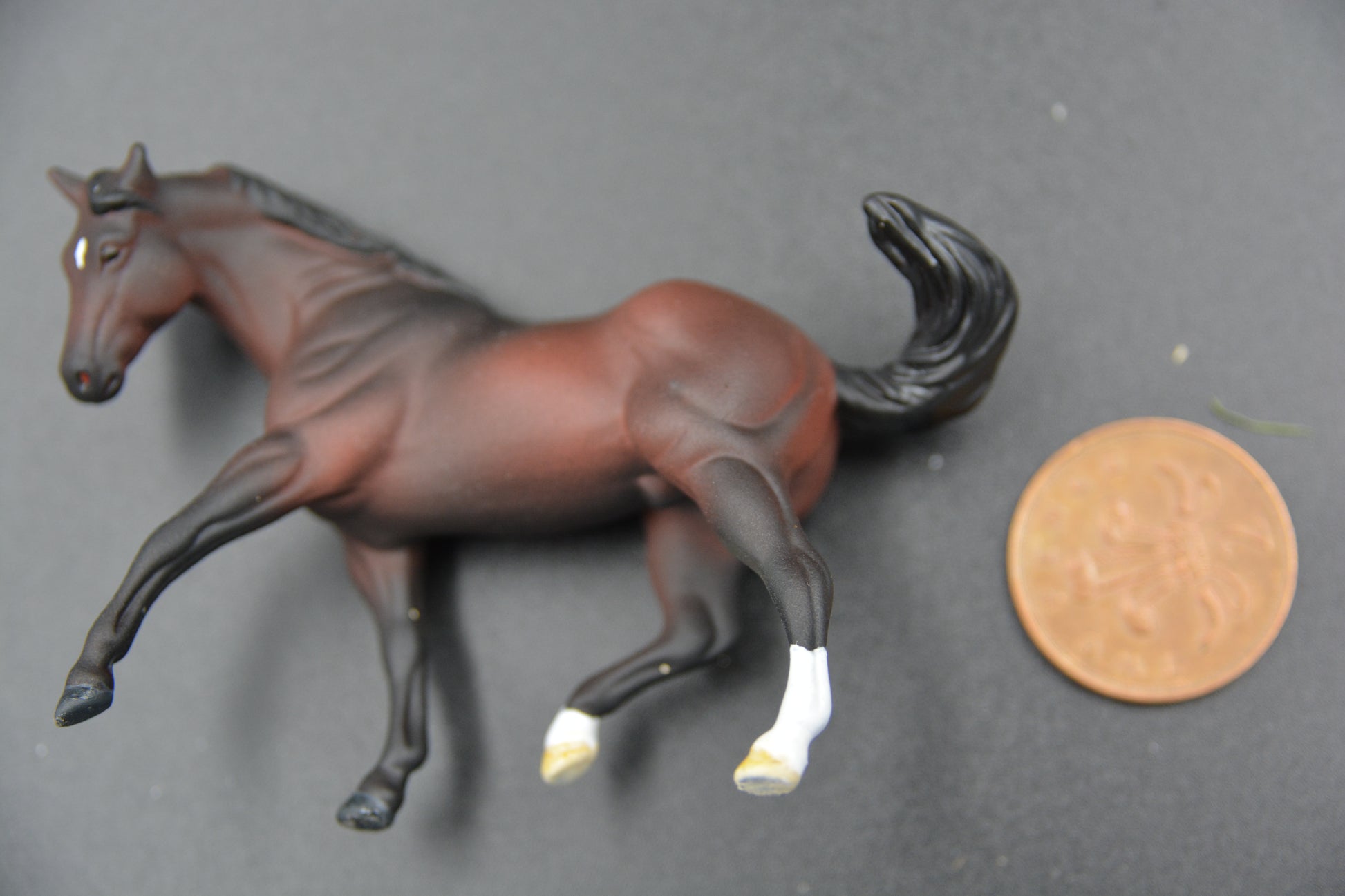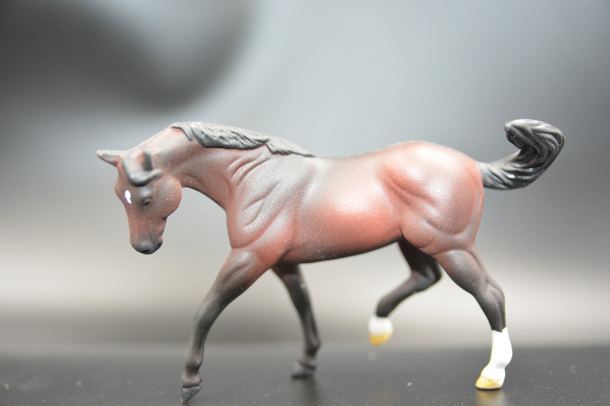 He is Stablemate (1:32 scale) and was painted by Catriona Harris of Chestnut Ridge. He is signed on his belly and has his eyes, nostrils, edge of lips and hooves glossed. He is sealed to protect his finish.