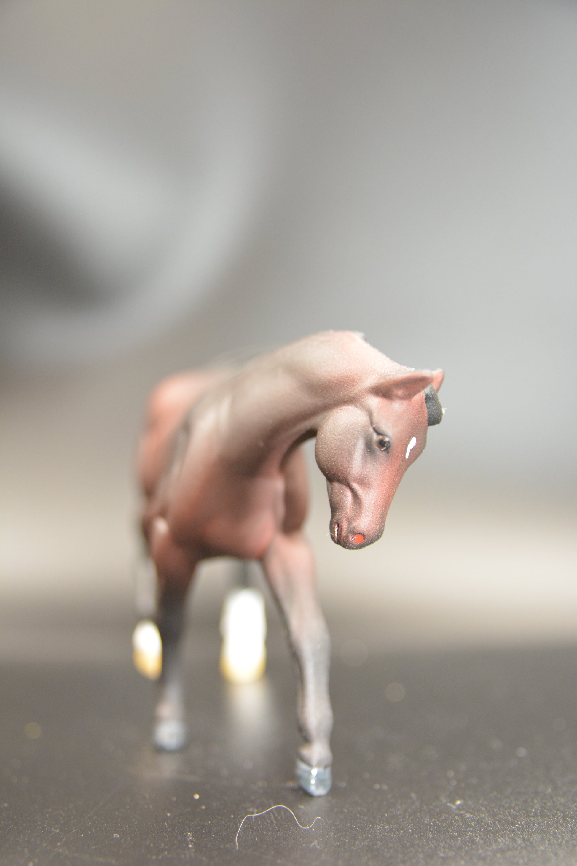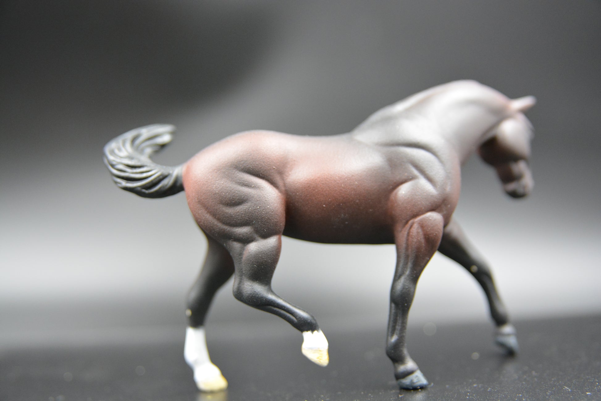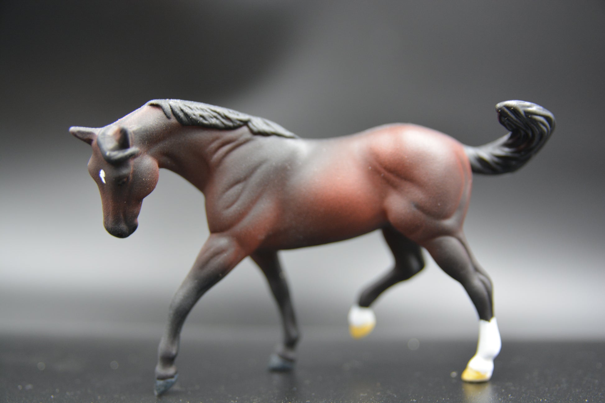 He is Stablemate (1:32 scale) and was painted by Catriona Harris of Chestnut Ridge. He is signed on his belly and has his eyes, nostrils, edge of lips and hooves glossed. He is sealed to protect his finish.