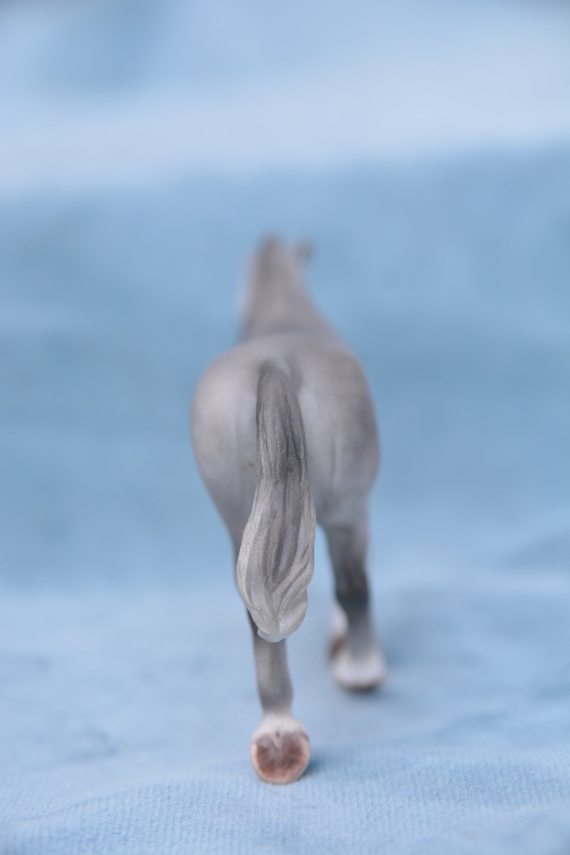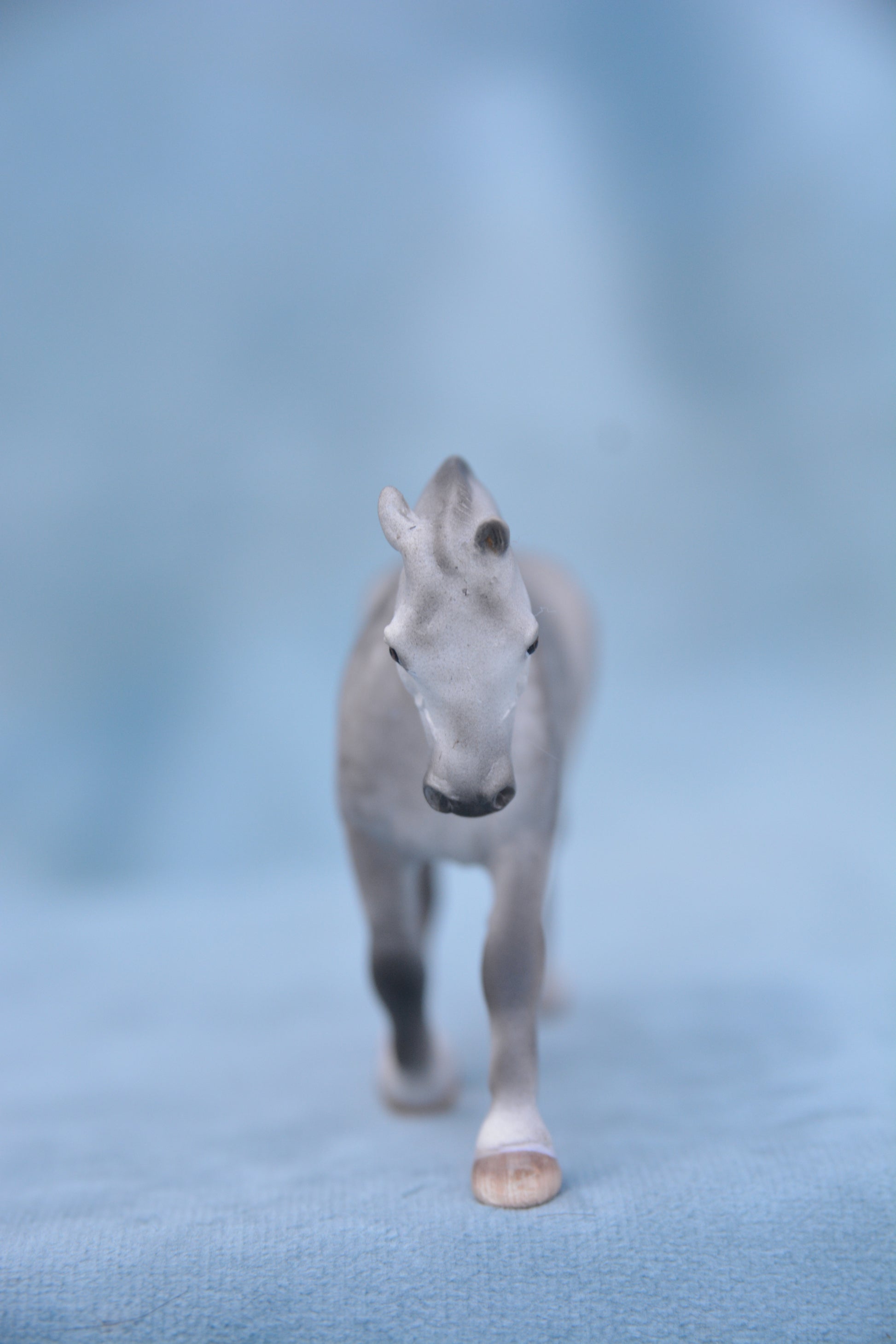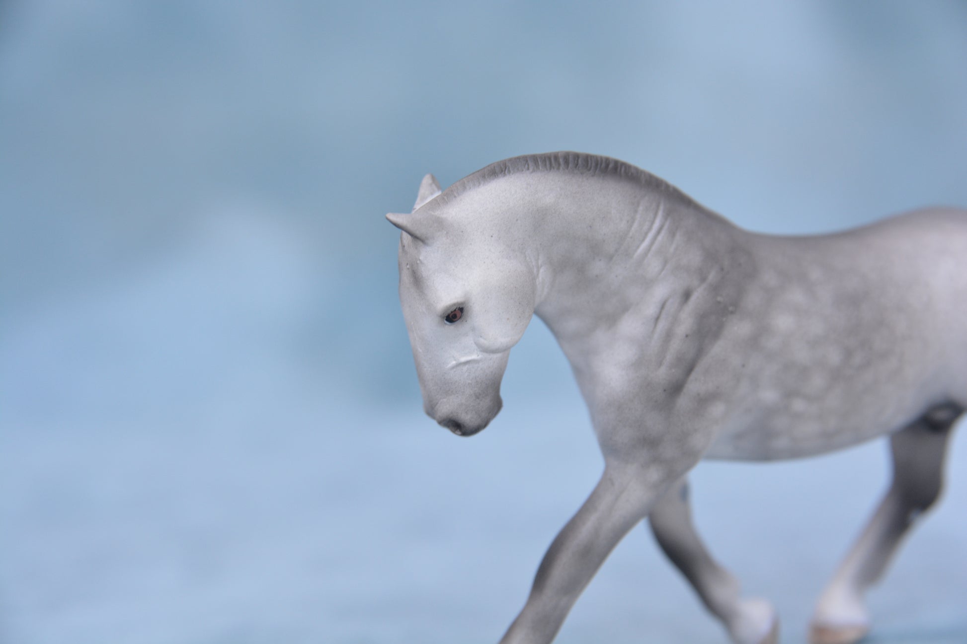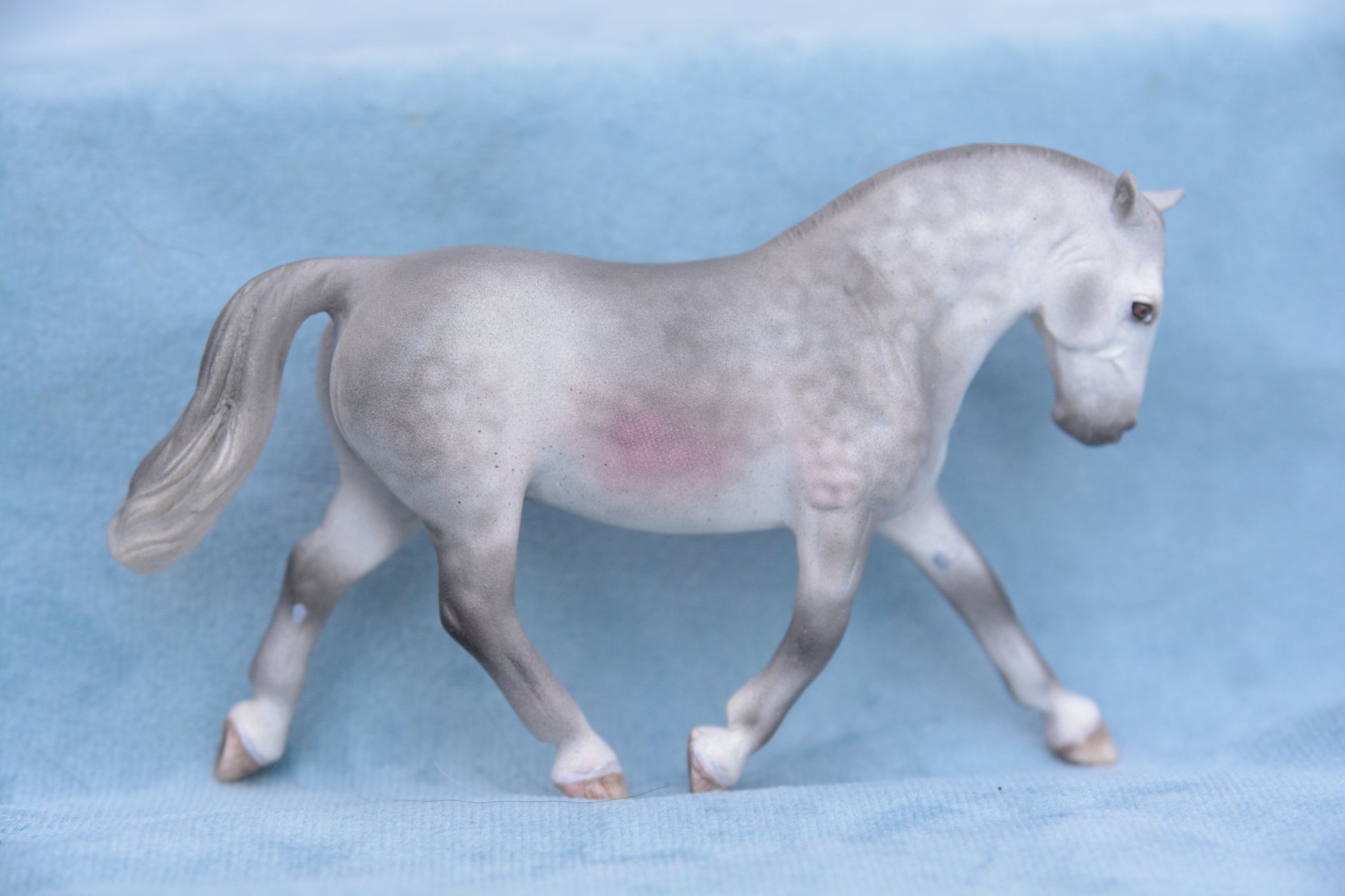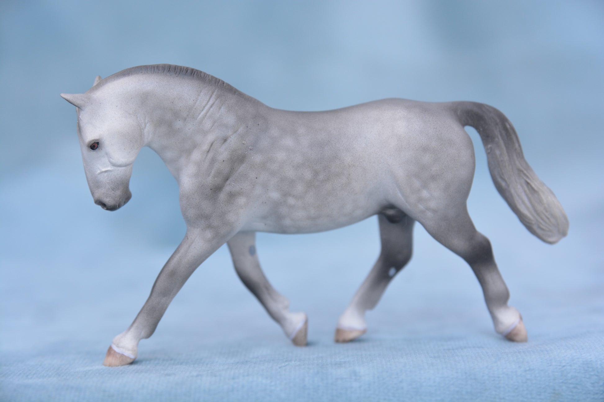 This model is a Hamlet resin sculpted by Clare Stokes. This model is a lovely dapple grey colour. He is a nice Show Cob in a pretty trotting mould. He is unsigned. This is a resin model and is for collecting or showing only and not a toy.