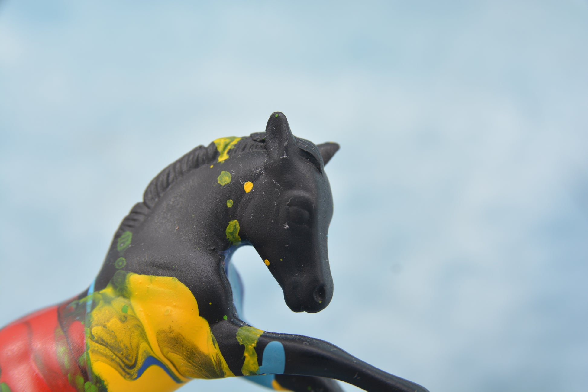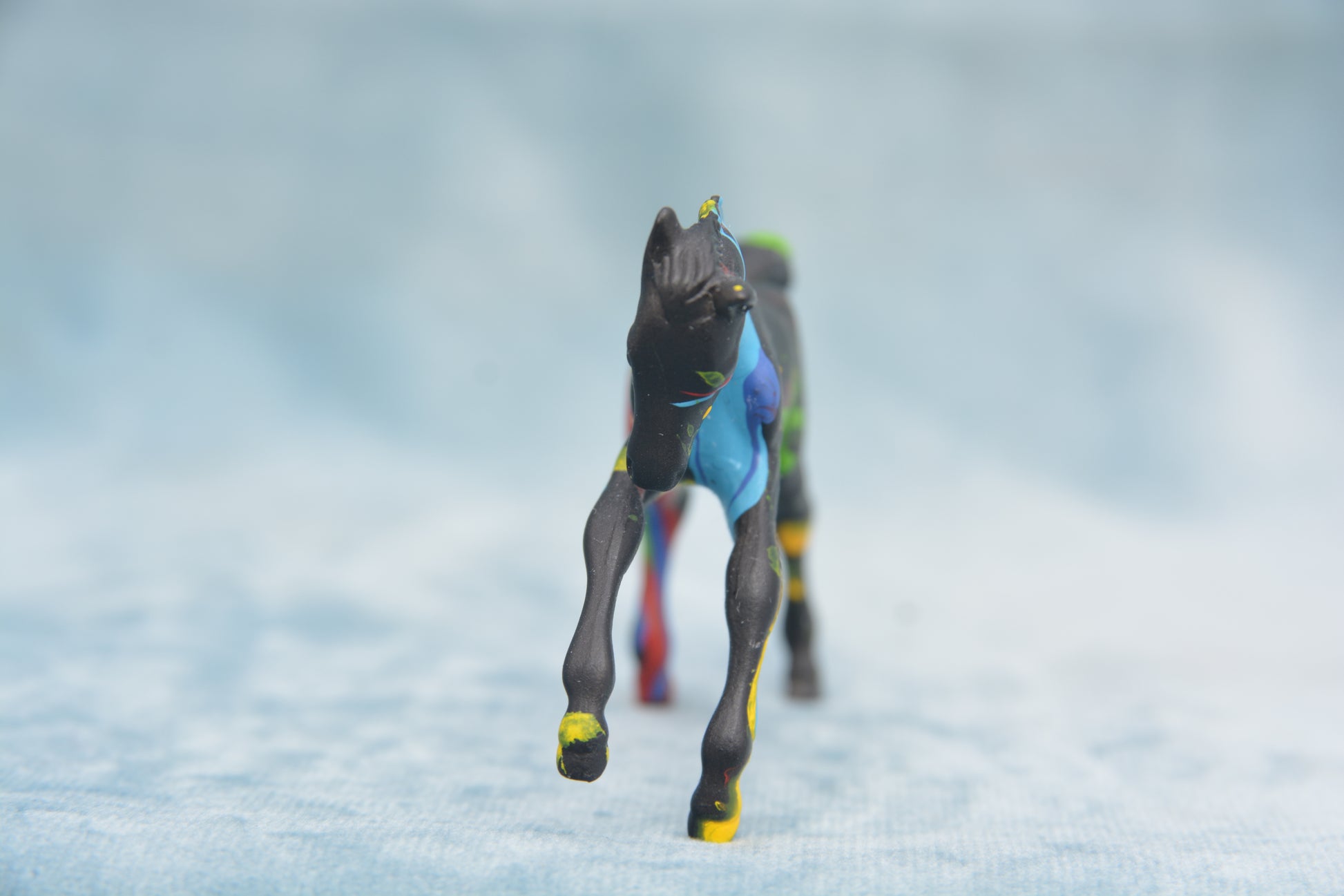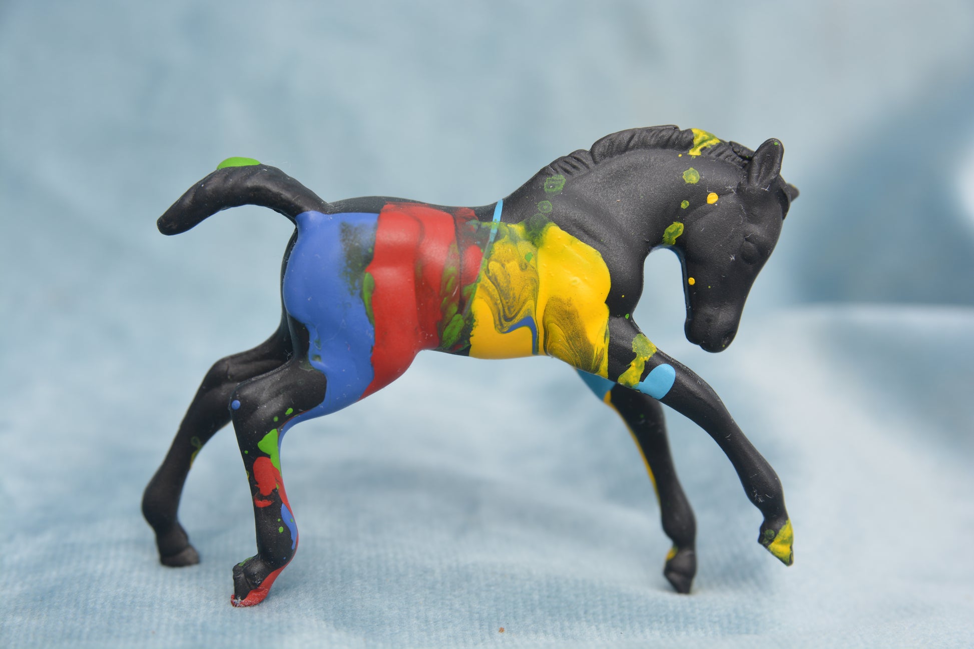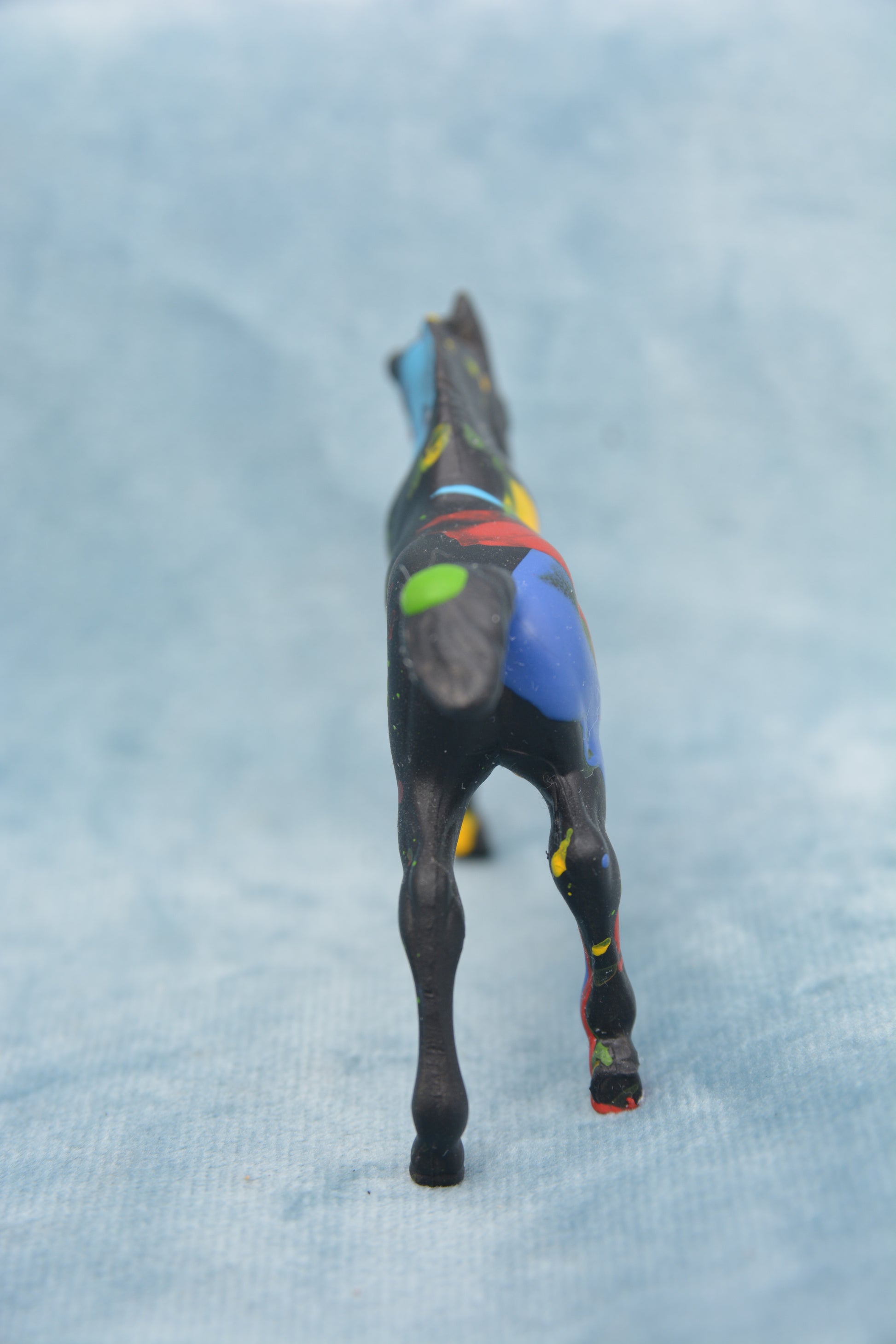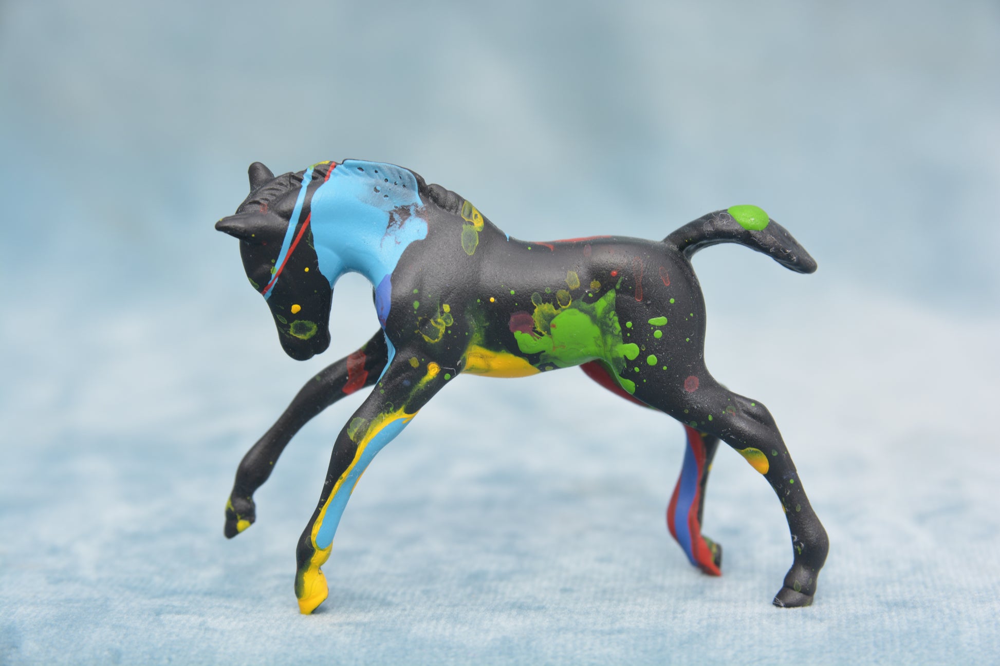 This is a Stablemate scale model horse. This model is a custom Breyer G2 Scrambling Foal. he has been painted to a cool paint splash design.