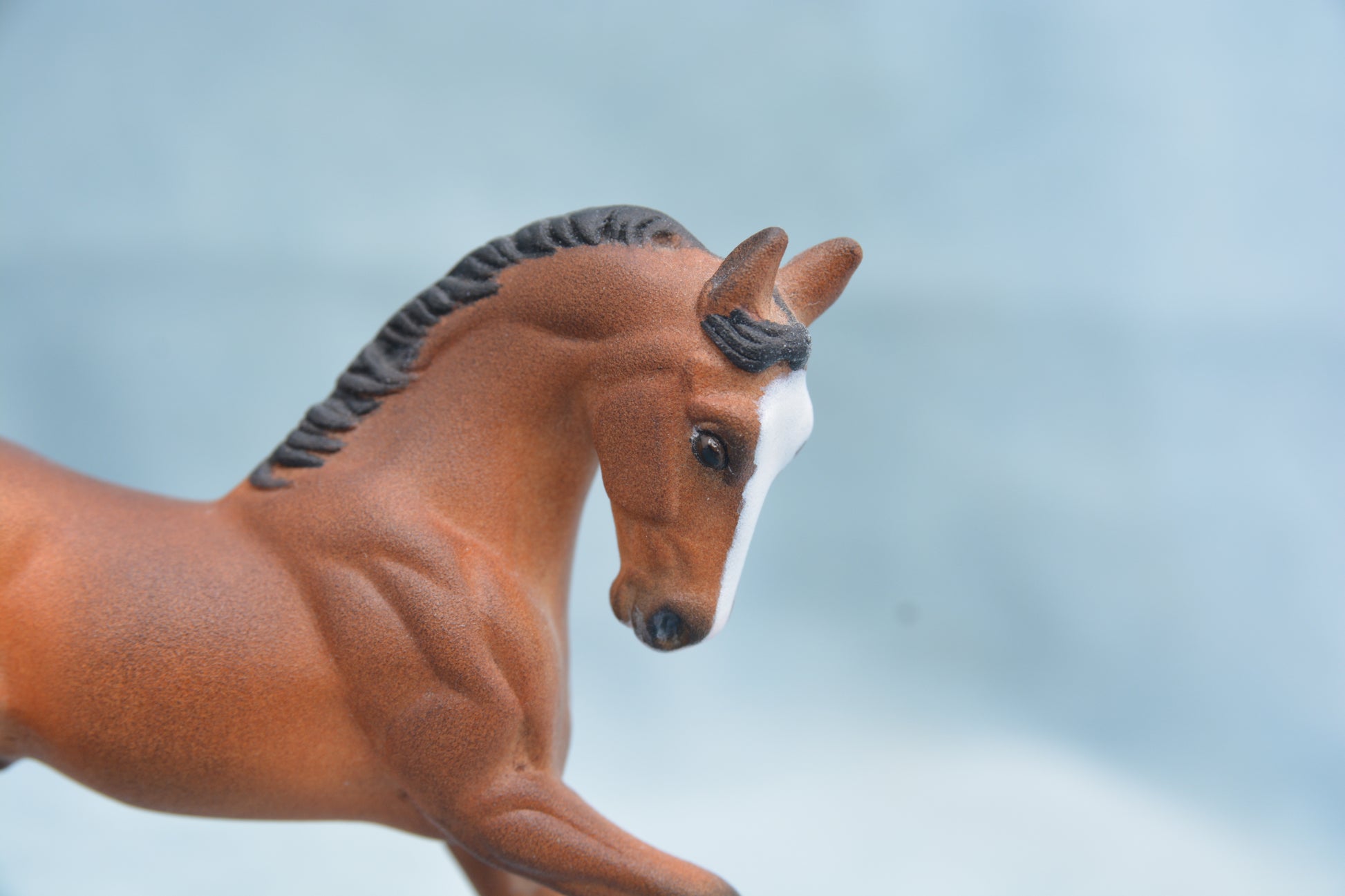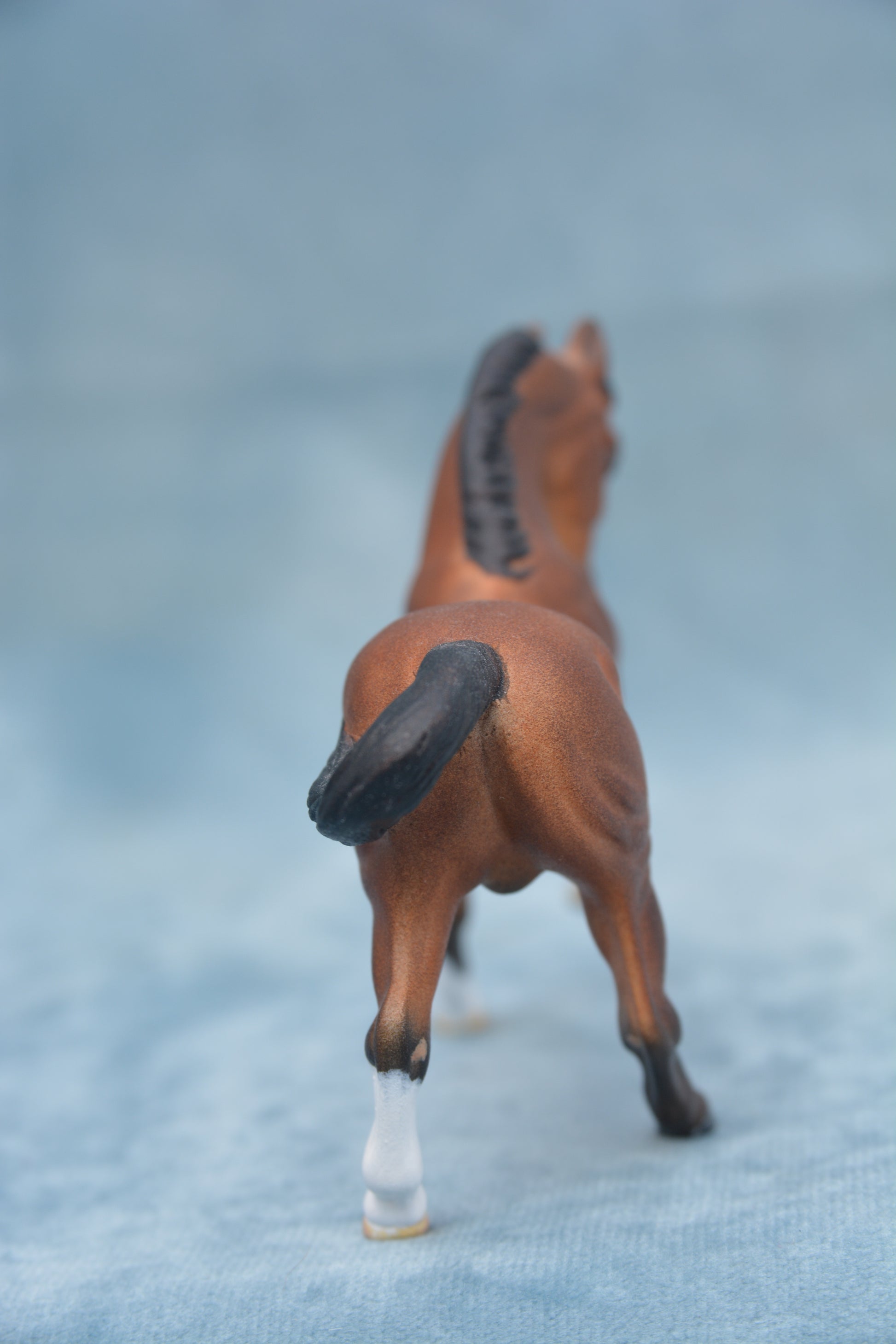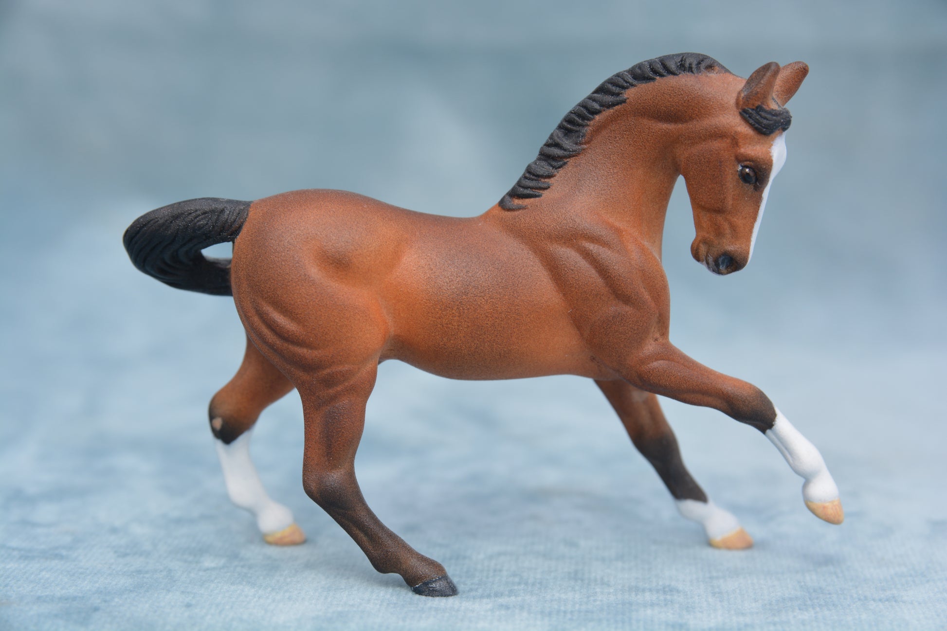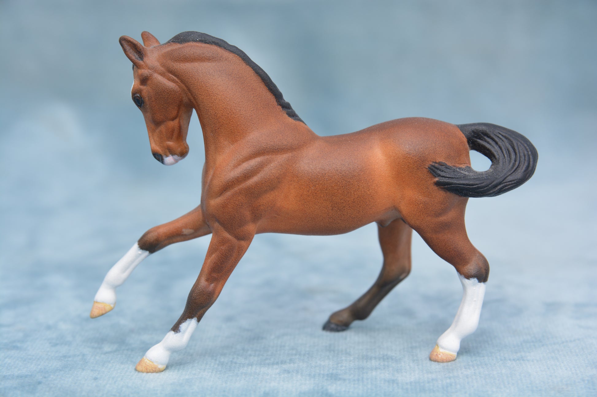 This is a Stablemate scale model horse. This model is a custom Breyer Stablemate G2 Warmblood. He has been painted to a lovely light red bay with heavy white markings.