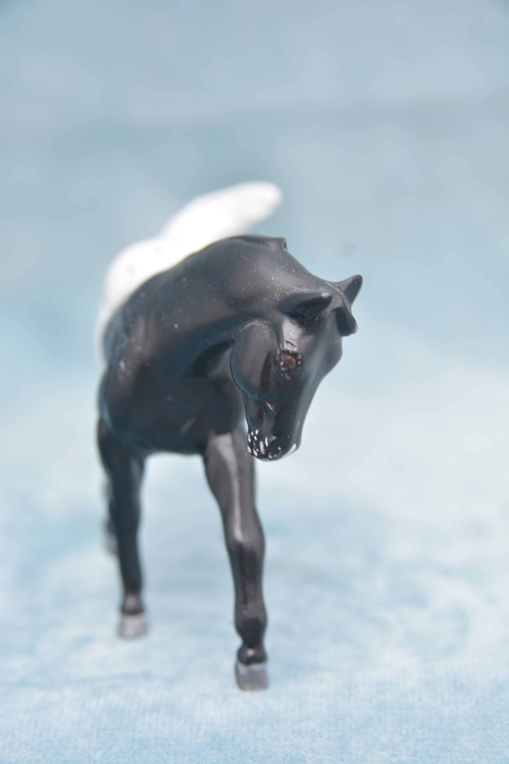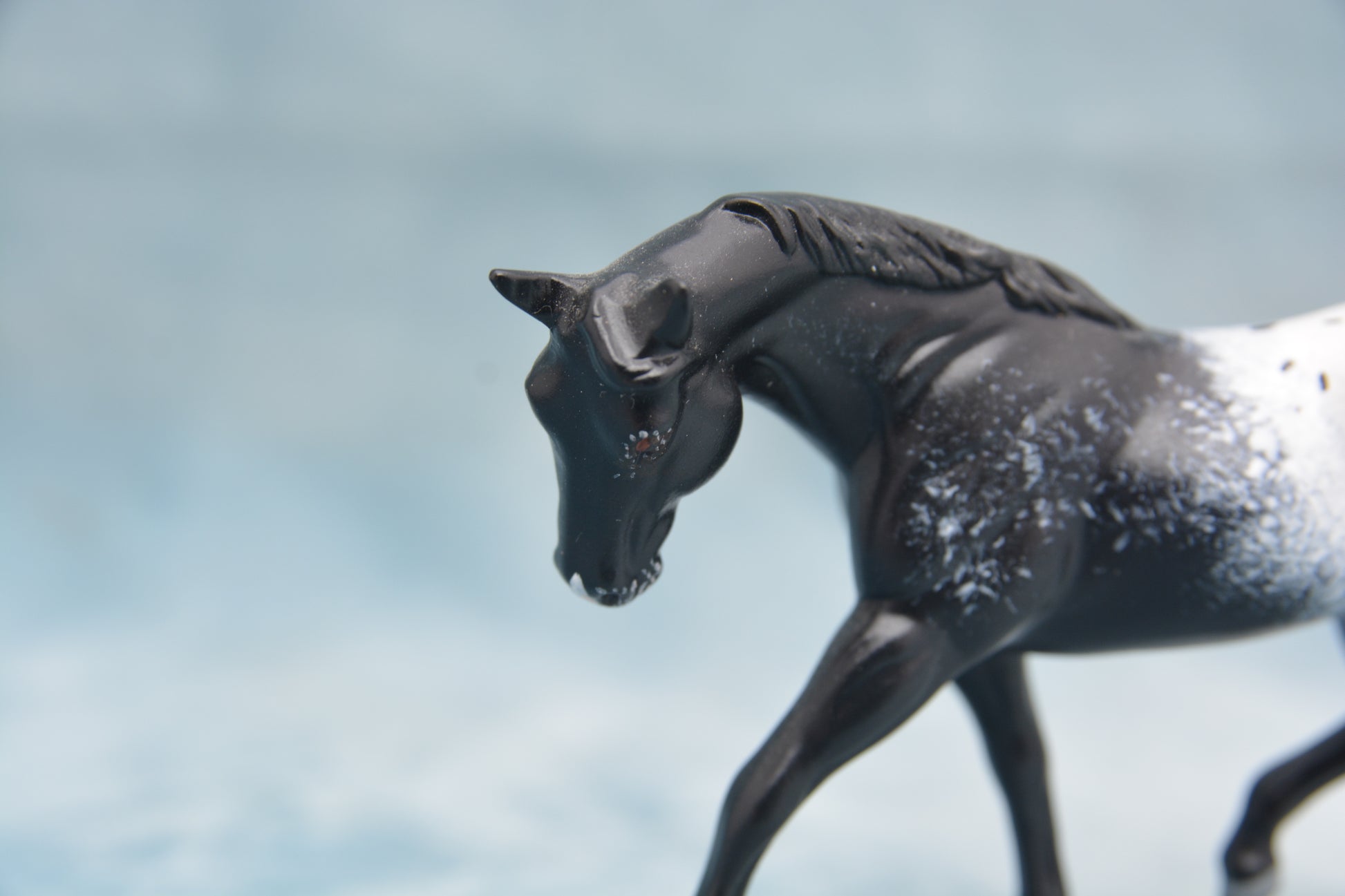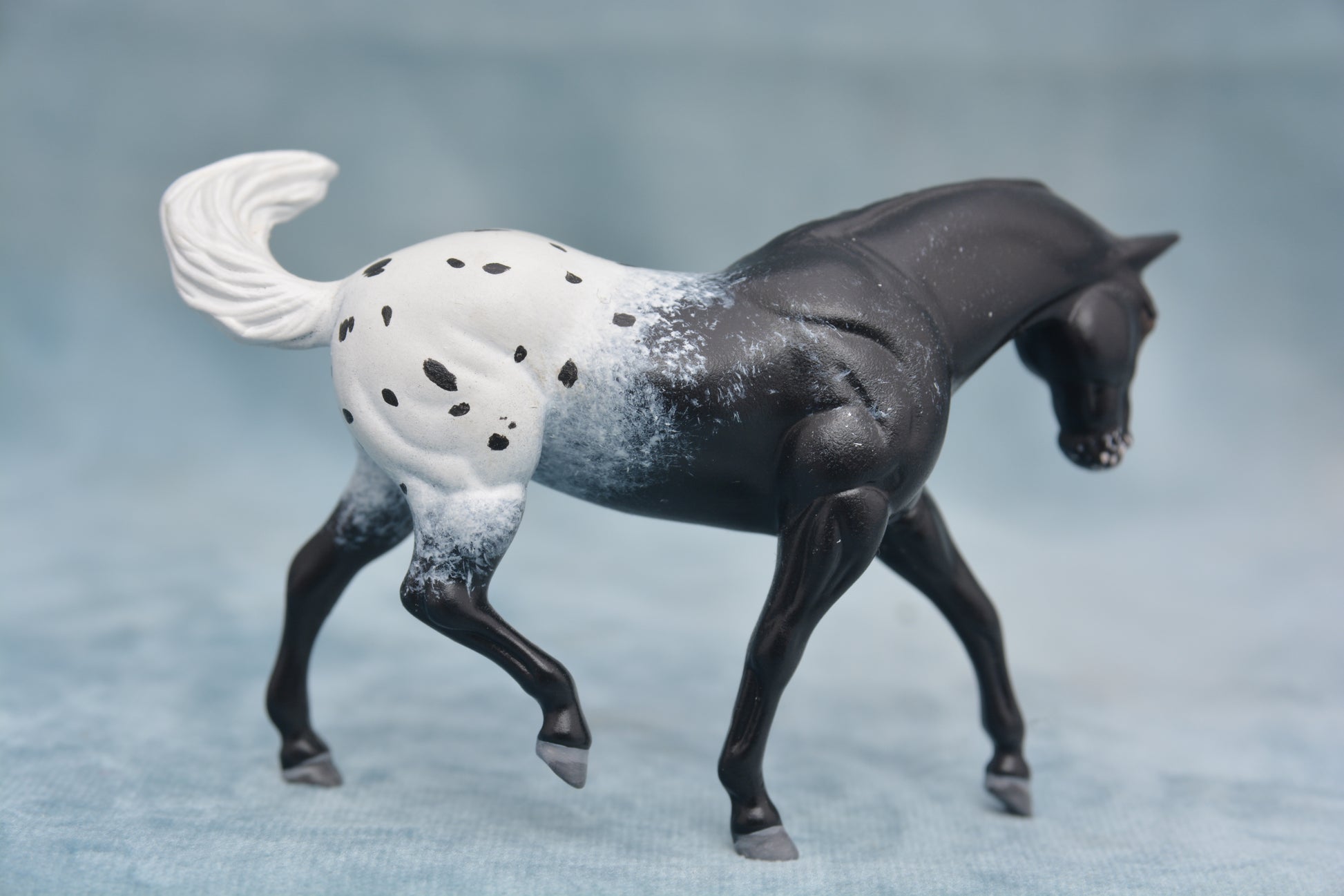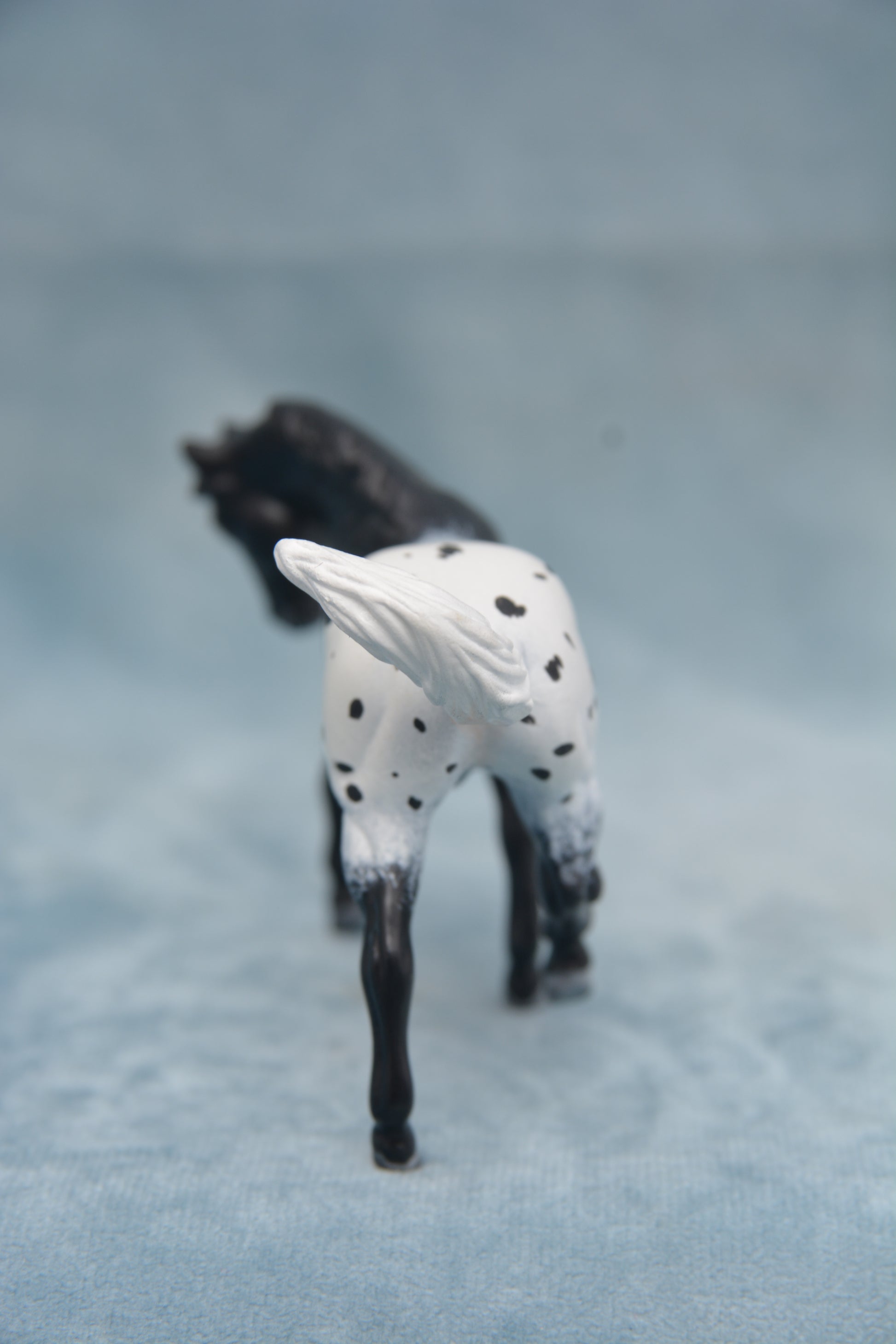 This is a Stablemate scale model horse. This model is a custom Breyer Stablemate G2 Appaloosa. He has been painted to a lovely black blanket spotted with lots of shading and detail.