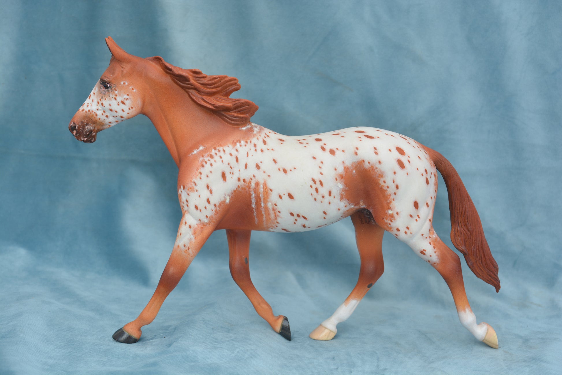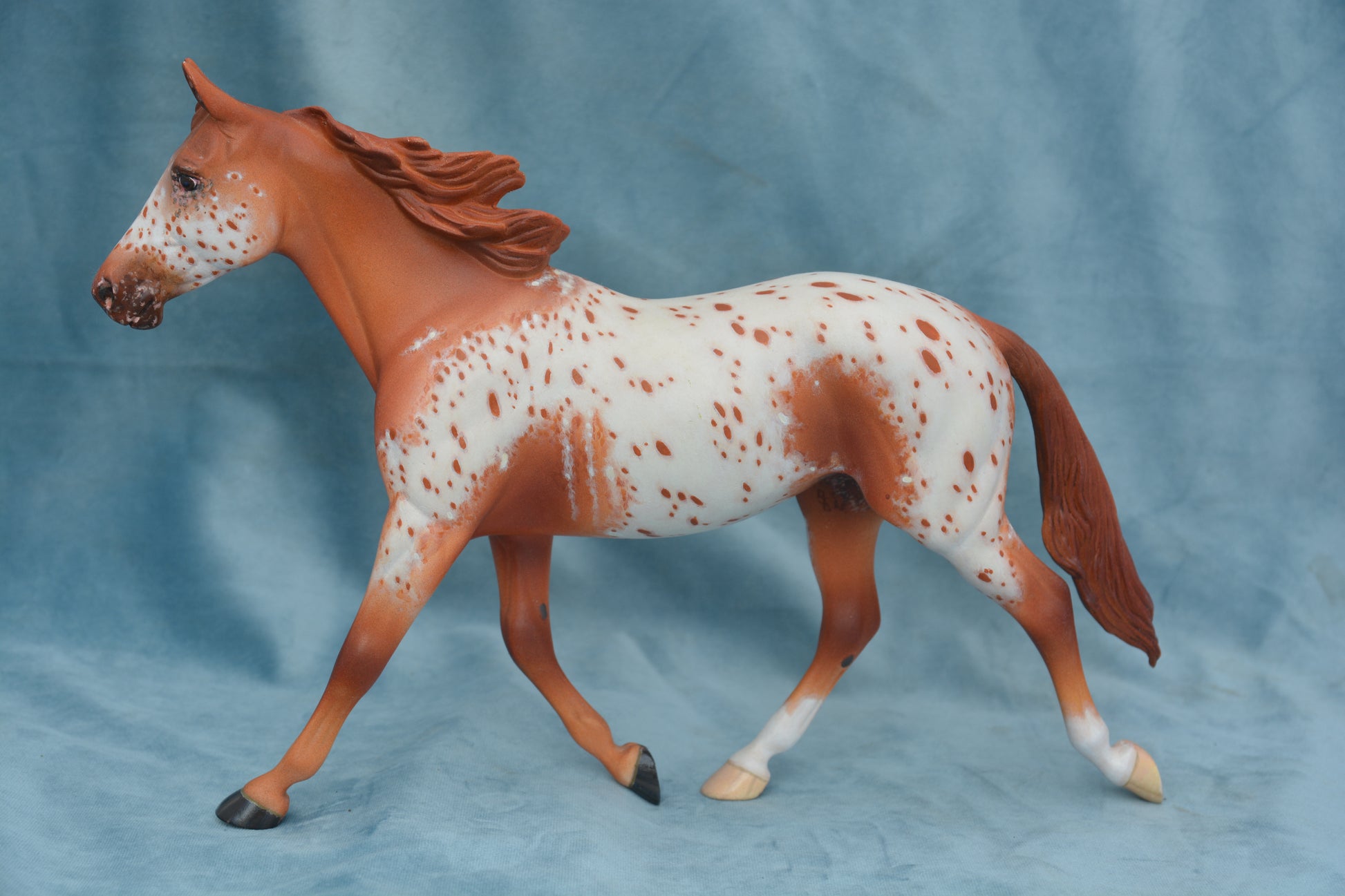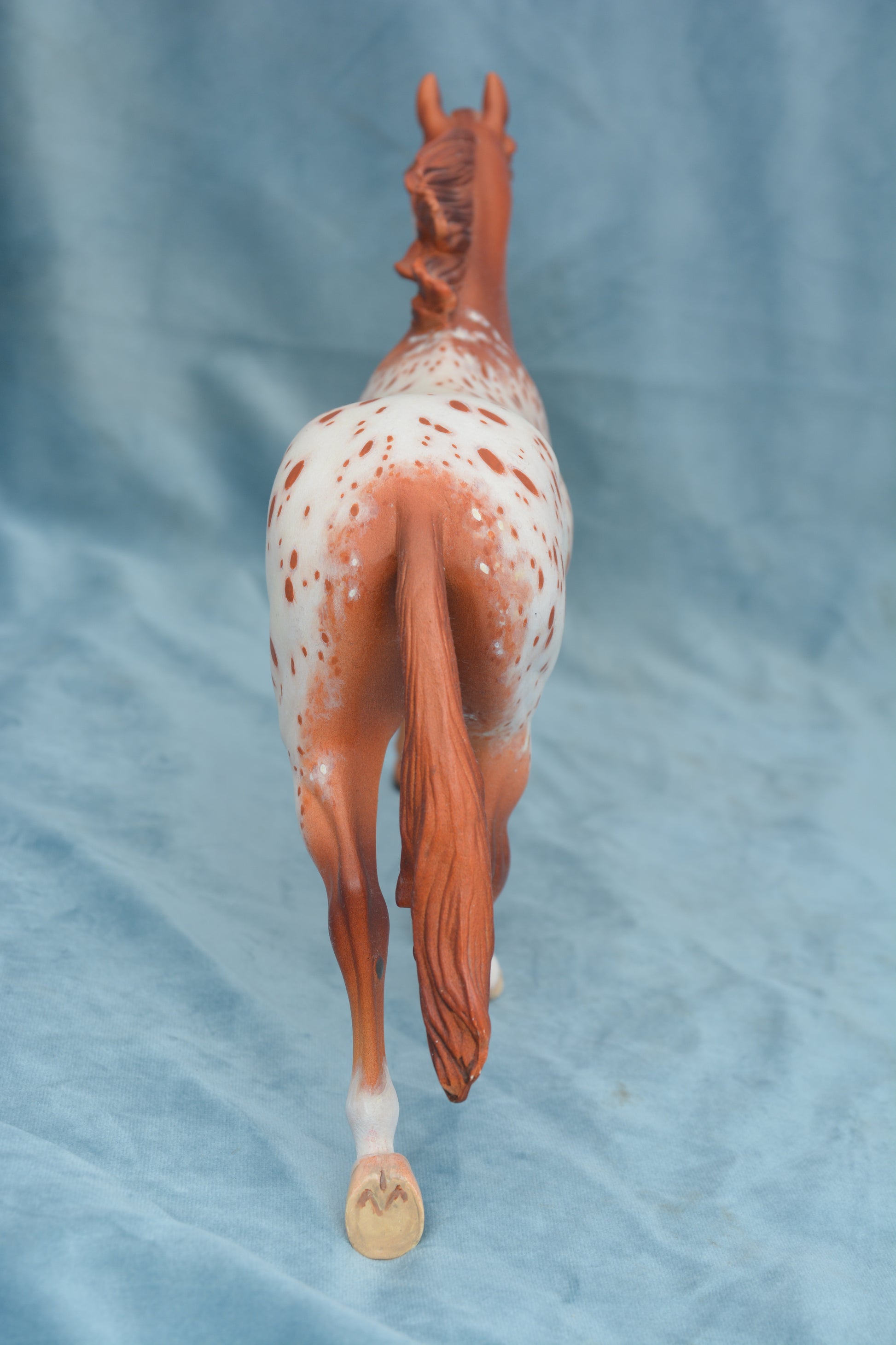 This is a Traditional scale model horse. This is a custom Peter Stone Palouse that has been painted to a chestnut blanket spotted colour. This is a beautiful traditional scale custom that would be a great addition to any collection.