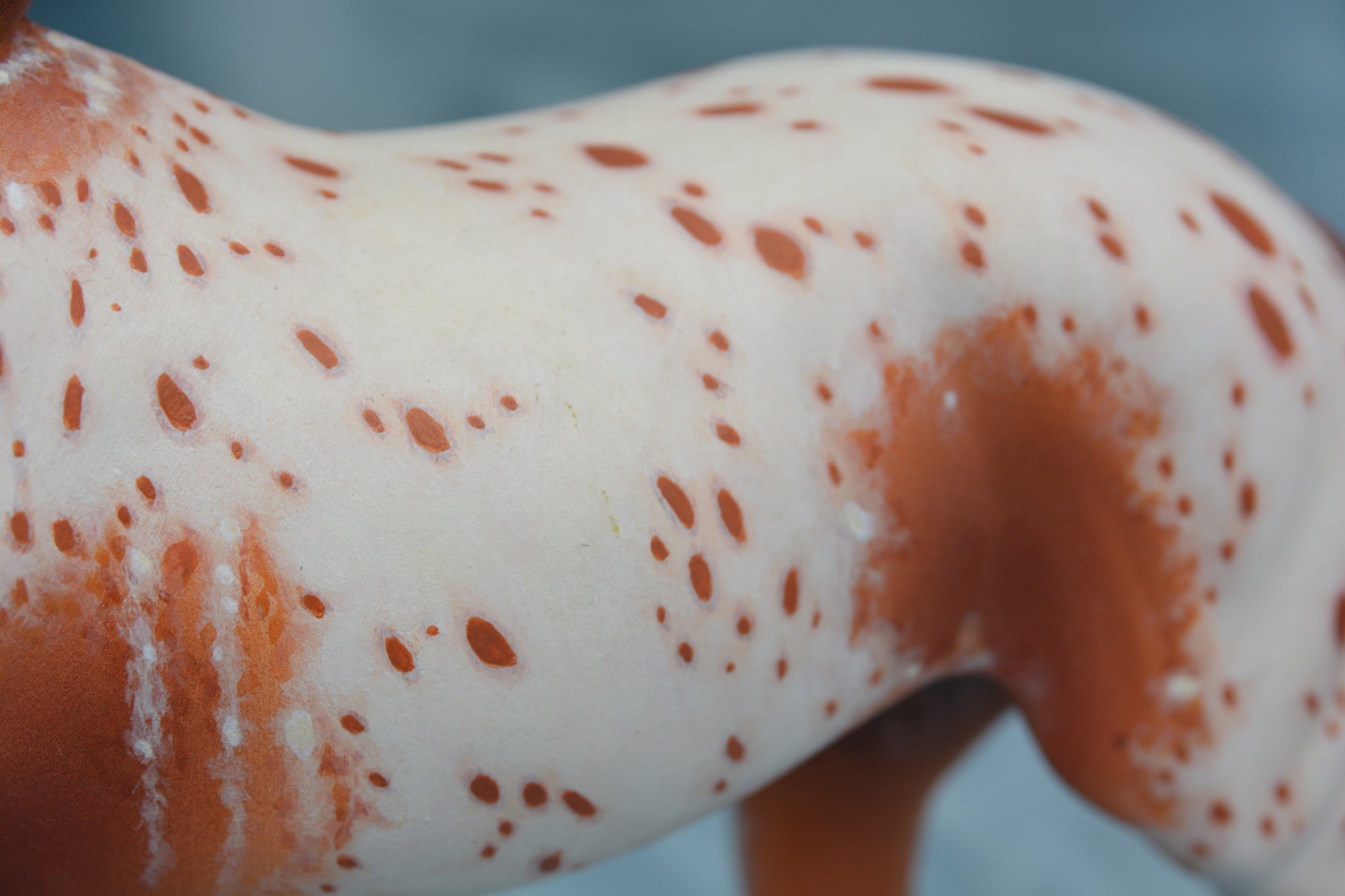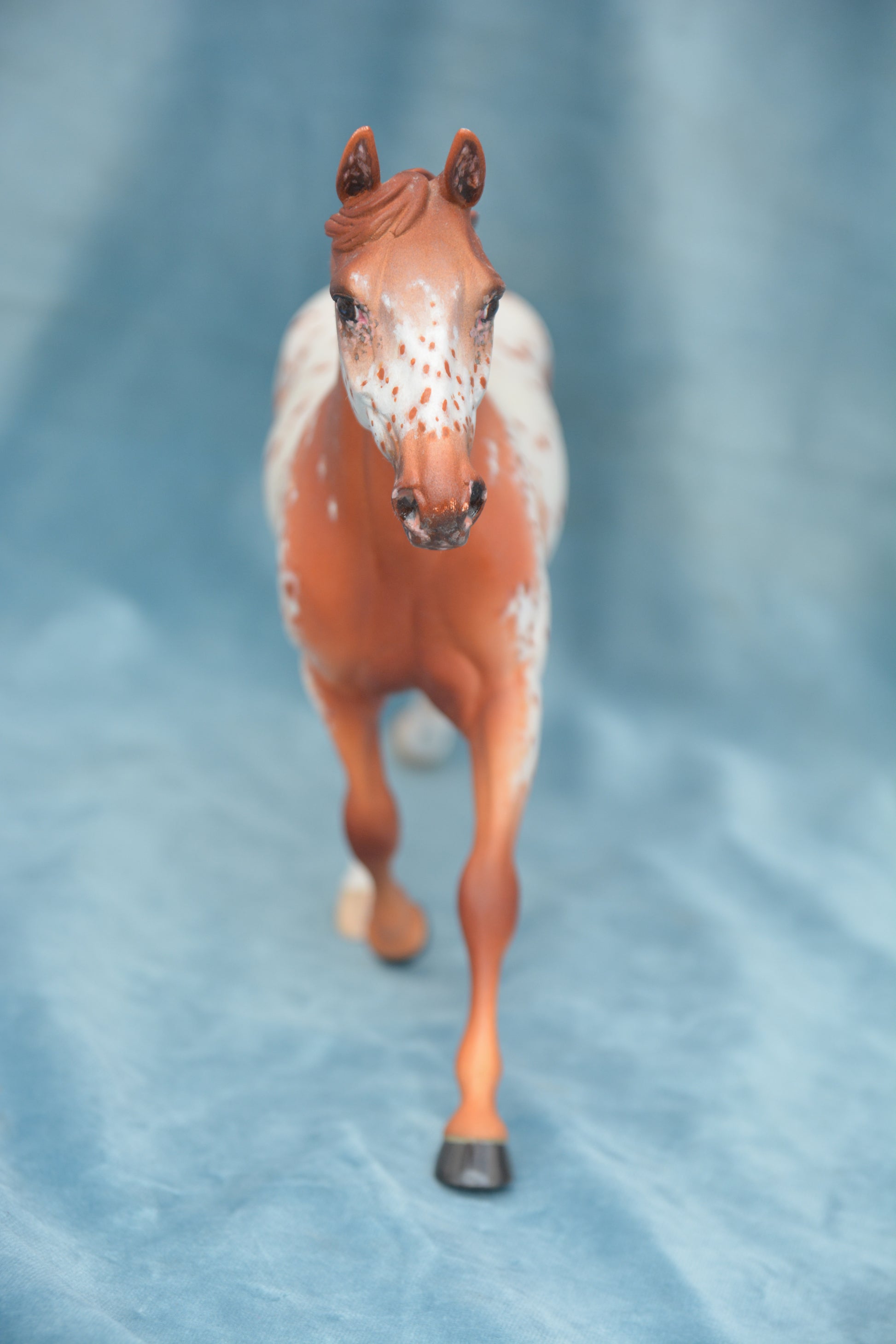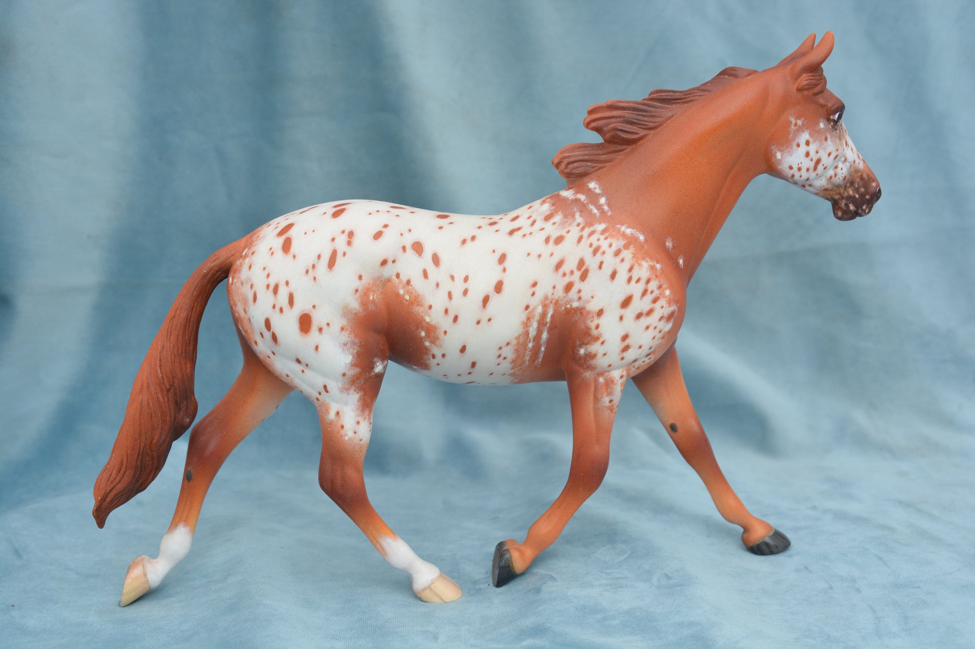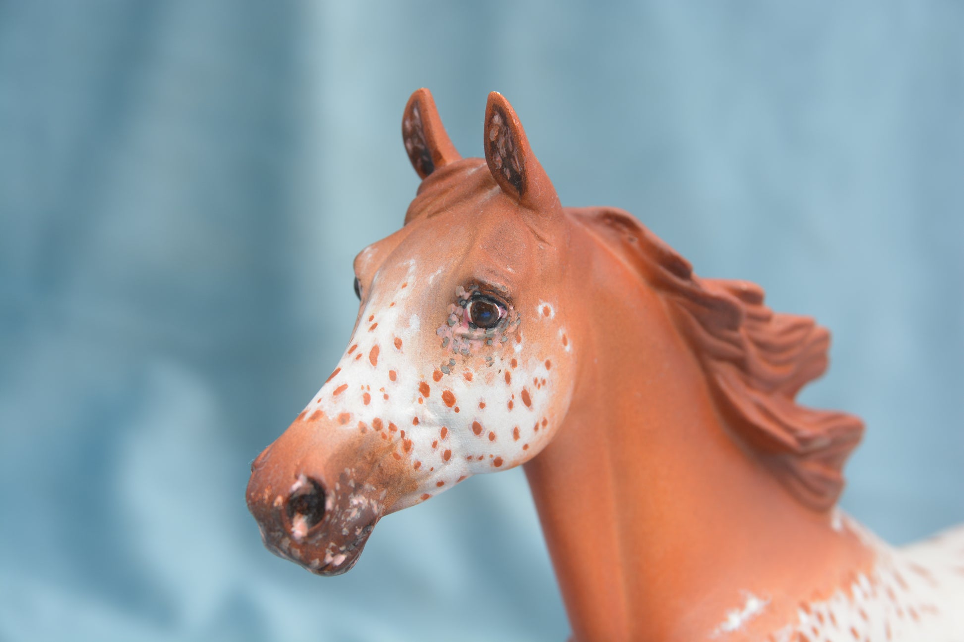 This is a Traditional scale model horse. This is a custom Peter Stone Palouse that has been painted to a chestnut blanket spotted colour. This is a beautiful traditional scale custom that would be a great addition to any collection.