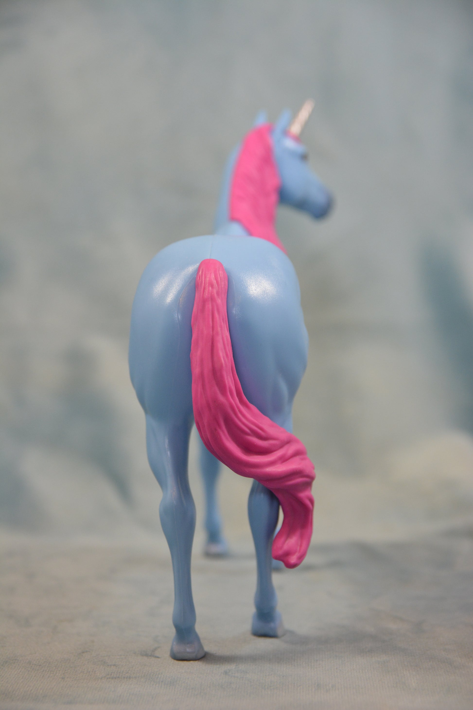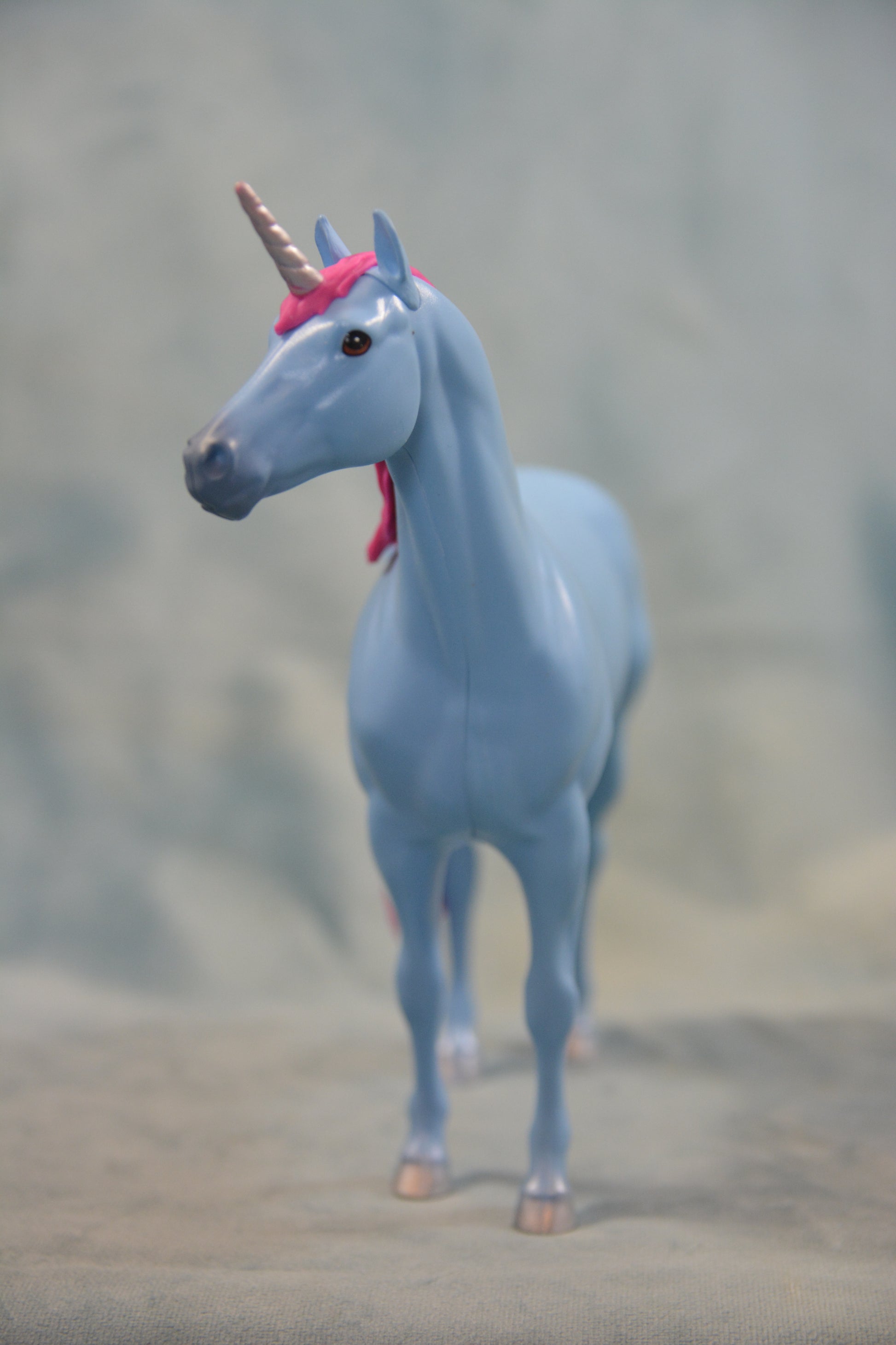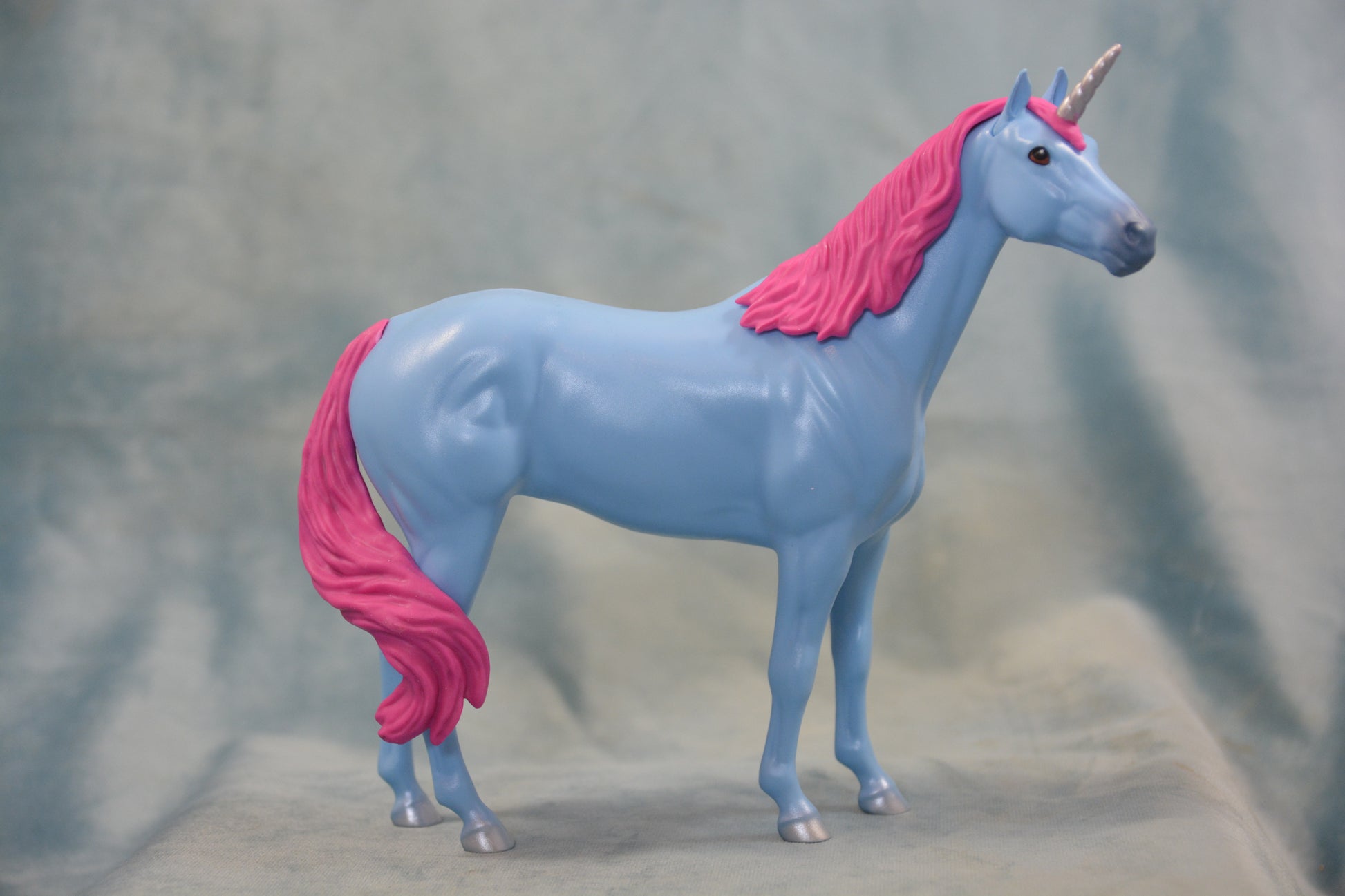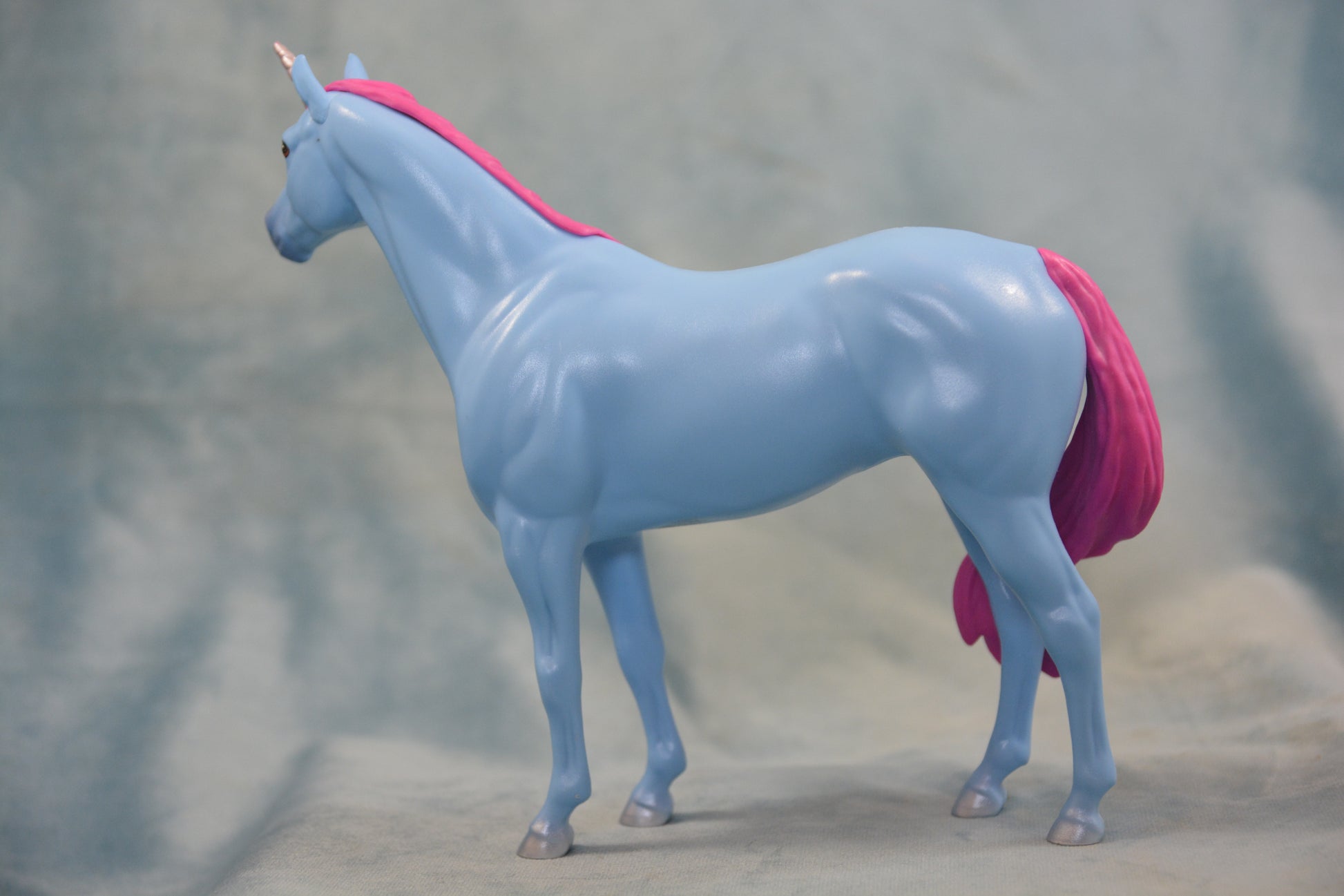 This is one of the new Breyer Paddock Pal's models. These models are around Classics scale and made from a slightly more rubbery plastic than the normal Breyer models. This model is a lovely blue colour with a pink mane and tail.