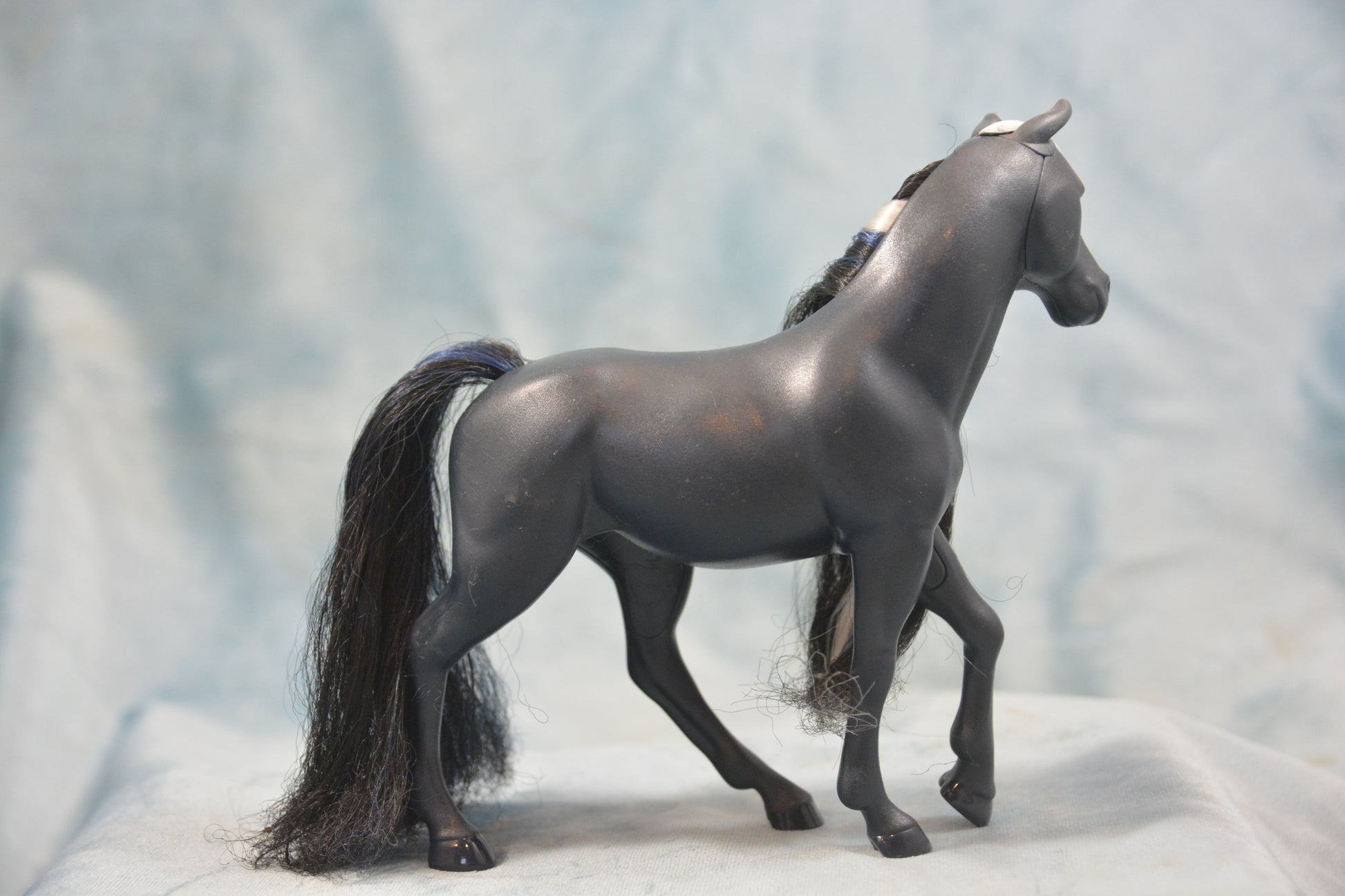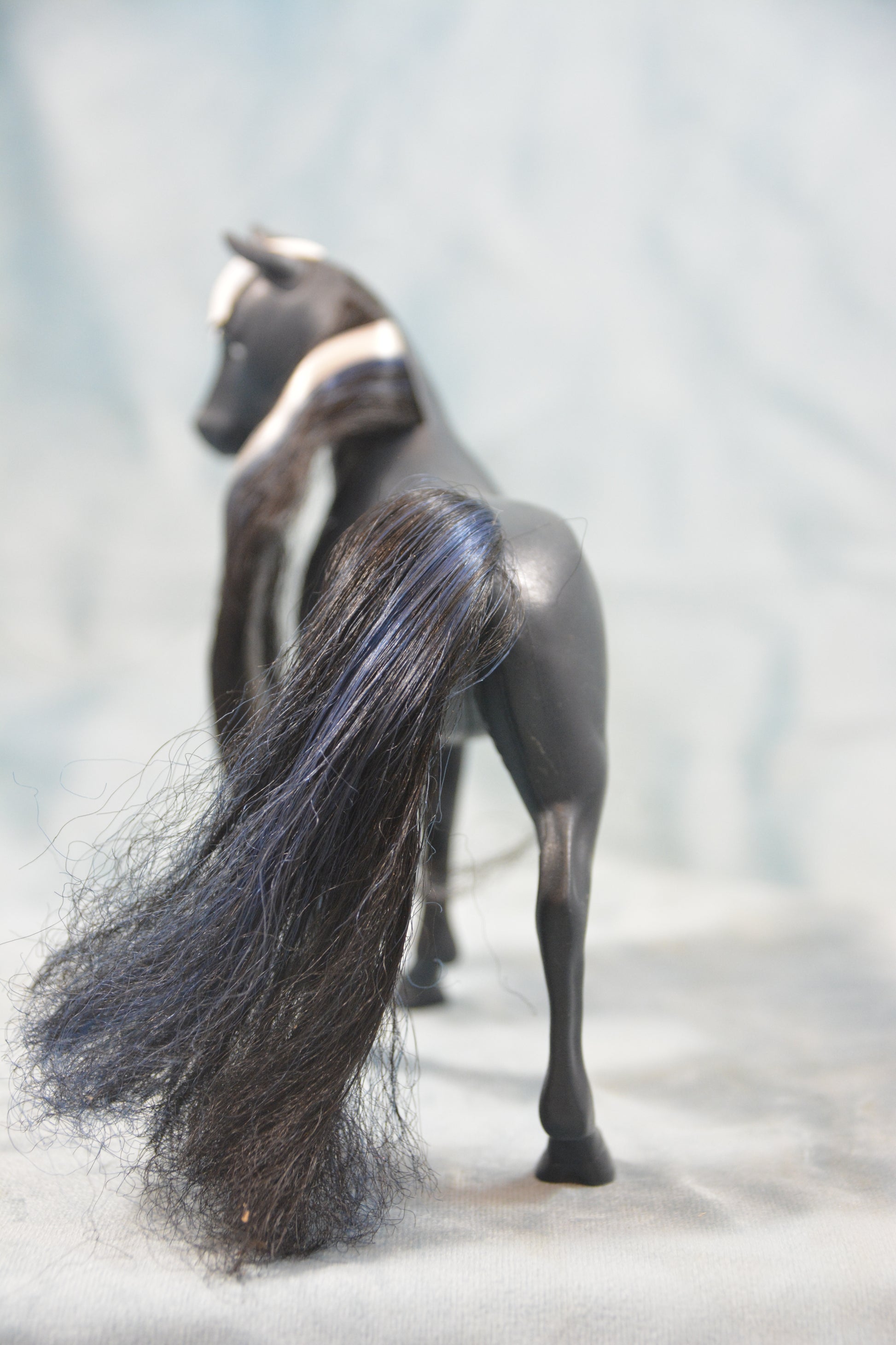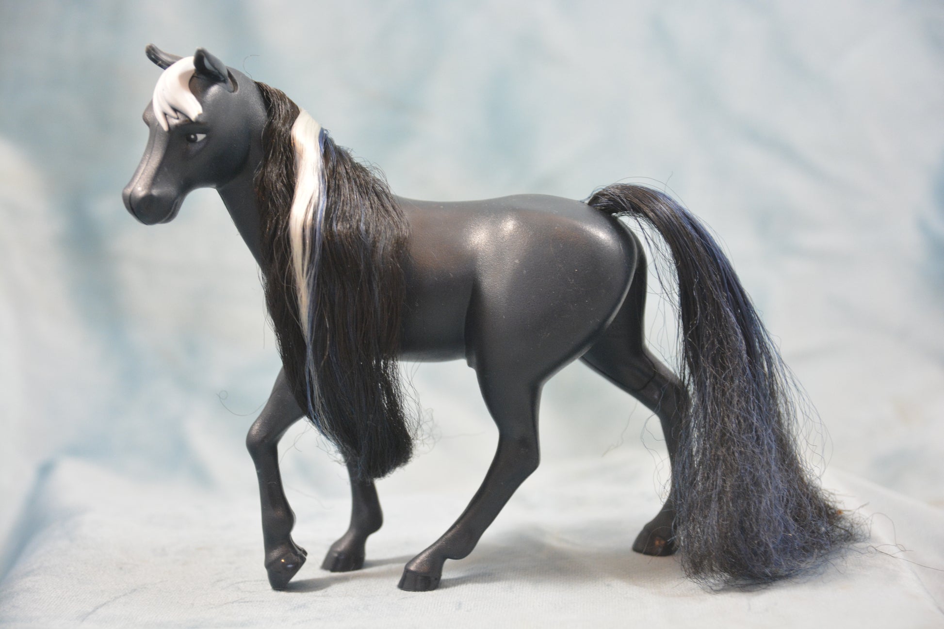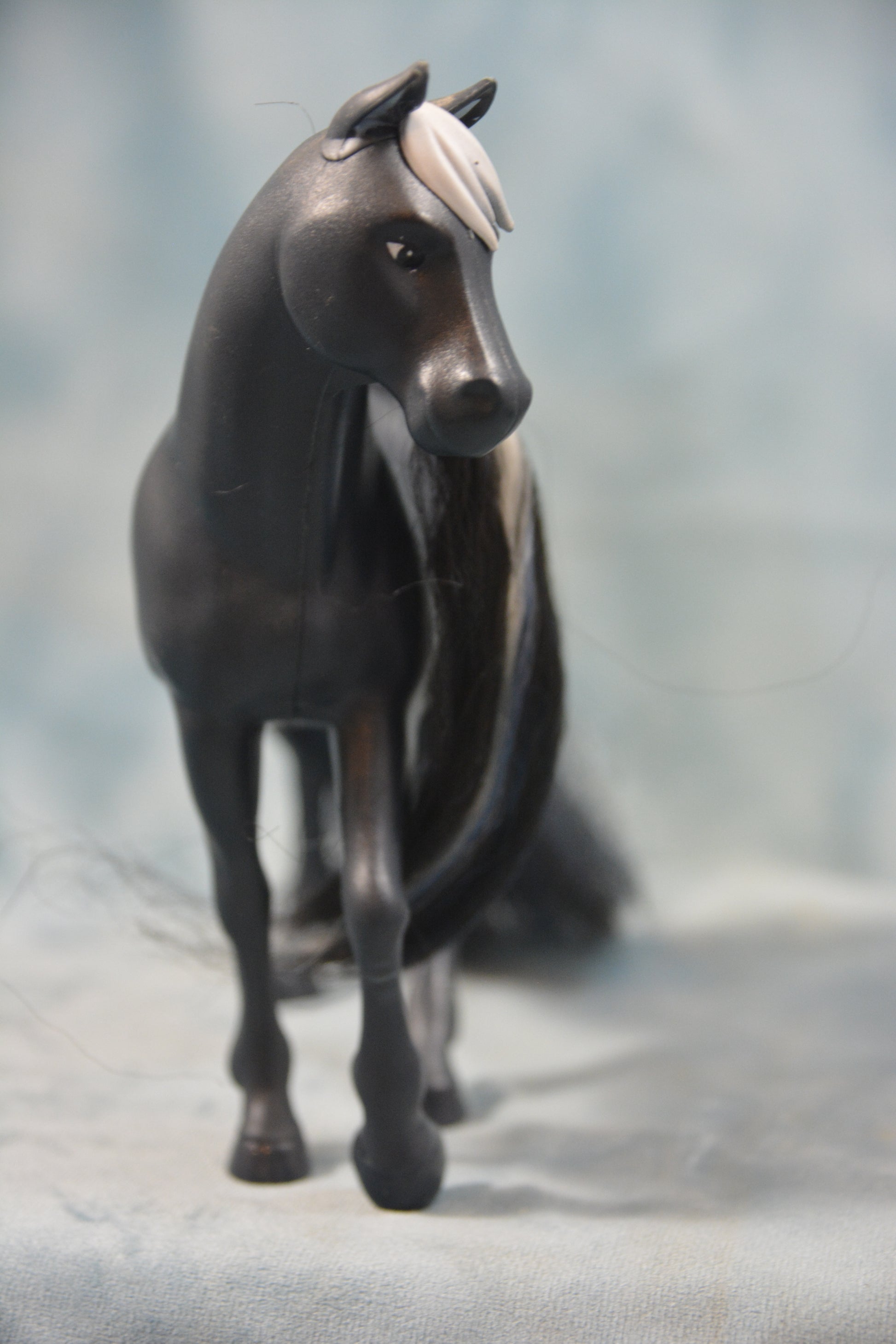 This lovely model is a black horse with a white streak in his mane and forelock. He is from the Horse and Stable Play Set. As far as I can tell he doesn't correspond to an actual horse from the series. His forelock is solid but his mane and tail are synthetic.