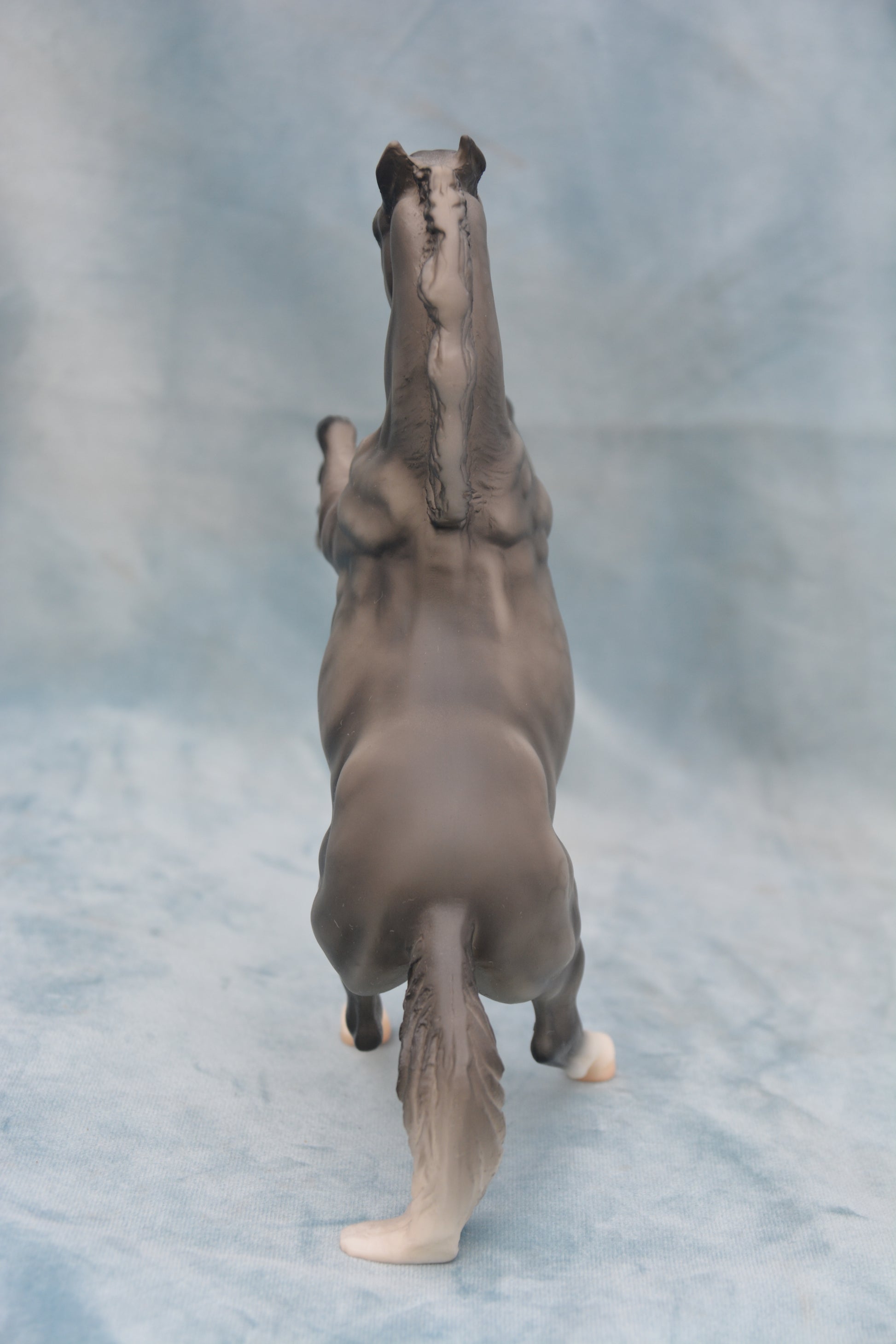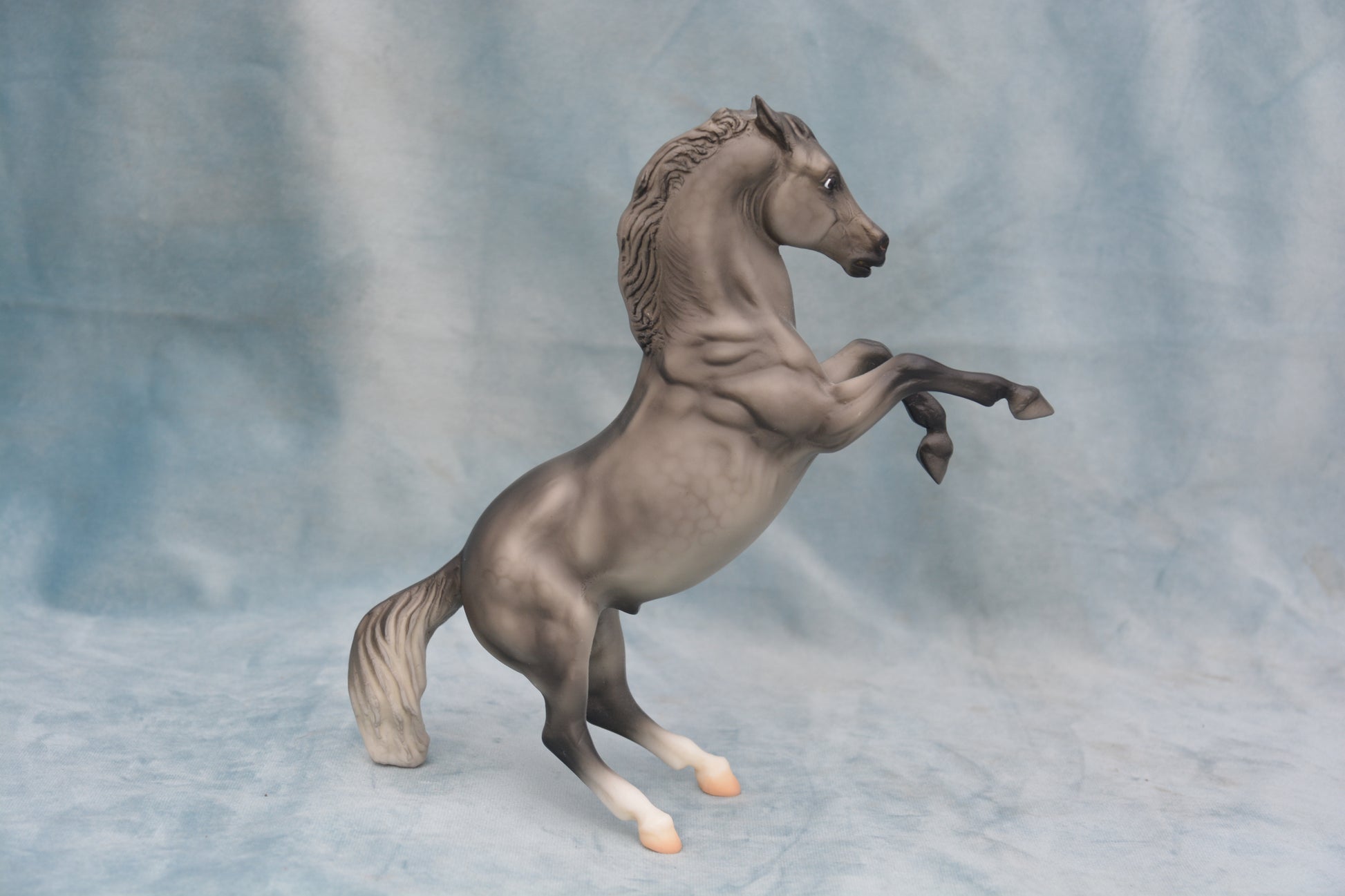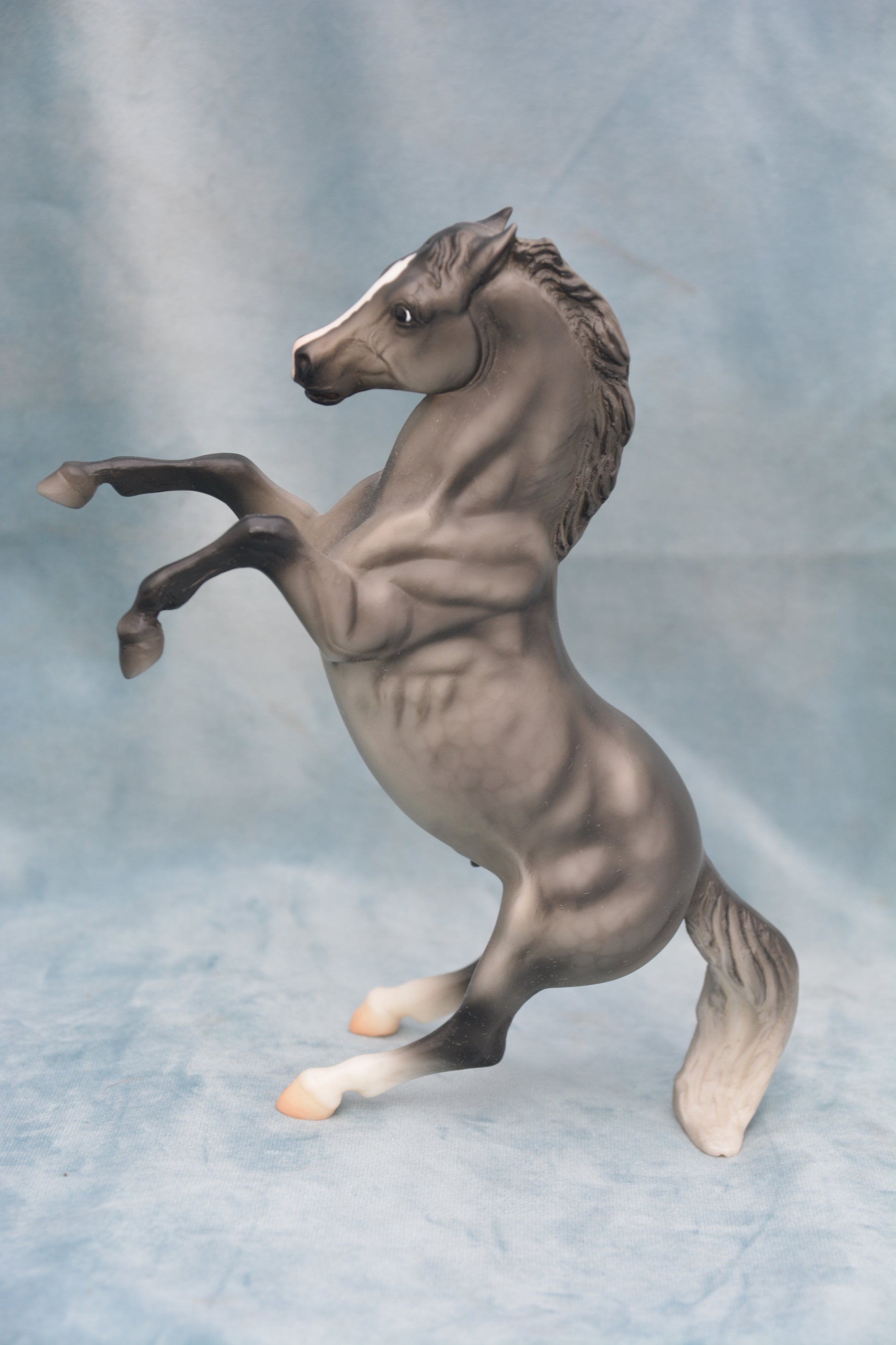 This is a Classic scale model horse. This is a regular run dapple grey Mustang. This model was produced from 2009-2011. He is Classic scale and is on the Rearing Stallion mould. Model number 613.