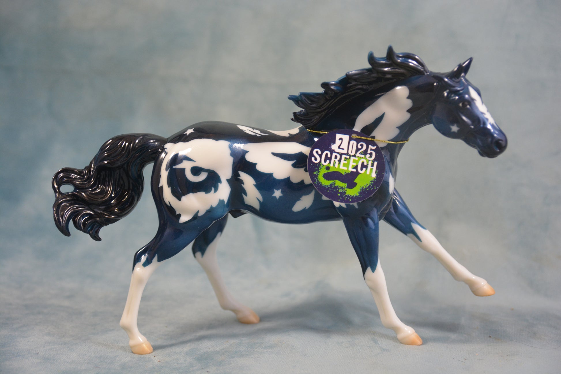 This is a Breyer Classic model horse, Screech. Screech was a Breyer web special produced in 2025. He was the Halloween web special for 2025 and is a dark blue owl themed model on the American Quarter Horse Stallion mould. He glows in the dark. He is model number B-CS-10436.