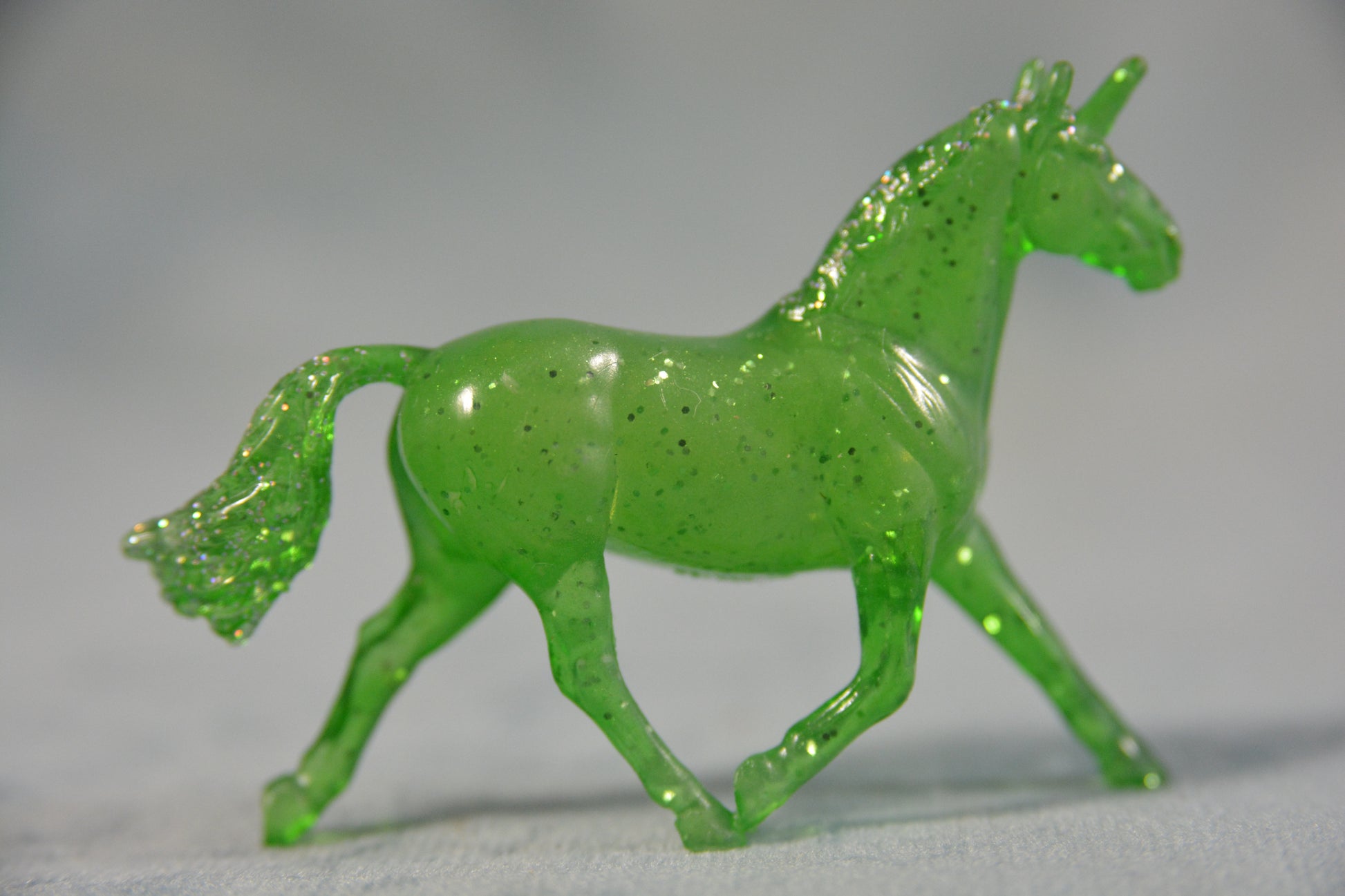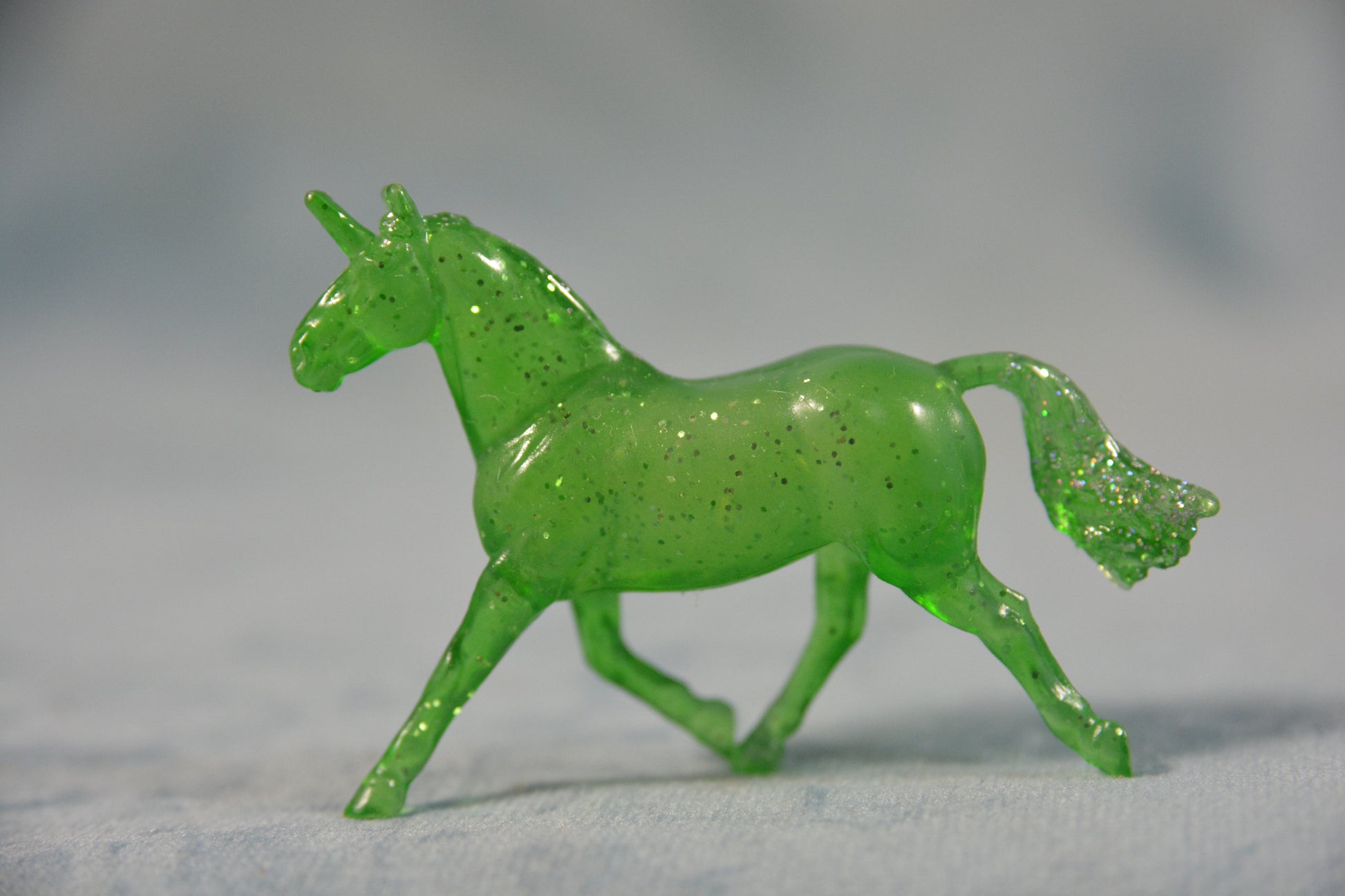 This is a Breyer Mini Whinnie Ballyduff in a green decorator colour. He is a translucent green colour with glitter on his mane and tail. This model was part of the Unicorn Magic Advent calendar which was produced from 2022-2023. This is model number 700723. He is miniature scale and is on the Ballyduff mould.