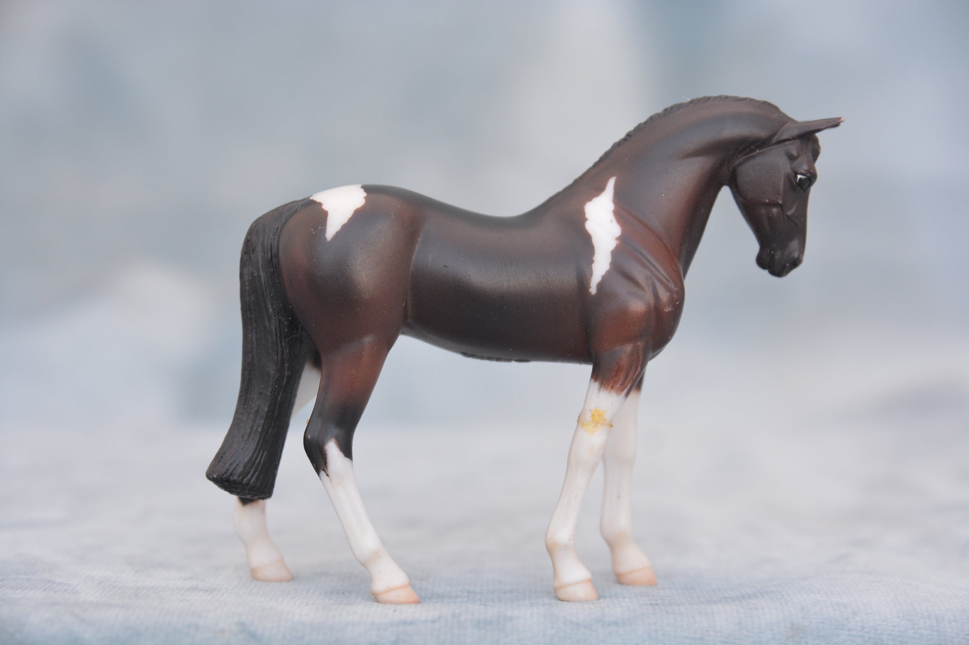This is a Breyer Stablemate British Breed Thoroughbred. This model was produced in 2006 and was part of the British Breed 4-Piece Set. This model is Stablemate scale and is on the G3 Standing Thoroughbred mould. The model is bay pinto in colour.