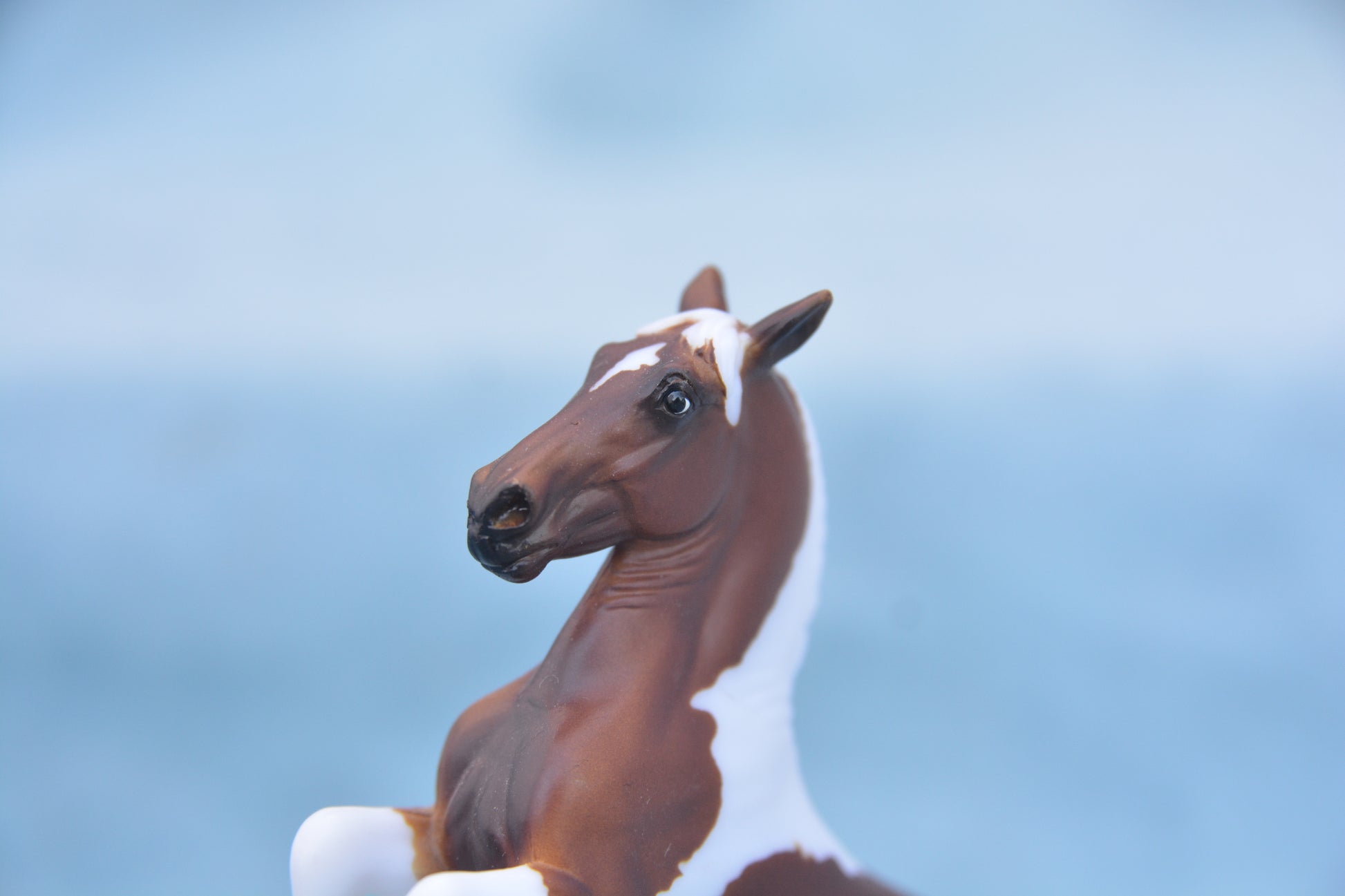 This is a Breyer Stablemate Pinto Lipizzaner. This model was produced from 2021-2024 and was part of the Pintos and Palominos set. This model is Stablemate scale and is on the Lipizzaner mould. The model is bay pinto in colour.