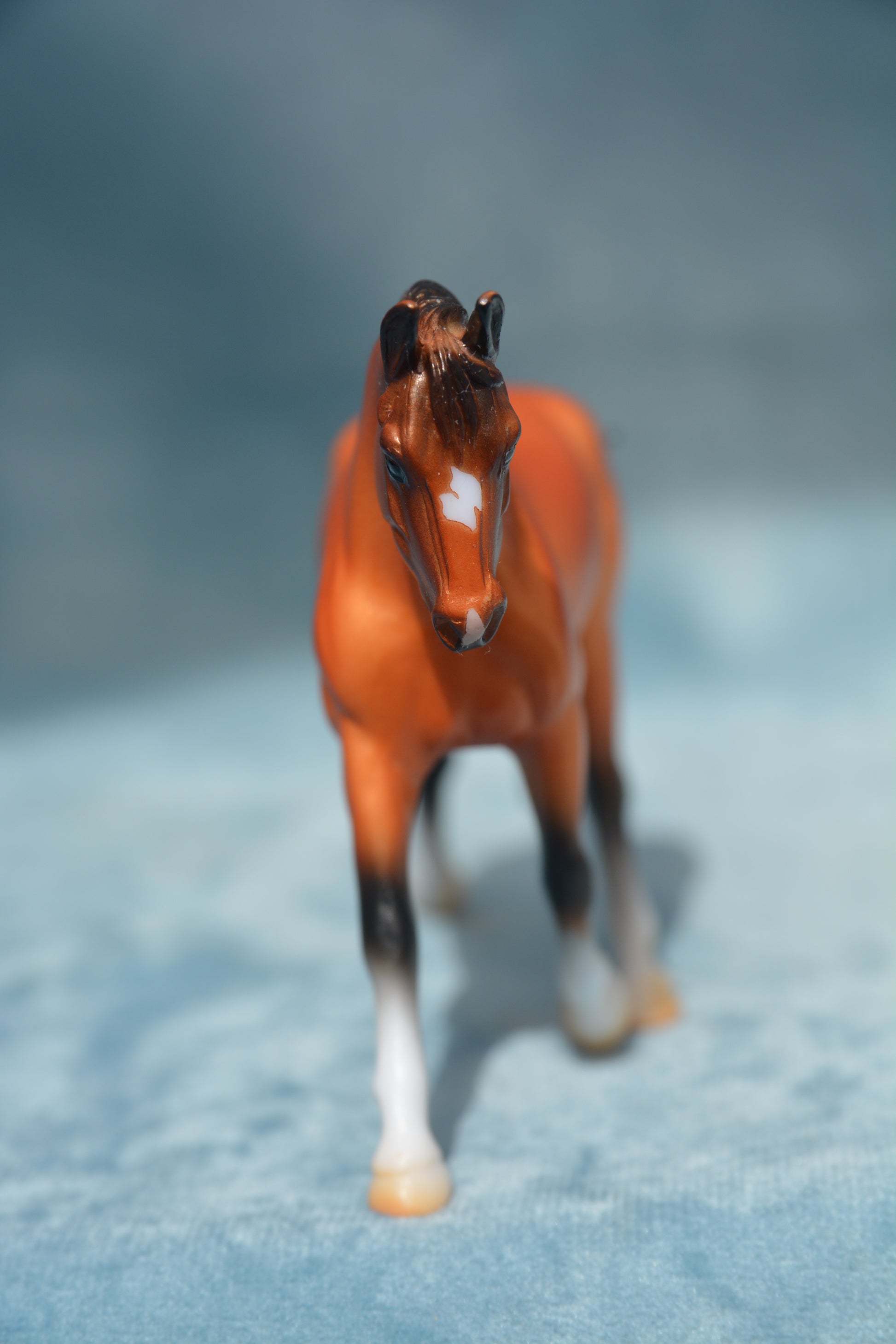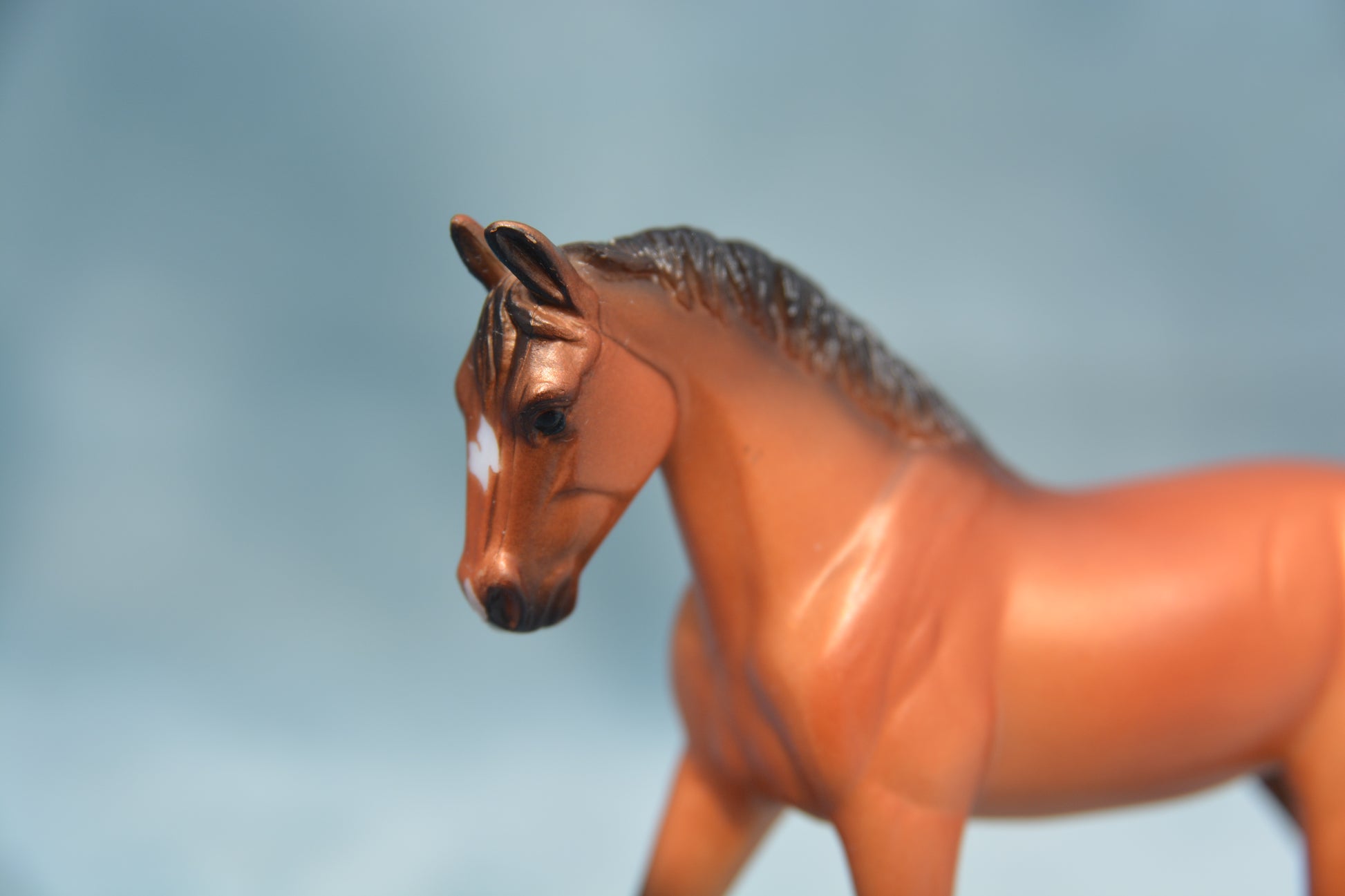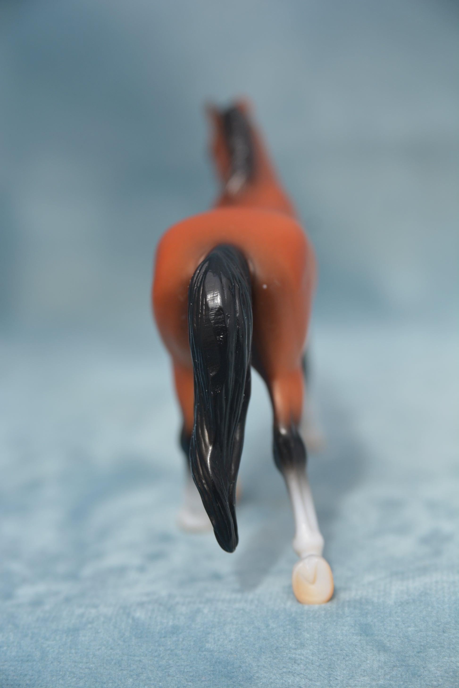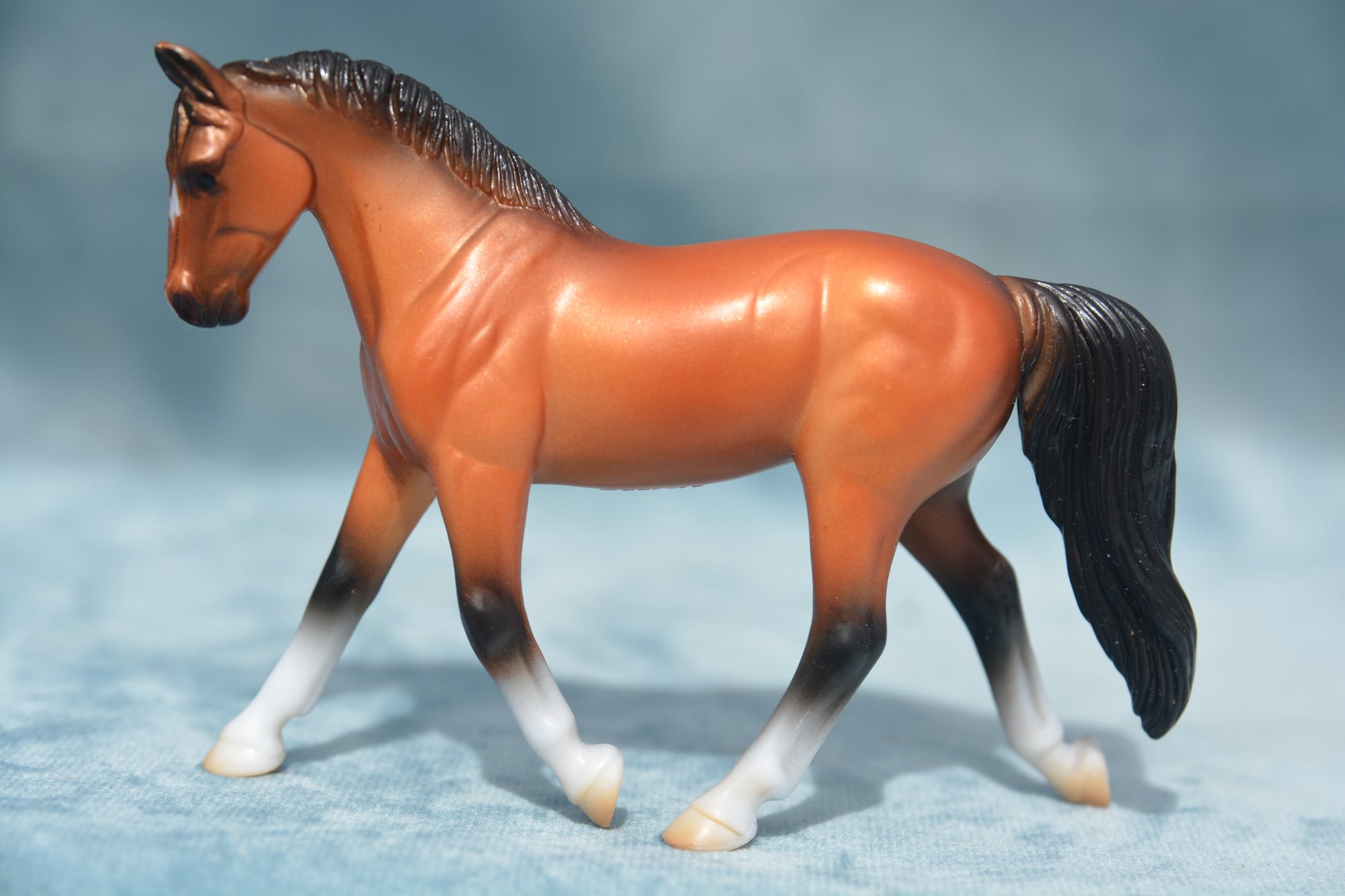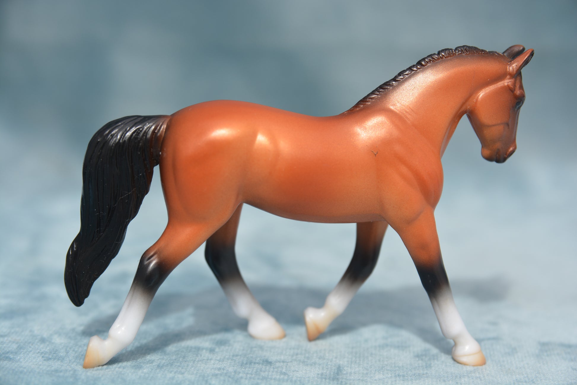 This is a Stablemate scale model horse. This model is the Breyer Stablemate Warmblood. This is model number 6041 and was produced from 2018-2021. She is a solid bay with white markings on the G4 Driving mould.