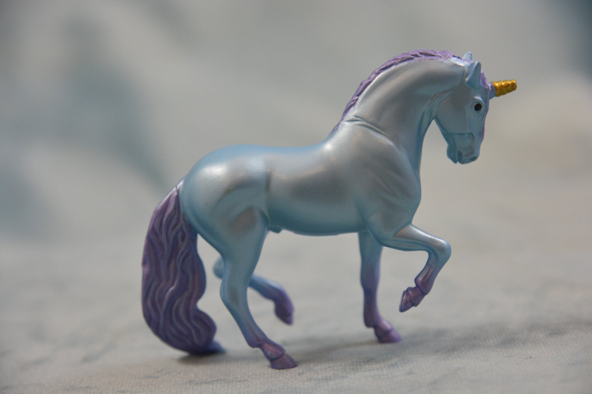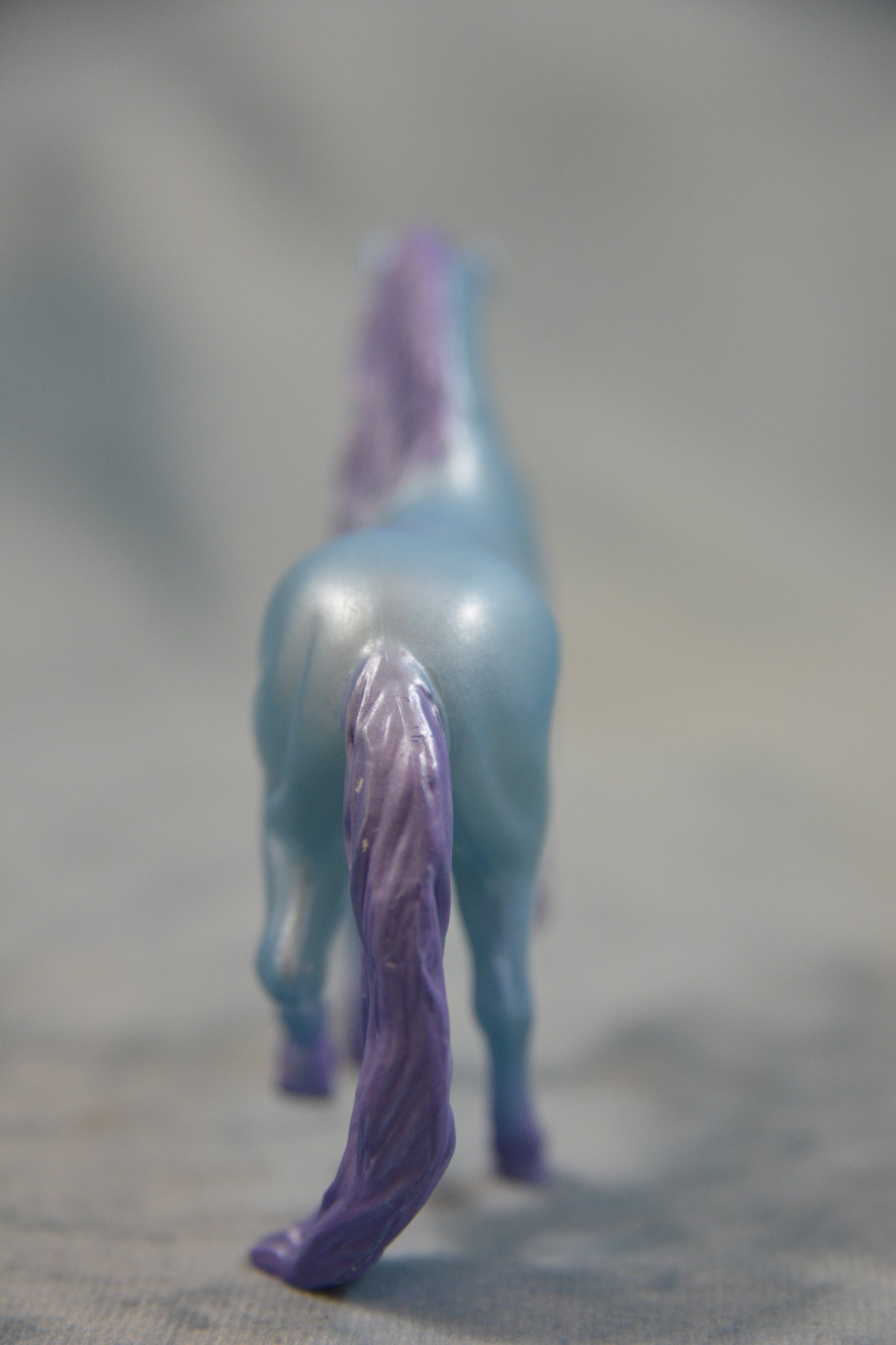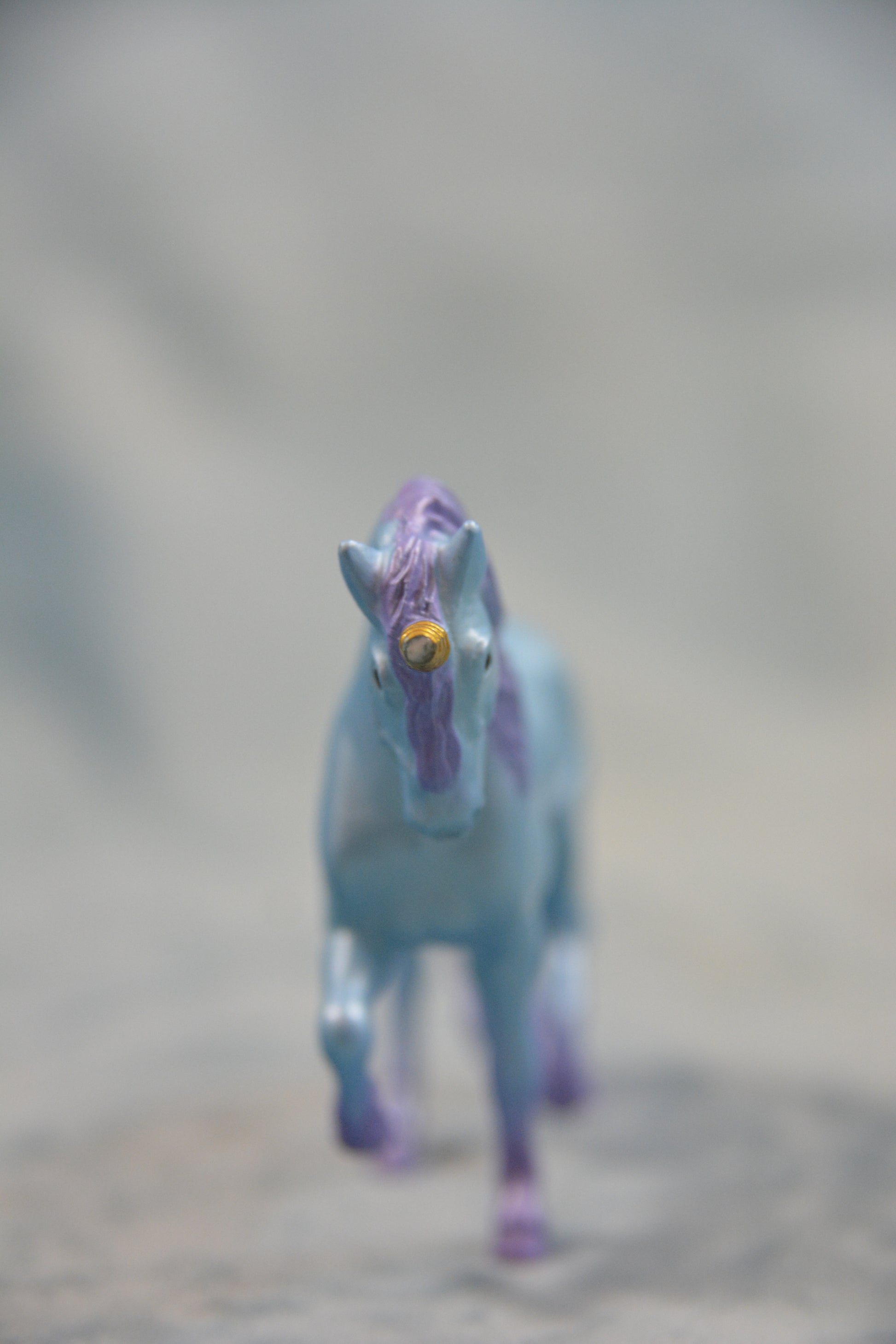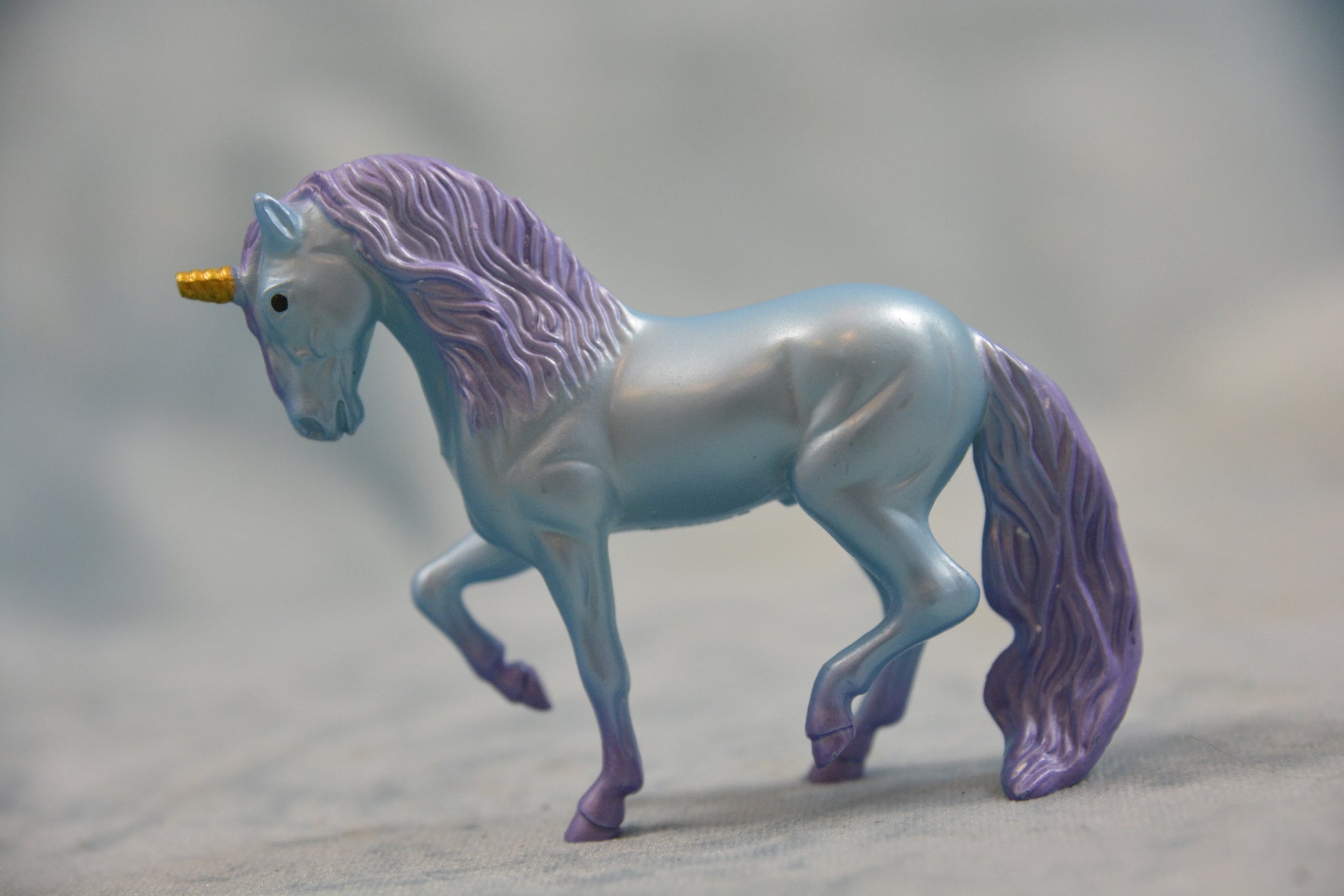 This is a Breyer Stablemate Unicorn. This model is from the Unicorn Magic Wooden Carry Stable. He is a blue colour with a purple mane and tail on the G2 Andalusian mould.