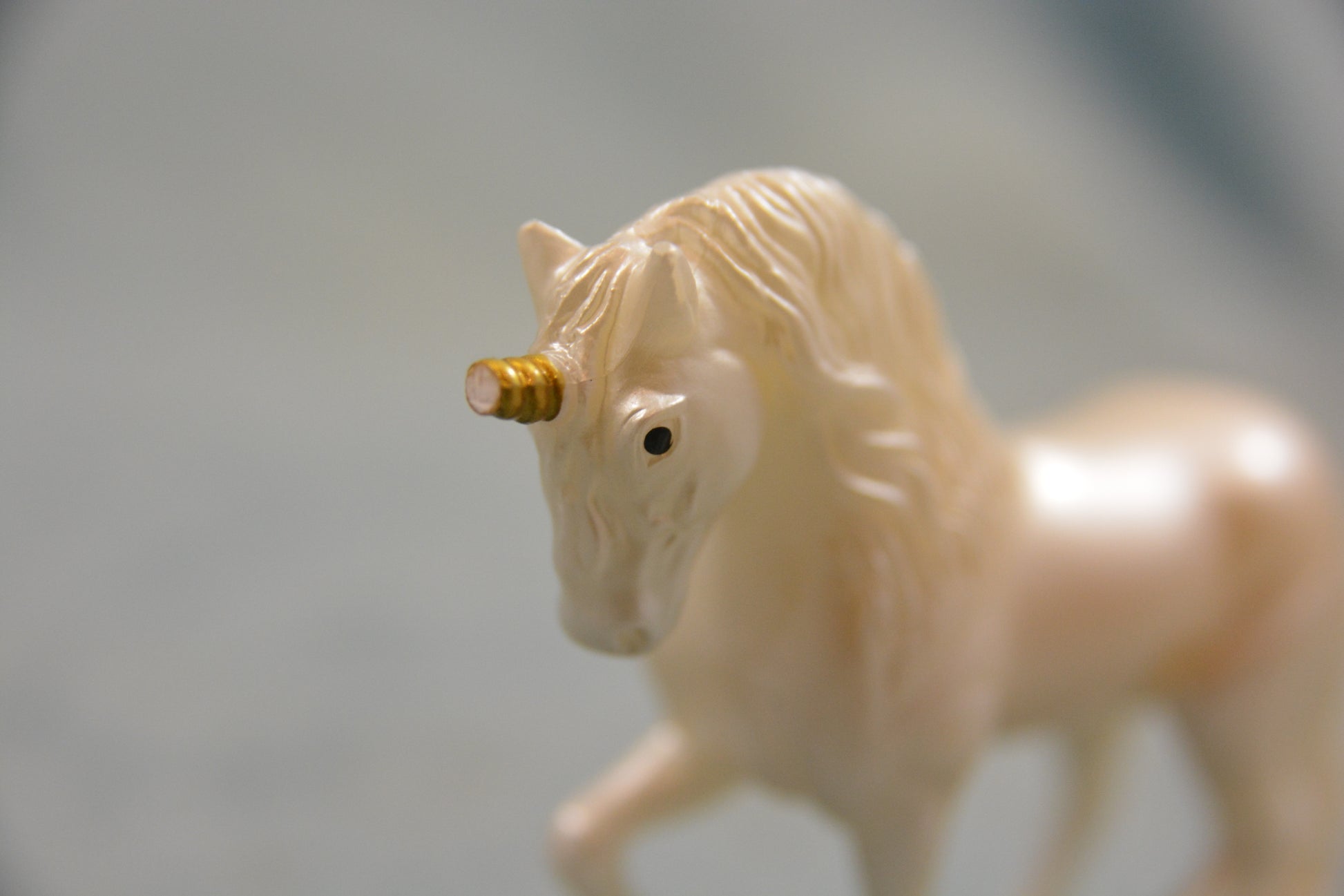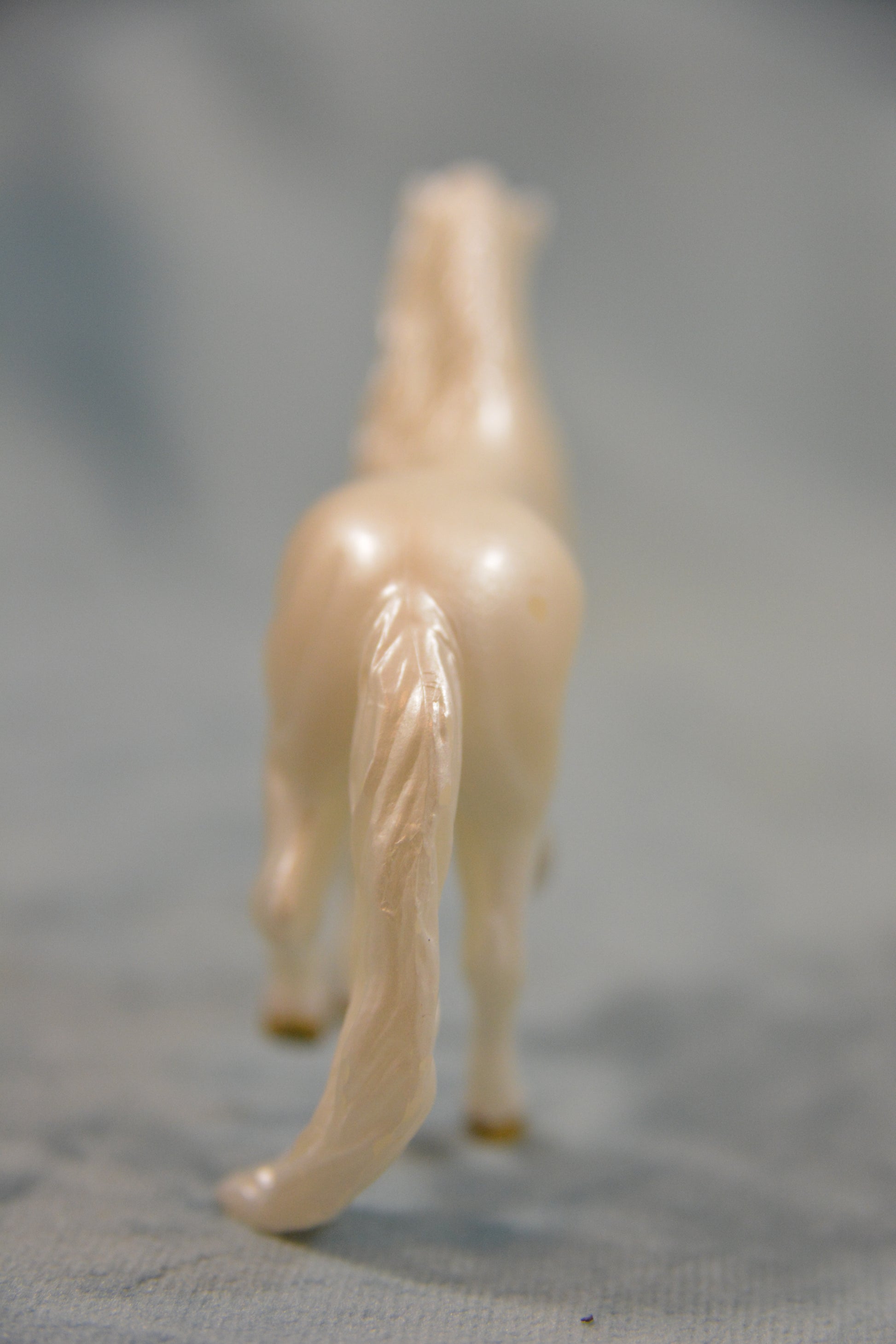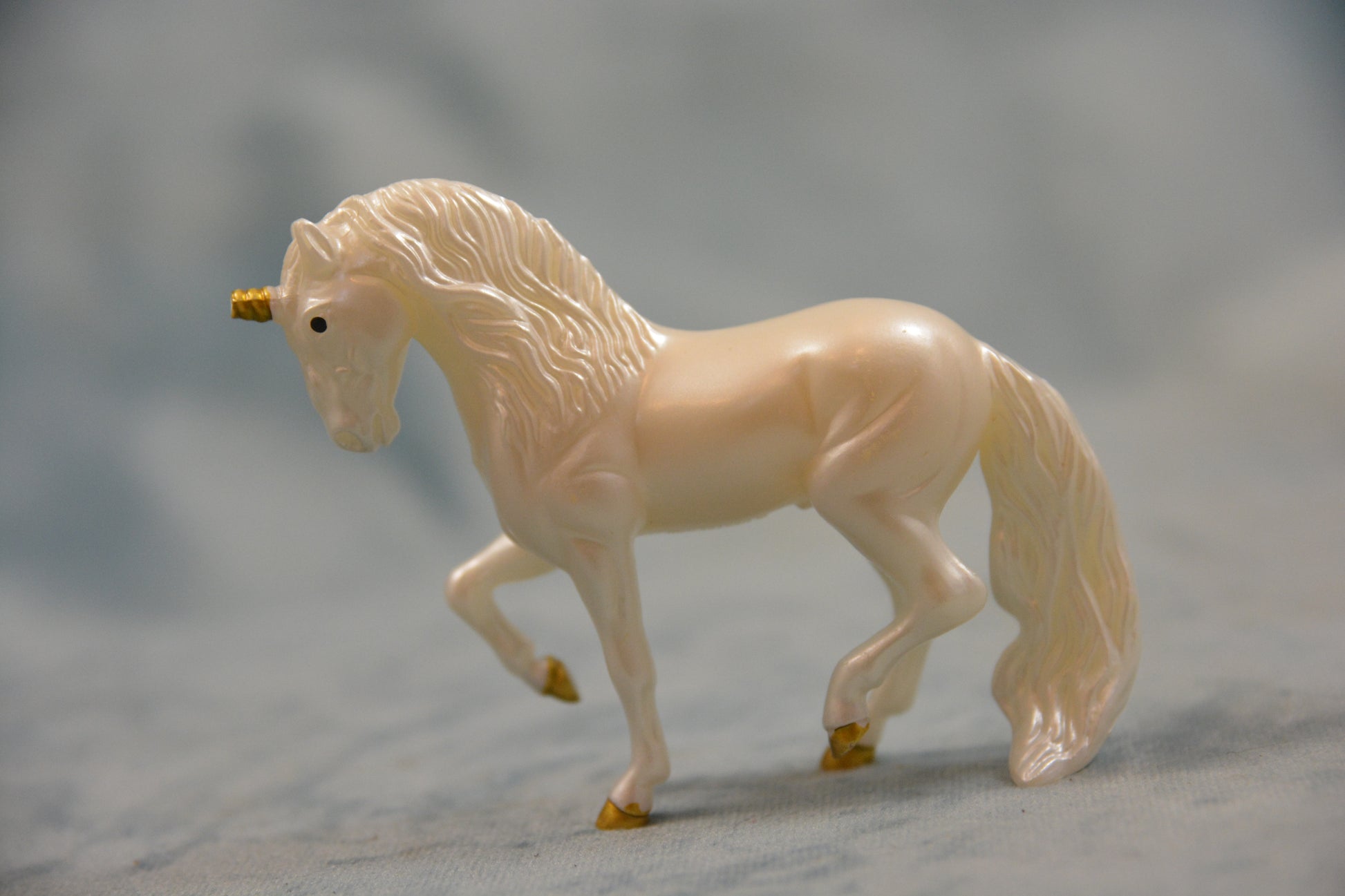 This is a Breyer Stablemate Unicorn. This model is from the Unicorn Magic Wooden Carry Stable. He is a light beige colour on the G2 Andalusian mould.