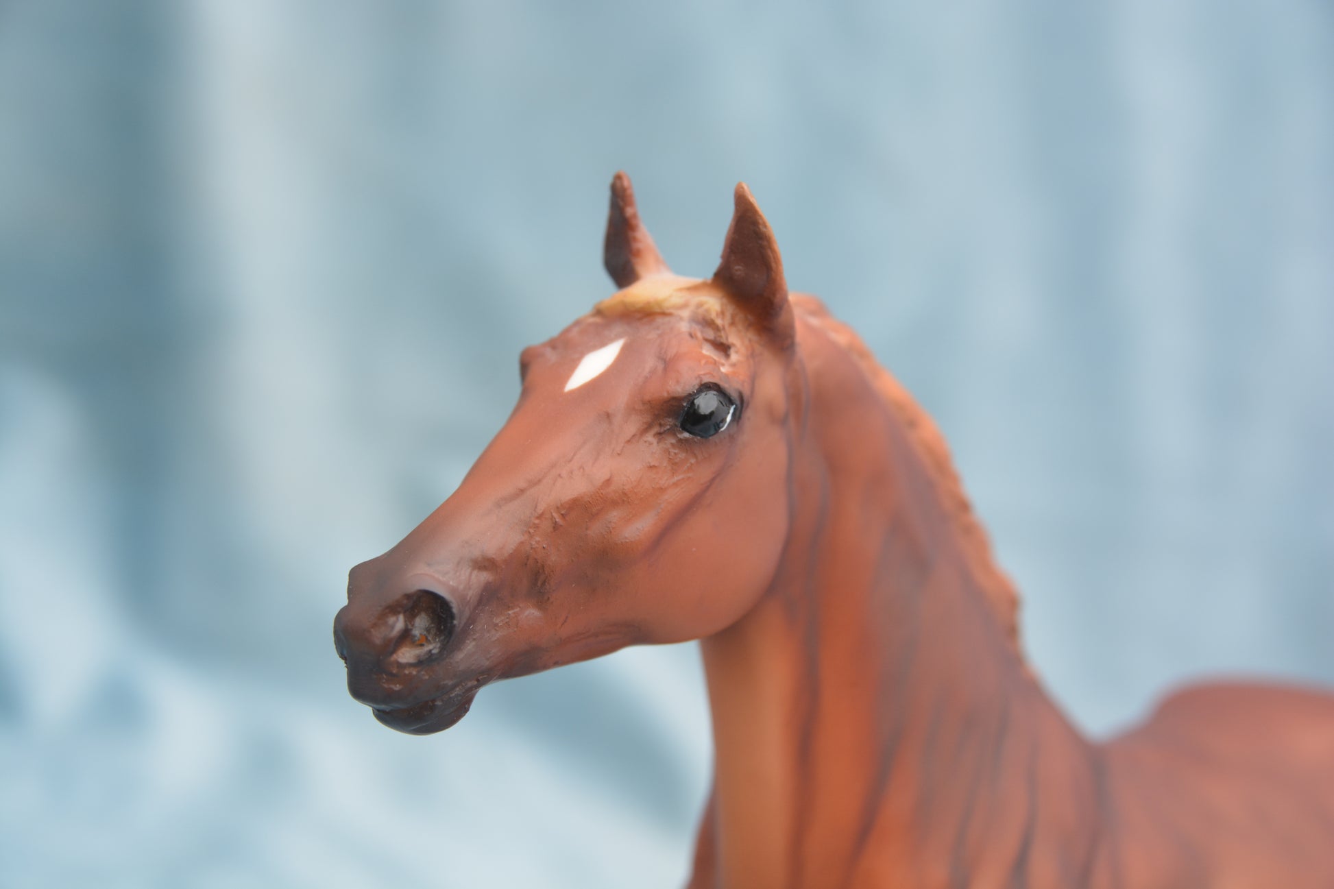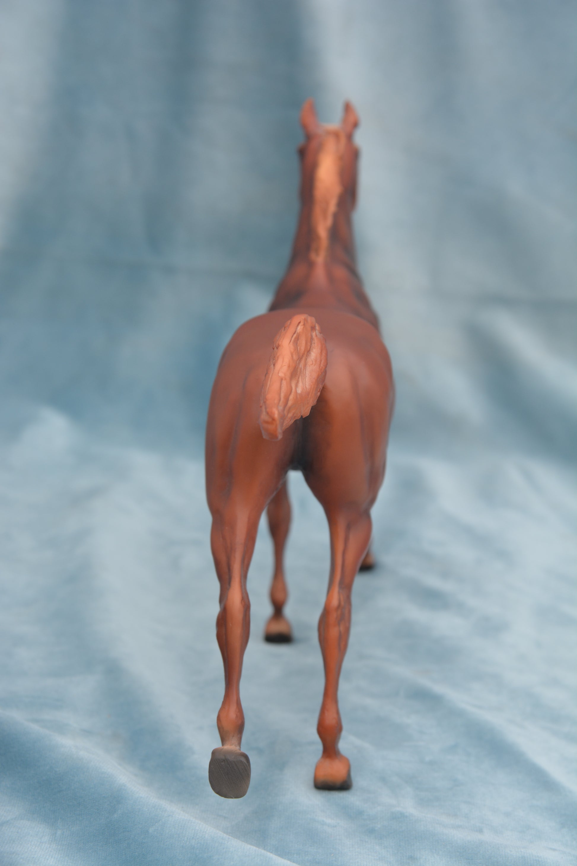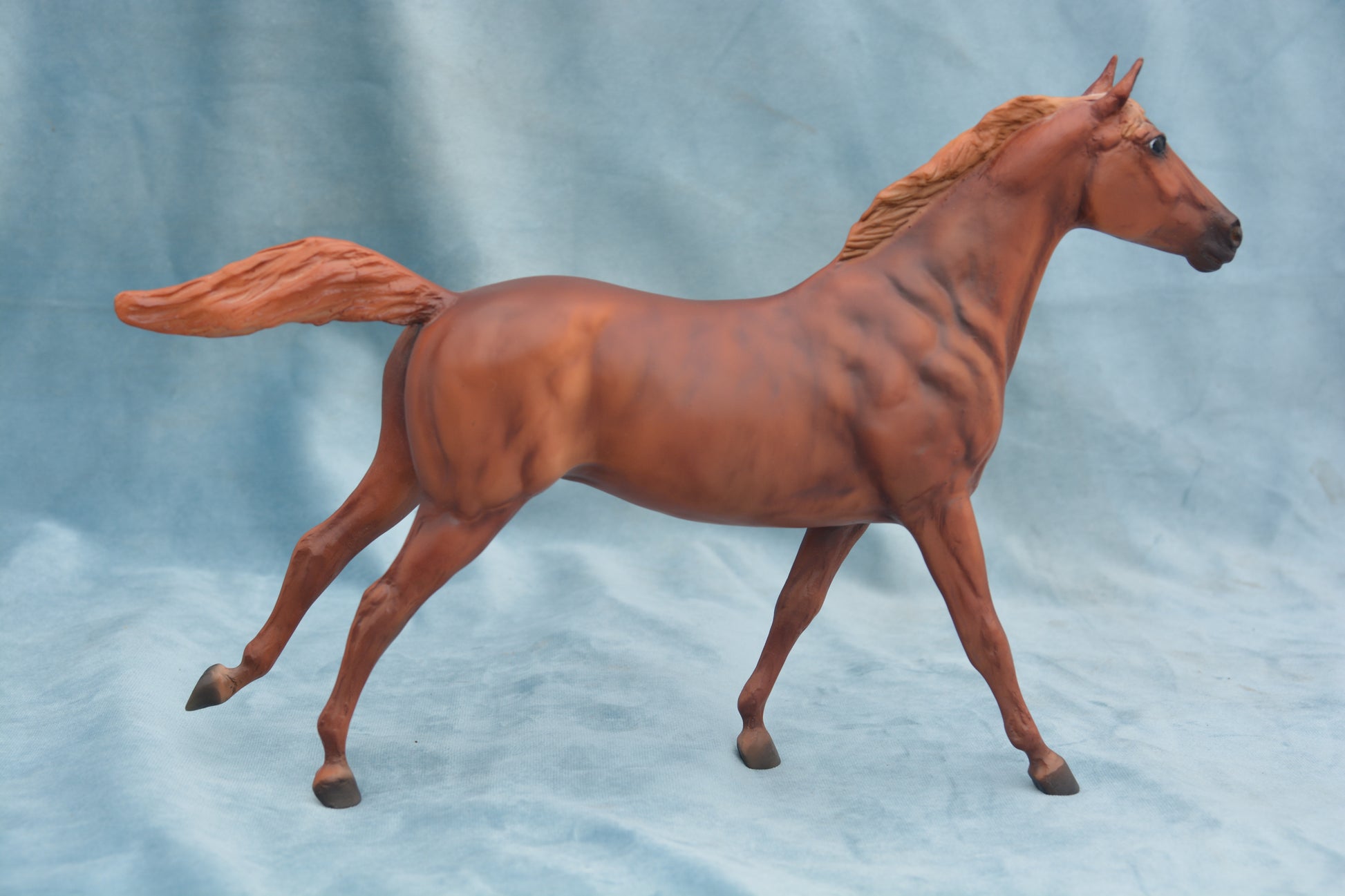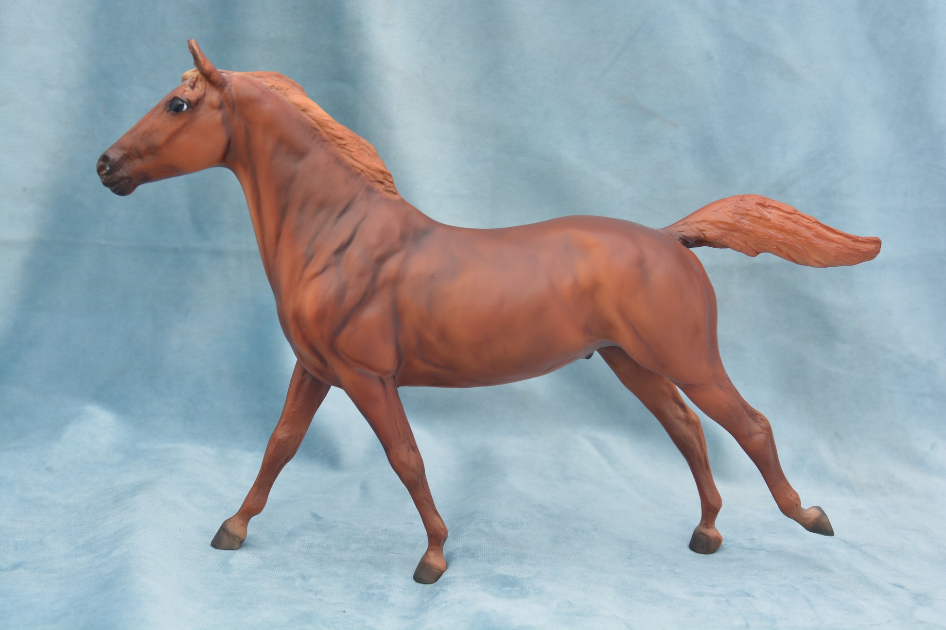 This is a Traditional scale model horse. This is a Breyer Traditional Theodore O' Connor (Teddy). This is a regular run Breyer Traditional that was produced from 2008-2009. This is model number 1330 and is Traditional scale. He is chestnut in colour and is on the Phar Lap mould.