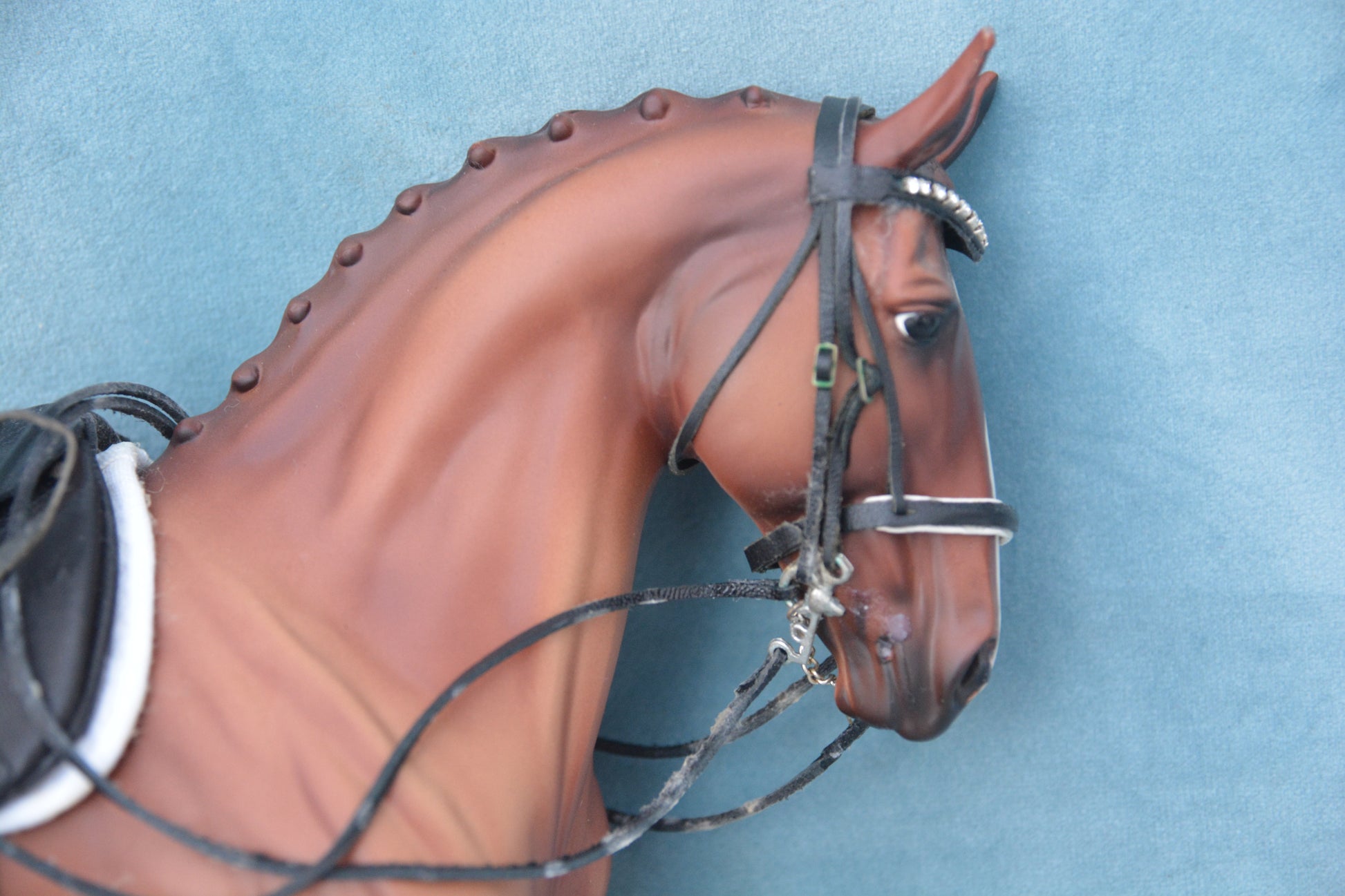 He comes with a custom made Traditional scale Dressage tack set. This includes a beautiful bridle with diamante browband and a dressage saddle.