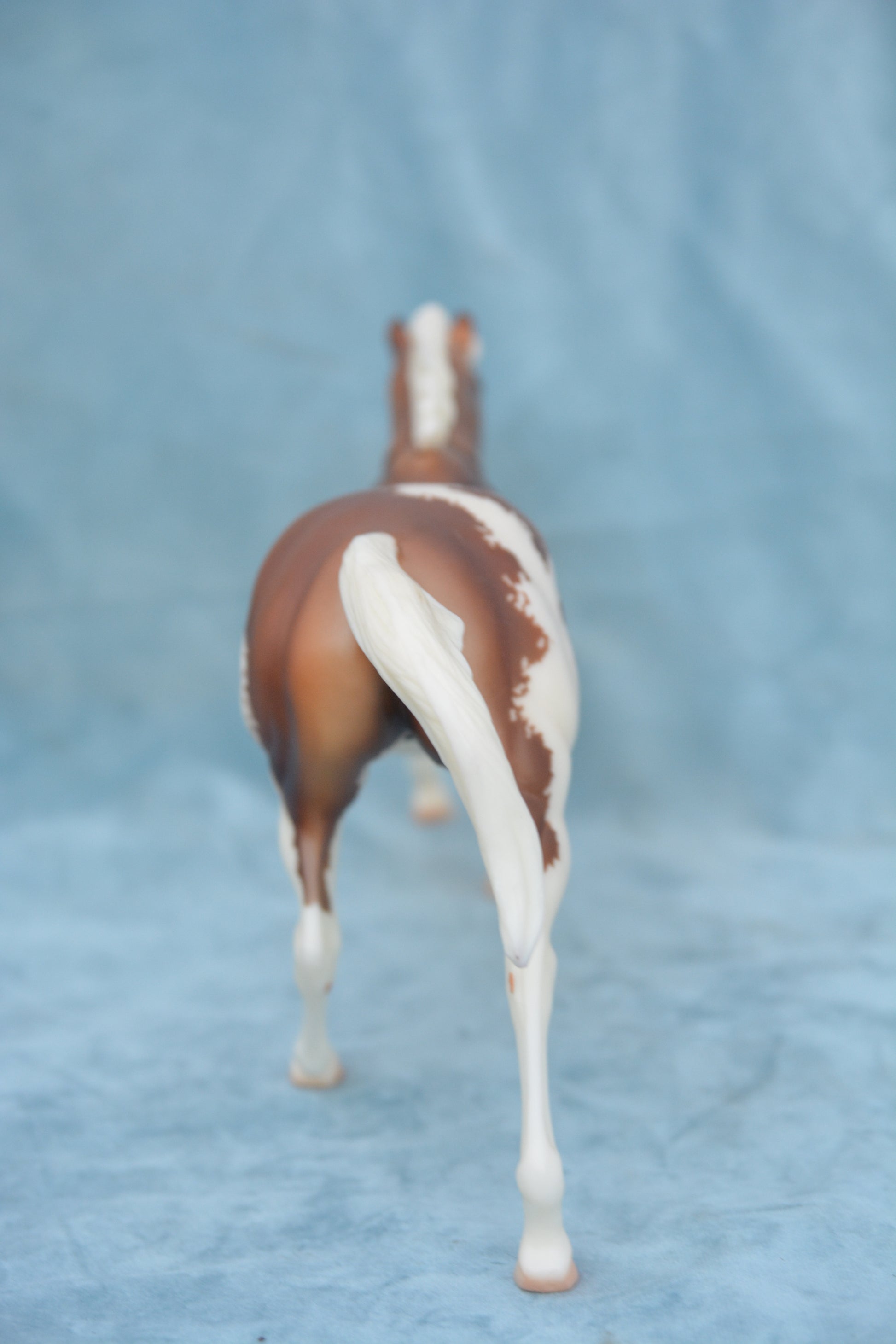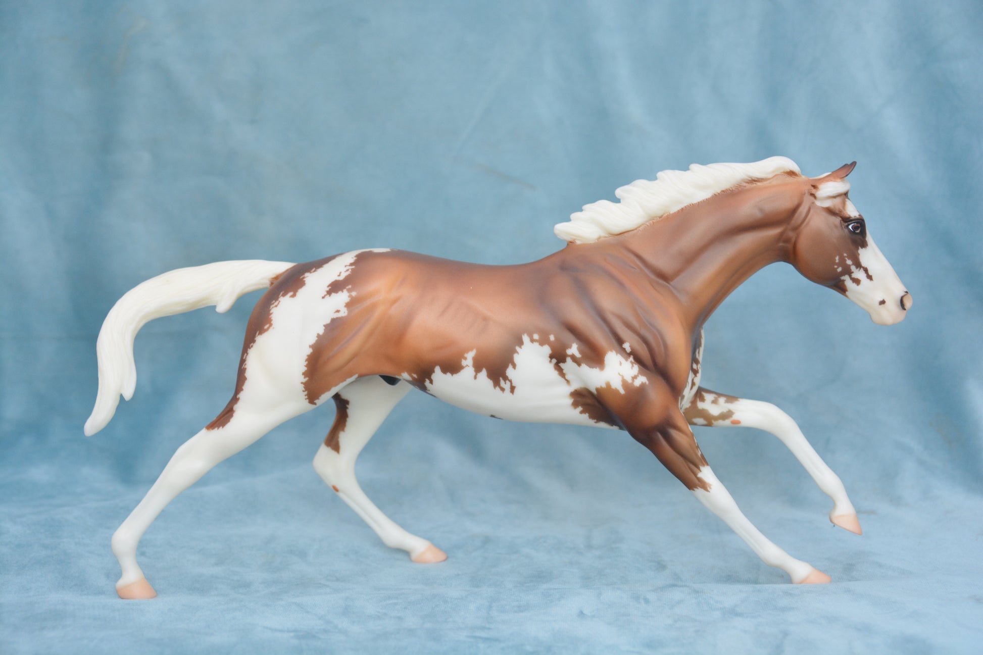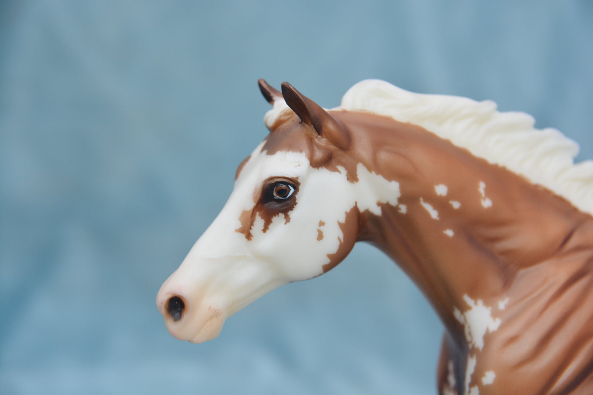 This is a Breyer Sato. This model was produced from 2011-2012. This model is Traditional scale and was produced by Breyer Horses. He is on the Cigar mould. He is palomino sabino in colour.