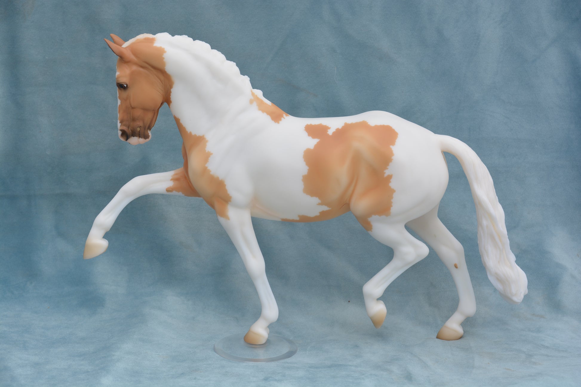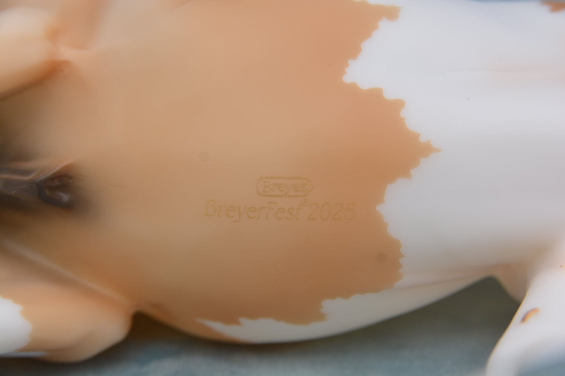This model is in good condition. He is a lovely palomino pinto colour and has BreyerFest 2025 on his belly (although Breyer should probably have gone for a different colour choice)!