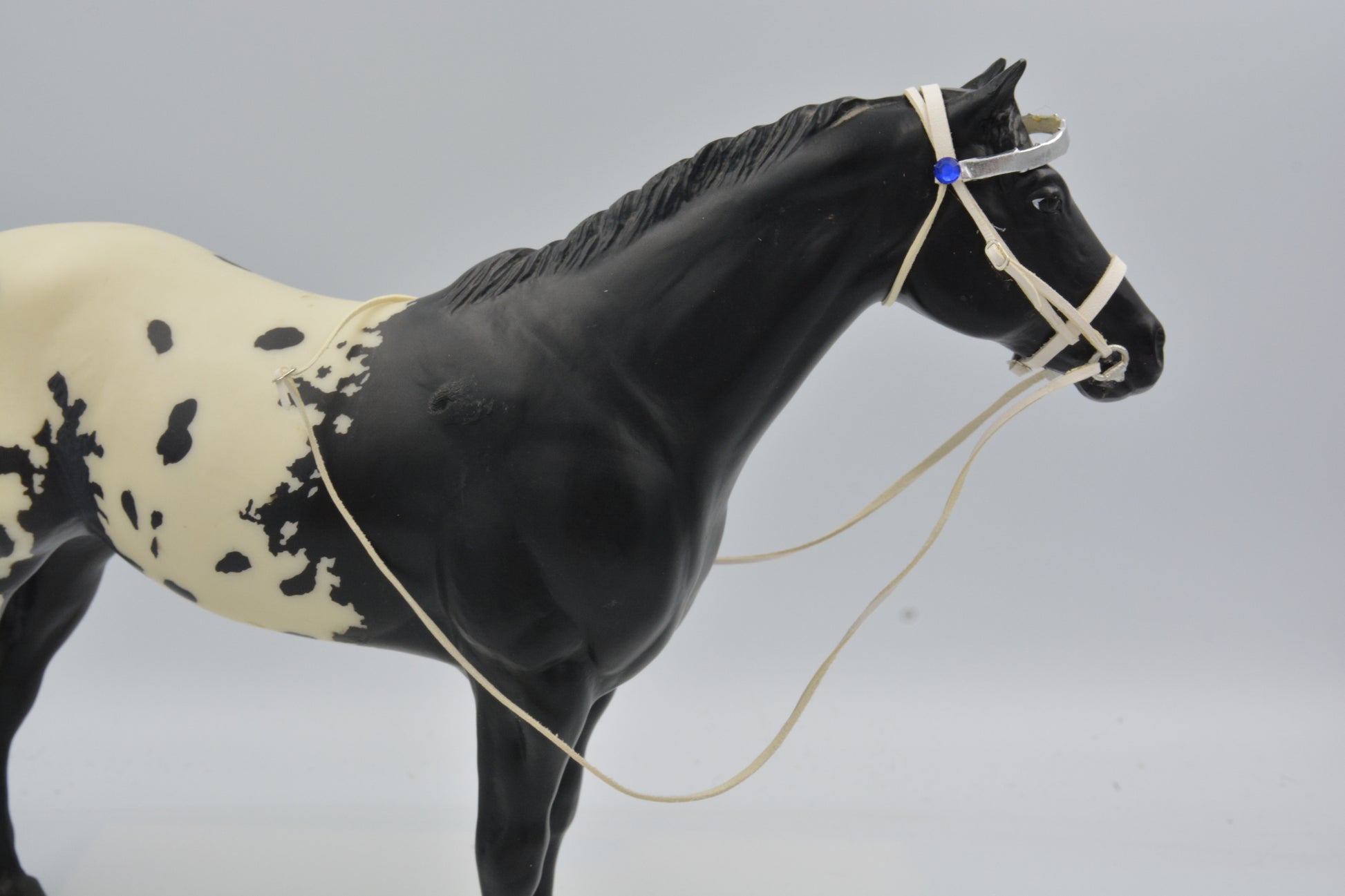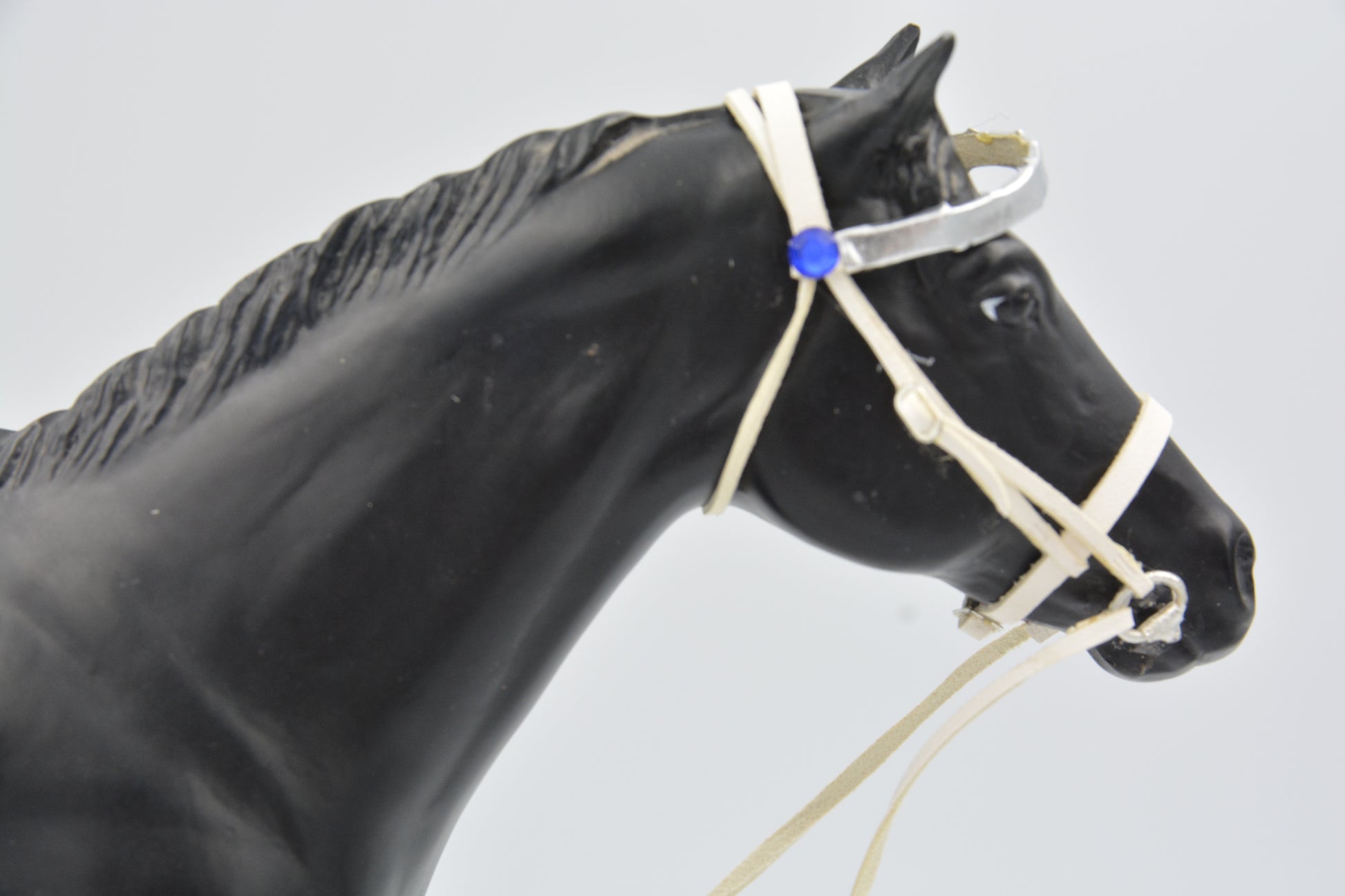 This bridle has been made from white kangaroo leather and has silver hardware. It has a realistic cast silver snaffle bit. It has a cavesson noseband and adjustable slip buckles. It should fit most Traditional scale Breyer models. It has a decorated silver browband with blue gems on either side.