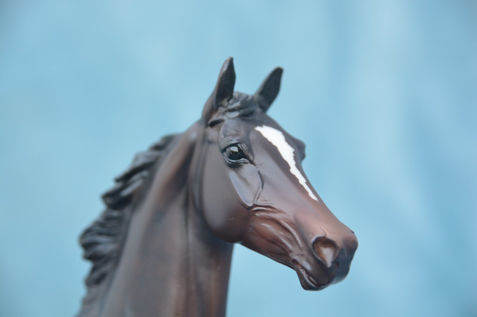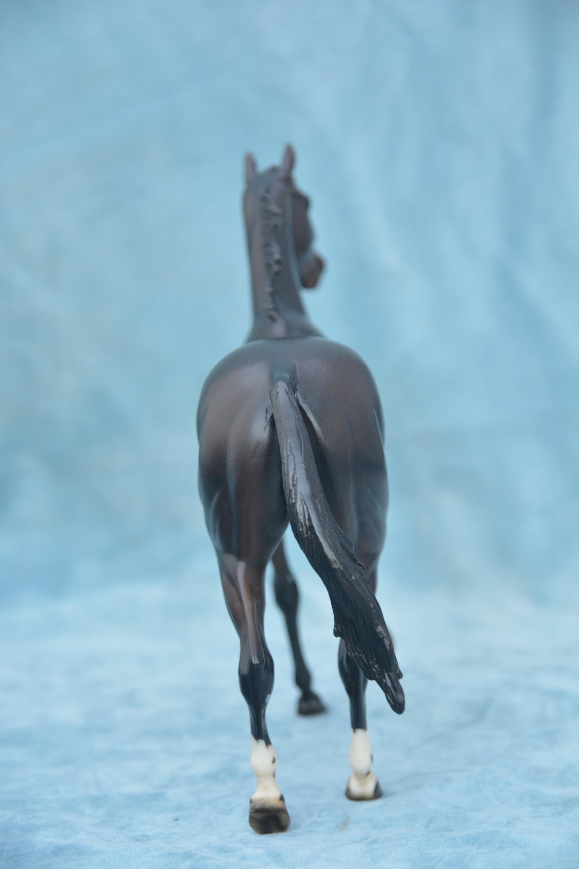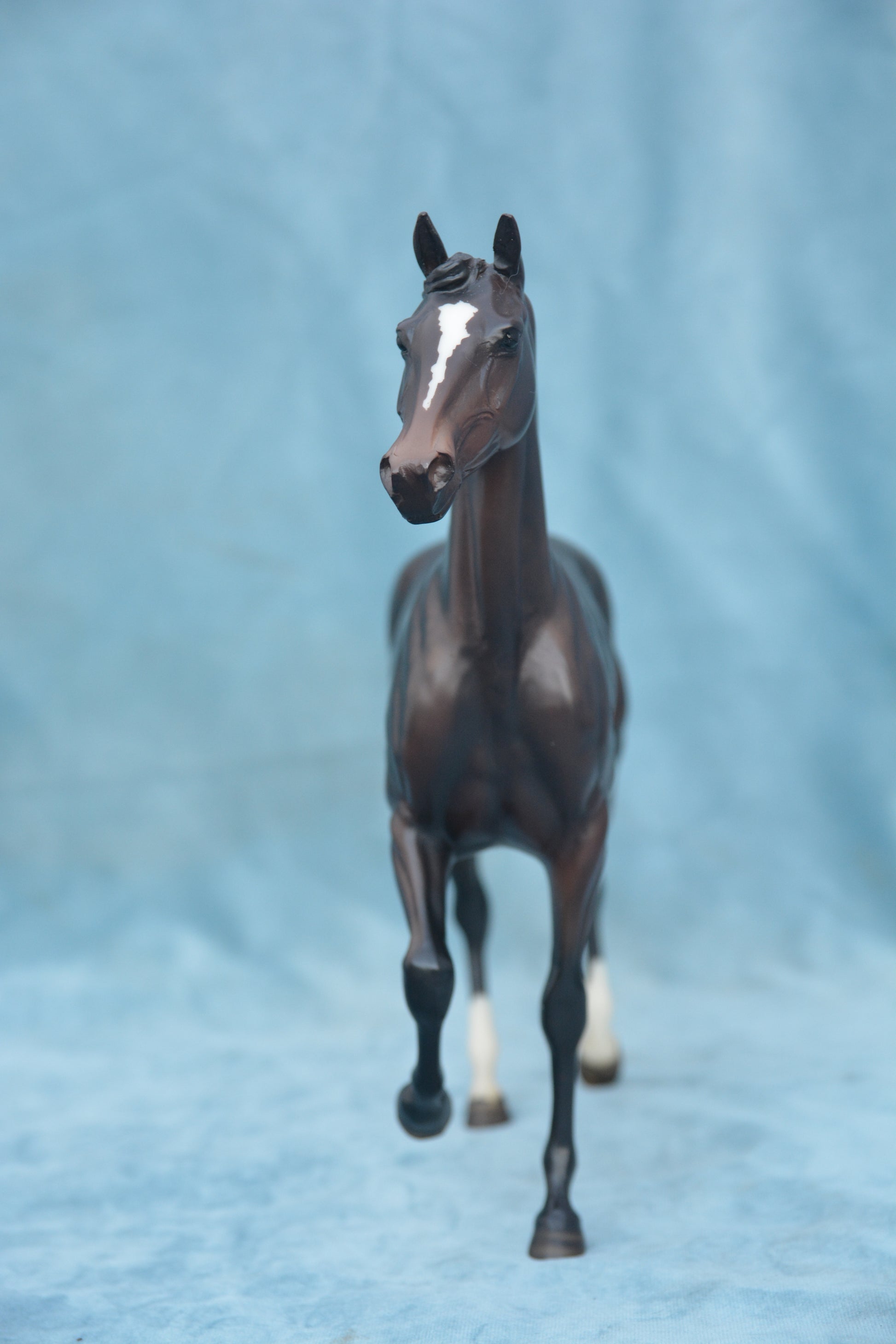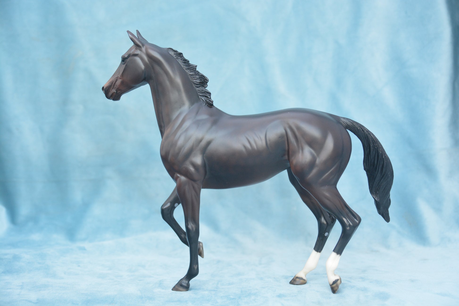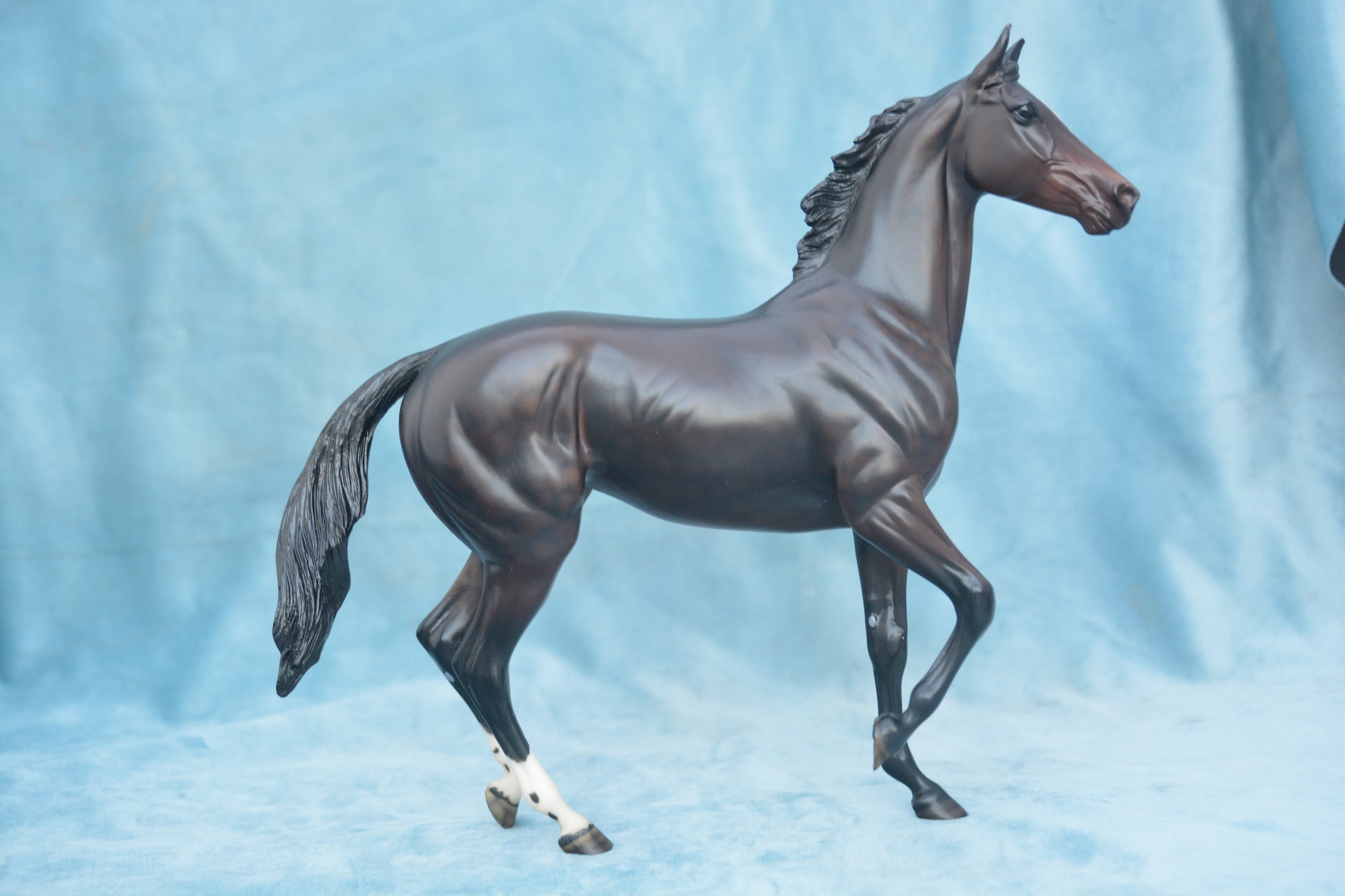 This is a Breyer Zenyatta. This model was produced from 2010-2015. This model is Traditional scale and was produced by Breyer Horses. He is on the Lonesome Glory mould. He is bay in colour.